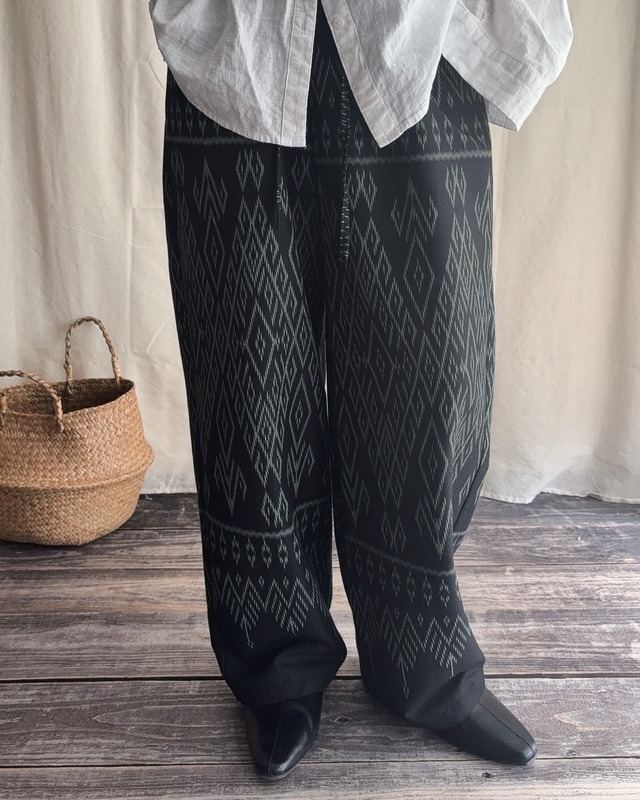 手織りのシルクコットン生地をパンツに仕立てられてます。 メンズレディースユニセックス 一つ一つ手織りで丁寧におられた肌触り良いシルクコットン生地がたまらない。 ウエストはゴムになります
