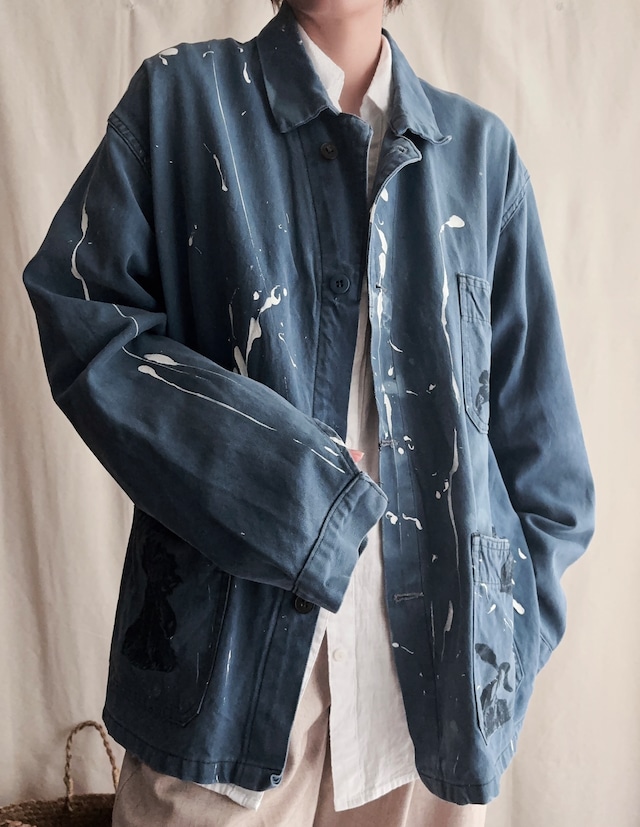 ヴィンテージジャケットに手彫りの版がプリントされてます ハンドペイントリメイクとかね合わせております。