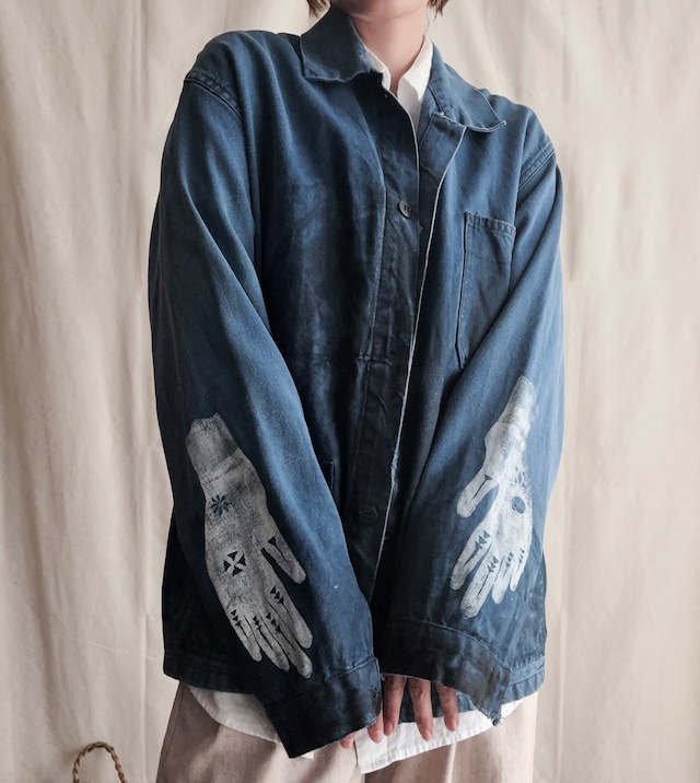 ヴィンテージジャケットに手染め加工され、手彫りの版がプリントされてます 沖縄の昔の女性が手に彫っていたタトゥーをハヂチと言い、その手をプリントしております。 背中には上弦の三日月をプリントしております。目標を達成をする力をくれると言われております。
