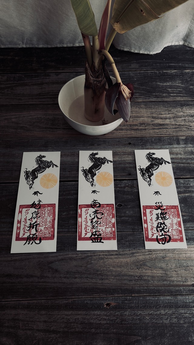 来年は馬年ですね⭐︎沖縄にちなんだ物を手彫りした版画でプリントしてますmuiです。 馬年の健康祈願、災難除守、商売繁盛を硬紙に作成しました⭐︎ 彫った馬は琉球王国時代の仲田青毛という名馬を元にしてます。 生前は手に負えない暴れ馬だったが、死後その地に葬られると、不思議なことに、どんな荒れた馬でも墓のそばでは嘘のようにおとなしくなったらしく。死んでも威厳を放つ存在だったそうです。 仲田青毛は気性が荒く、首里に引き取られてからも城の石垣を跳び越えるほどの暴れぶりで。 運動神経が抜群すぎて、噂が薩摩藩にまで届き、島津公に献上されました。 ですが、薩摩でも誰一人乗りこなせず、困り果てた末、元の飼い主である仲田家の次男・仲田親雲上が呼び寄せられ。 すると仲田青毛は嘘のように落ち着き、軽やかに走りました。 その光景に、面目を失った馬術指南役は密かに落とし穴を掘り、ヤリのように尖った竹やぶを設置する罠を仕掛けて、走る用に命じて2人もろとも亡くなるように仕向けたんです。 だが仲田青毛は、地面のわずかな異変を感じ取り、命懸けの落とし穴を見事に跳び越えた。その姿は少しほくそ笑むような顔をしていたという こうして無事に琉球へ戻り、青毛は最期まで力強く走り続けたと伝えられている。 暴れ馬にして名馬、その伝説は今も静かに語り継がれているそうです。 馬の下の文字は天人文字という琉球時代に神様が残していったという十二支の文字の中の馬の文字です⭐︎ 馬の下の丸いハンコは太陽⭐︎を表してます 困難を乗り越えた先は明るいという意味を 琉球王国の版画も押してます⭐︎ .
