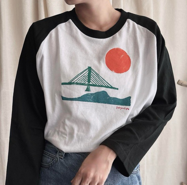 ラグランシャツに作家手彫りの版画でプリントされてる海中道路のヴィンテージテイストデザイン⭐︎ モデル一回着用のみ 七分袖になります メンズLサイズでレディースはオーバーサイズになります