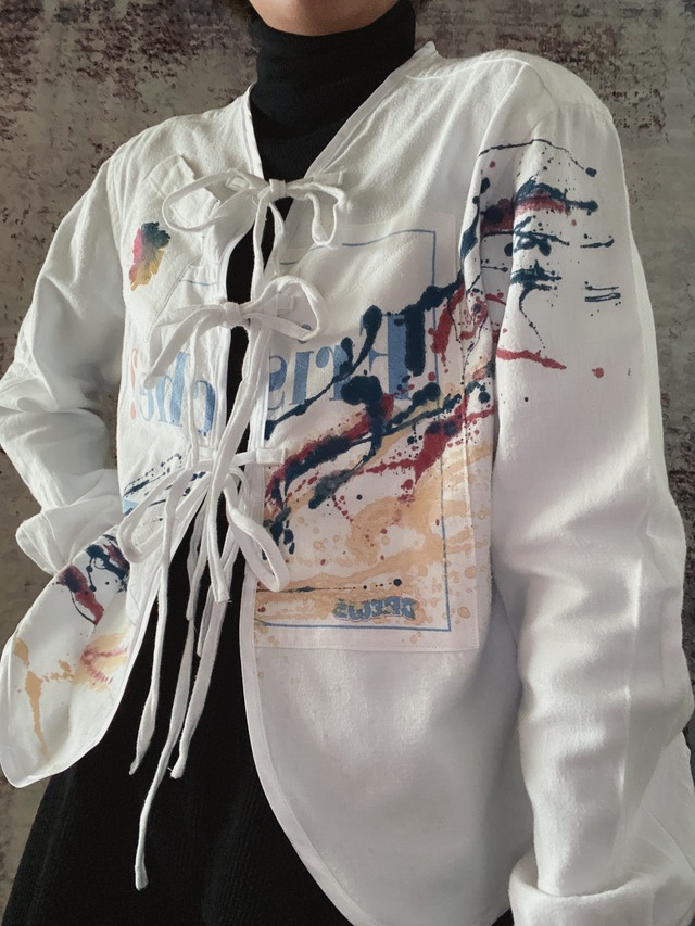 NO.64 コットン 古着 リボン オーバーサイズ パフスリーブ 羽織り 総柄 シャツ 白 ホワイト