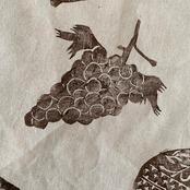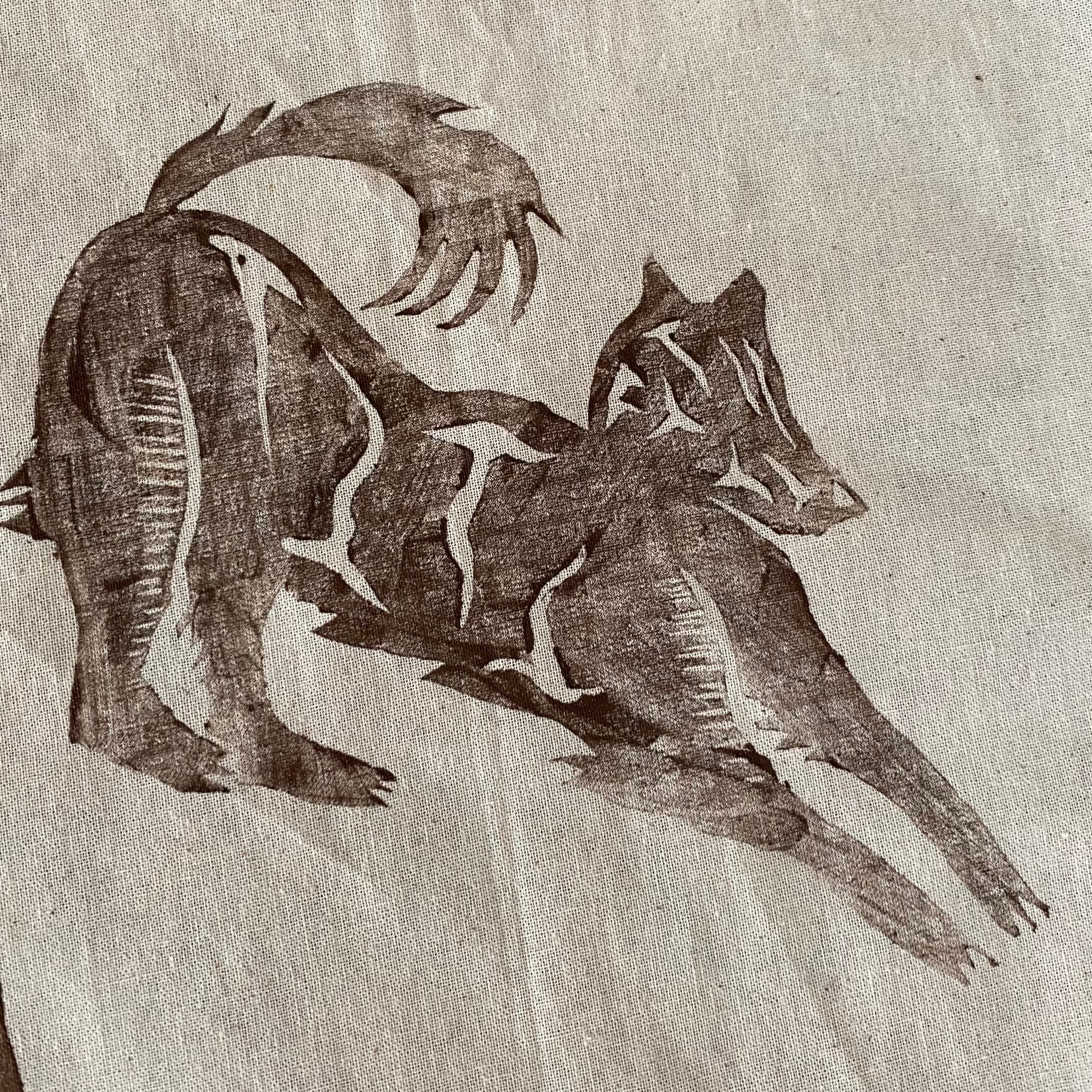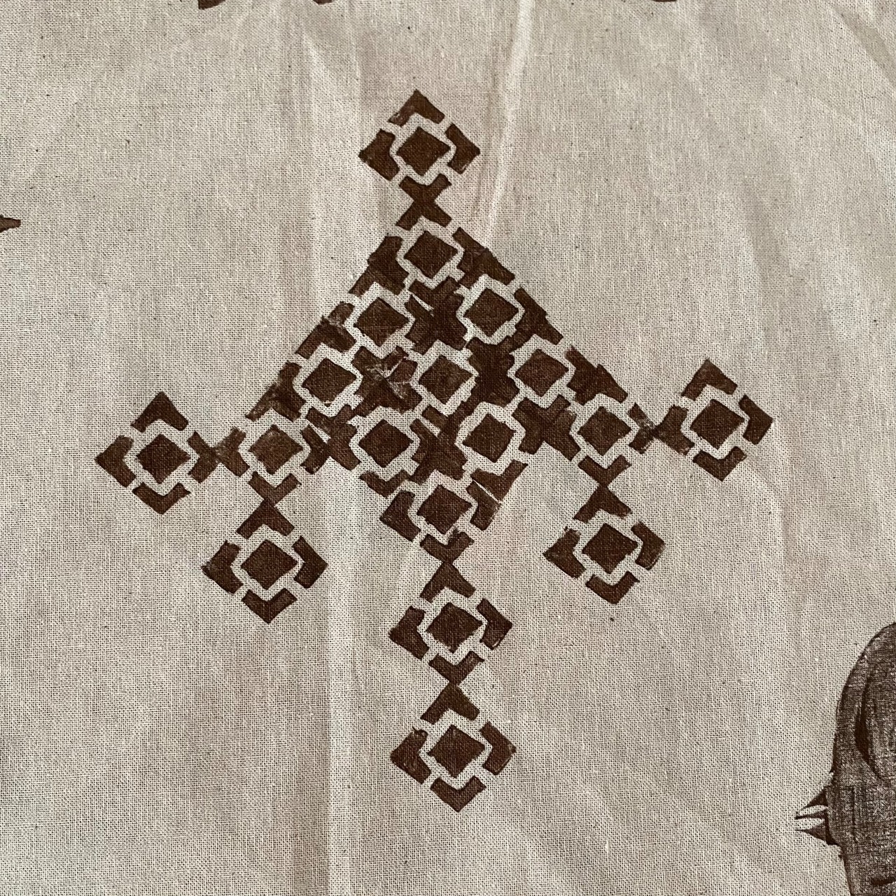 ◉端っこに押されている月の満ち欠けのブロックプリントを囲むように押されてる版は、琉球時代のハヂチと言って、タトゥーになります