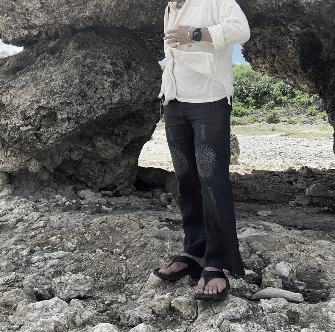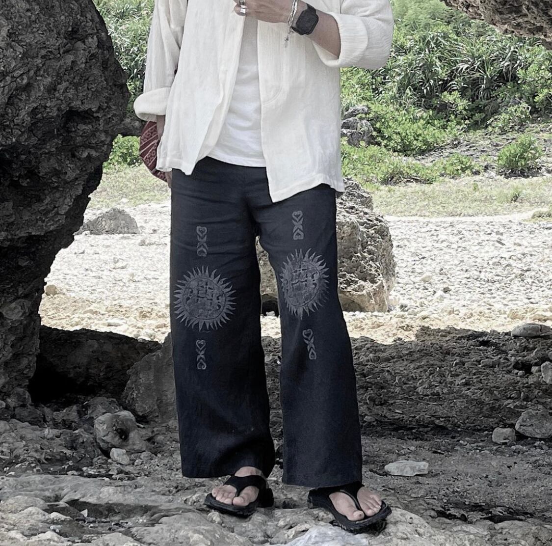 沖縄の植物や動物、古陶、昔の沖縄の女性が成人としての証として入れていたハヂチと呼ばれるタトゥーなどをモチーフに一点一点ハンドプリントでされてる作家さんになります