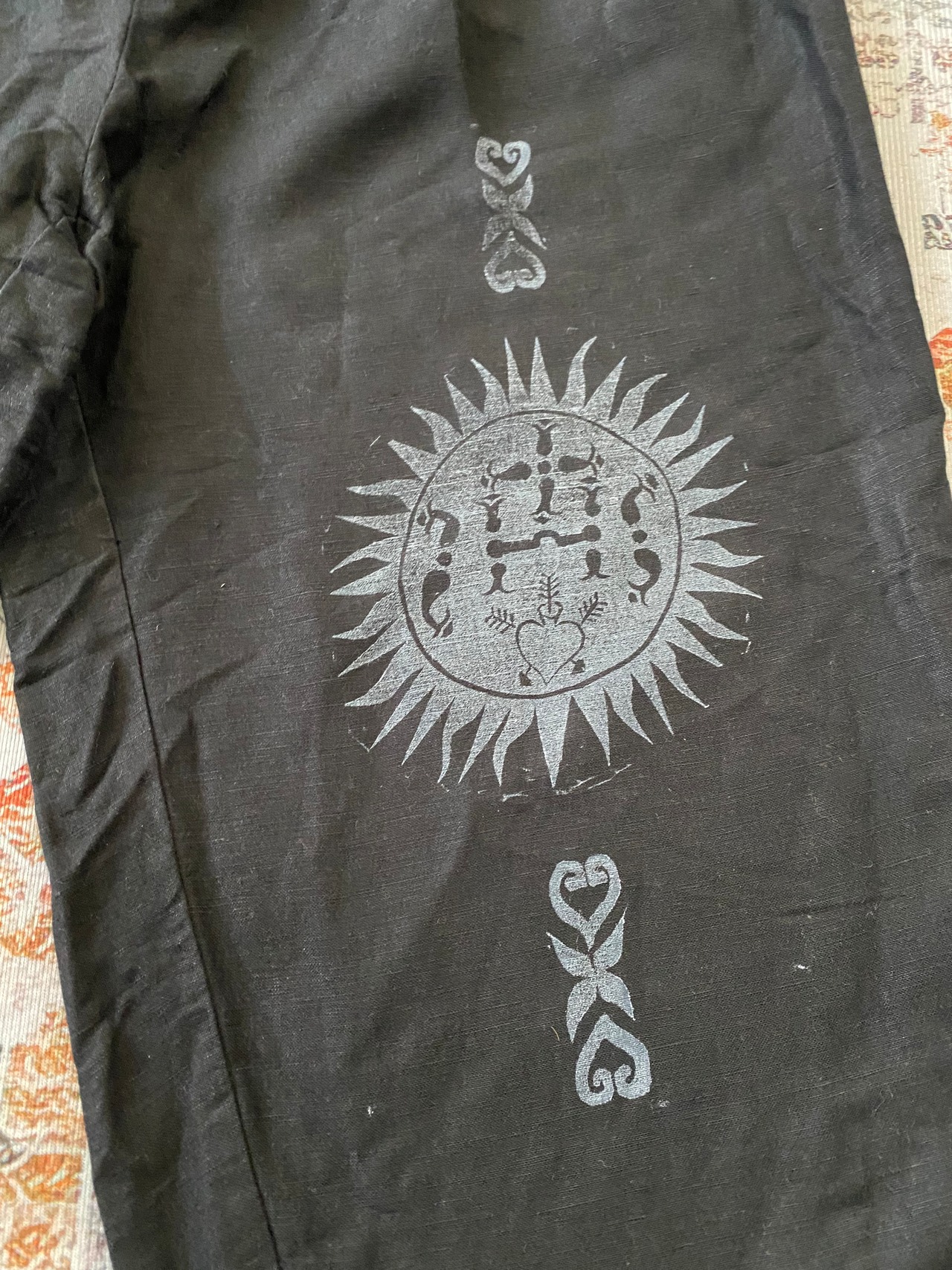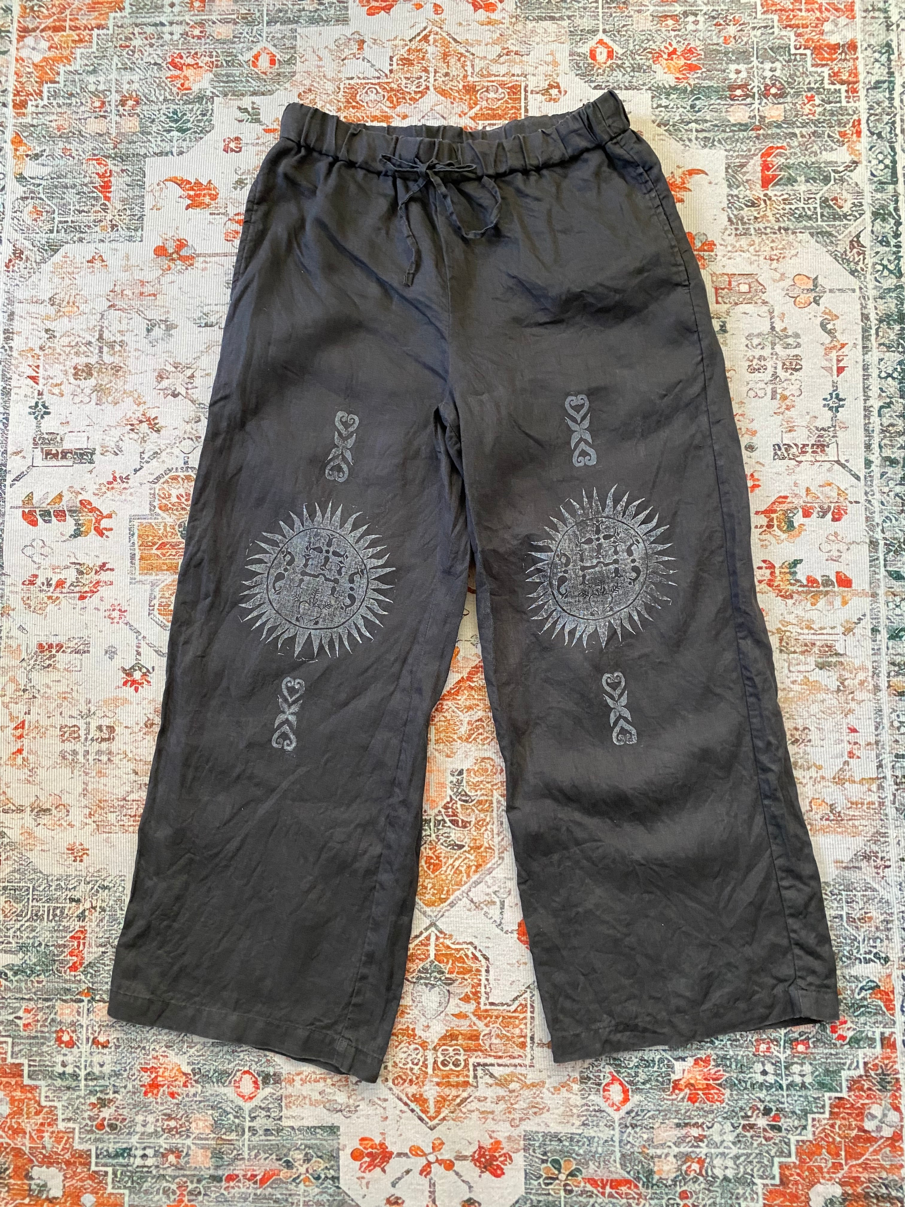No.711麻リネンパンツメンズレディース古着ブロックプリント