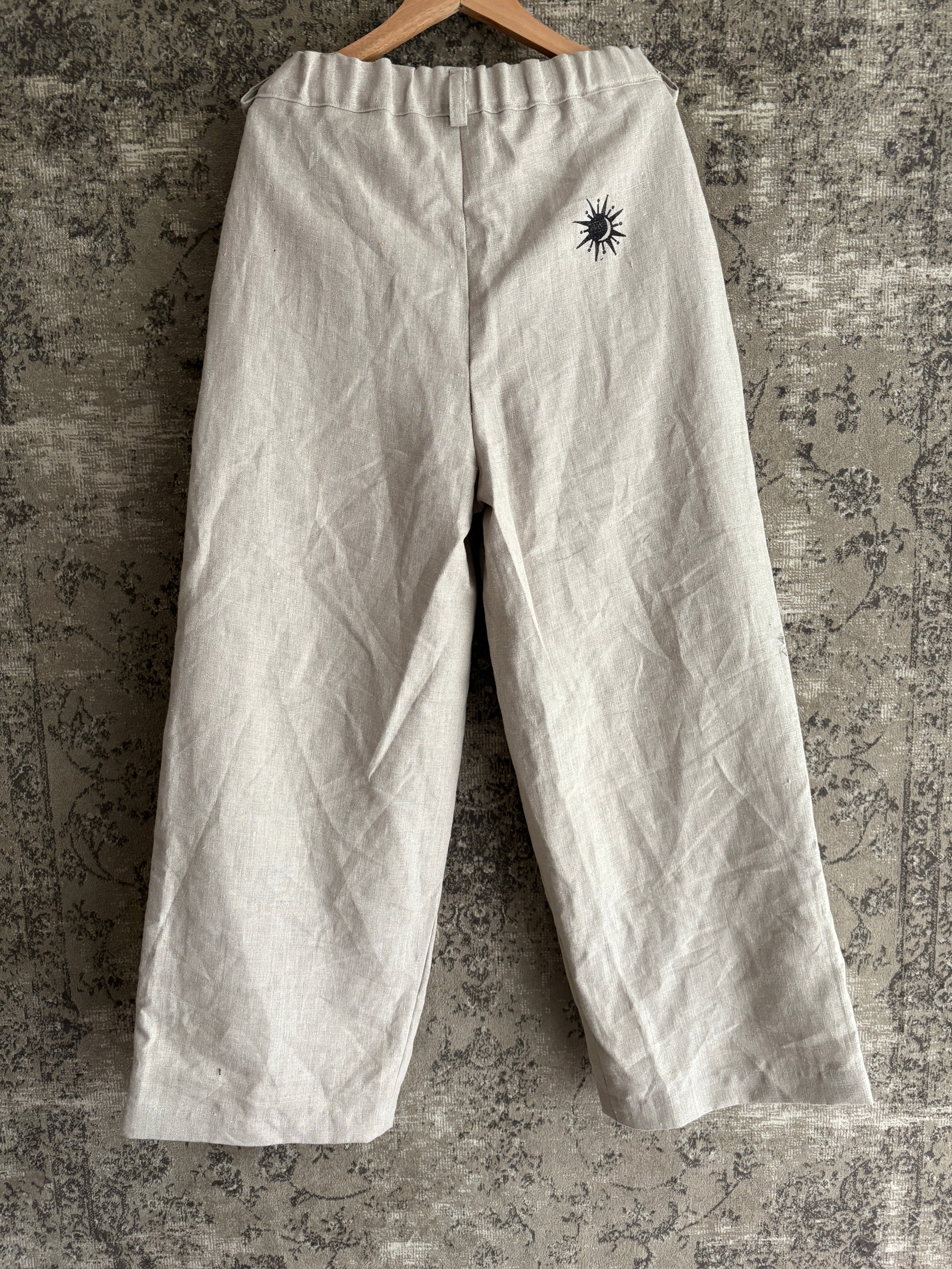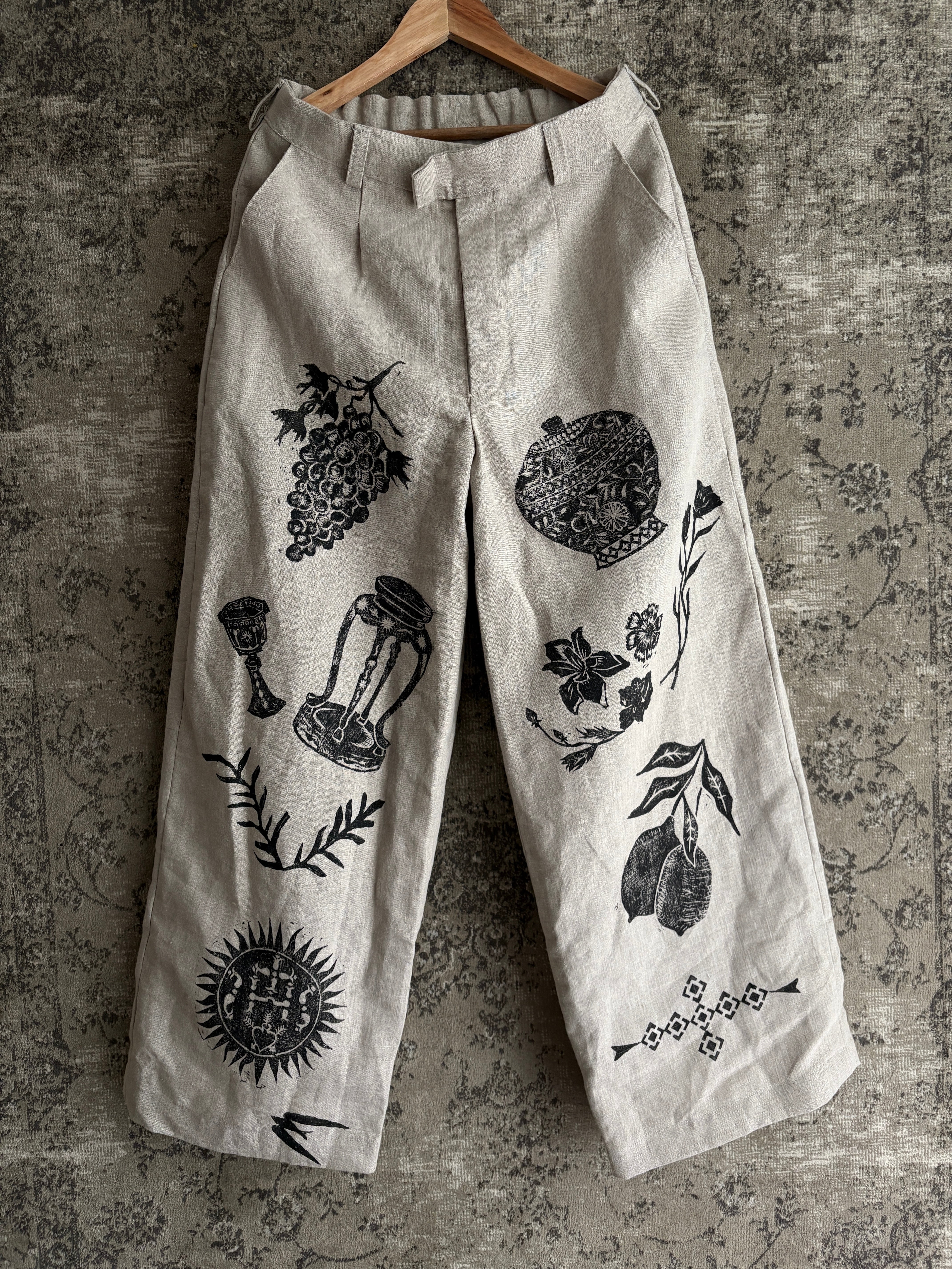 リネンパンツに手彫りで彫った琉球にちなんだものをプリントしております