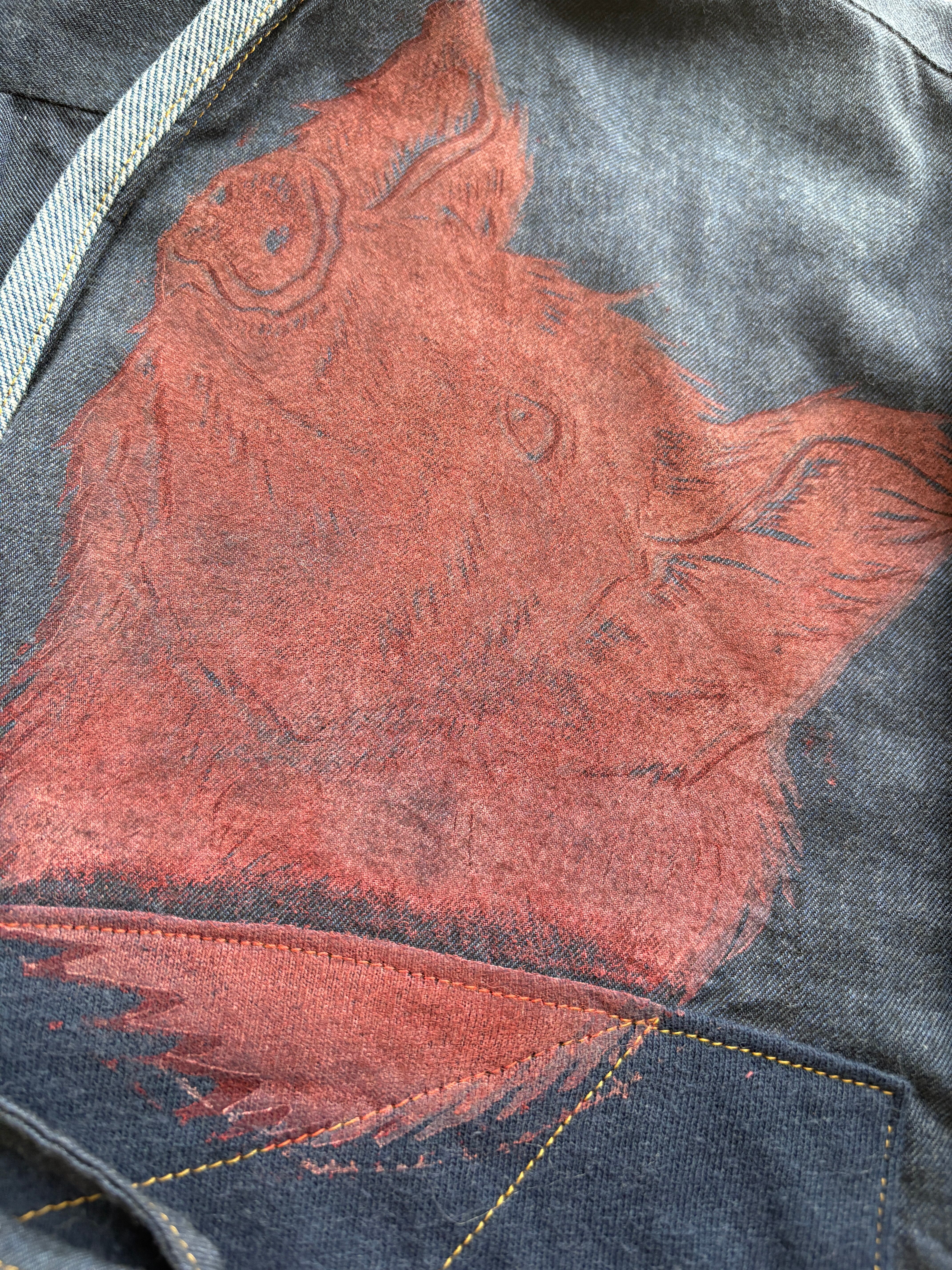 彩りワークス様とのコラボ商品、リメイクされた服に版を押してます