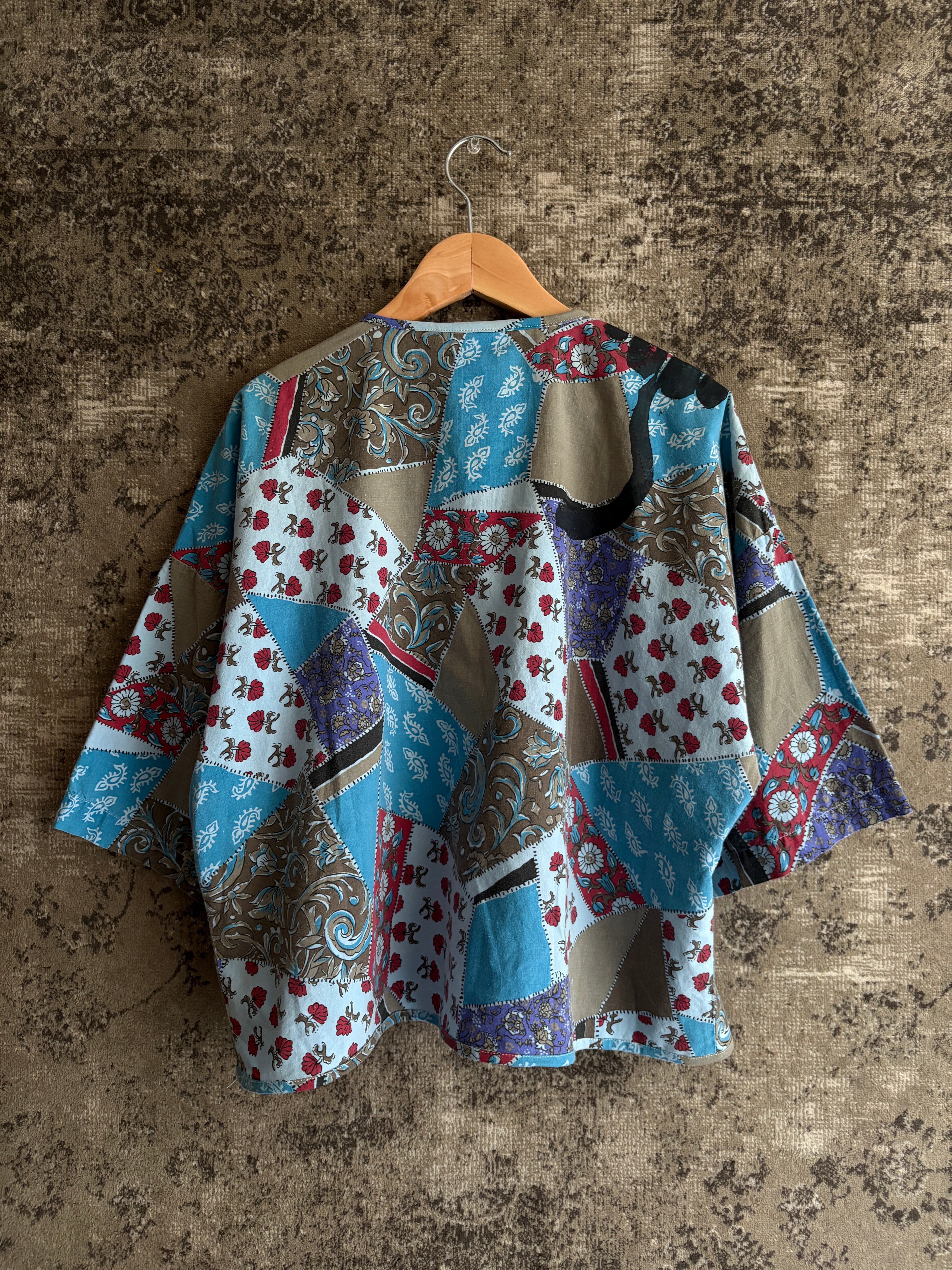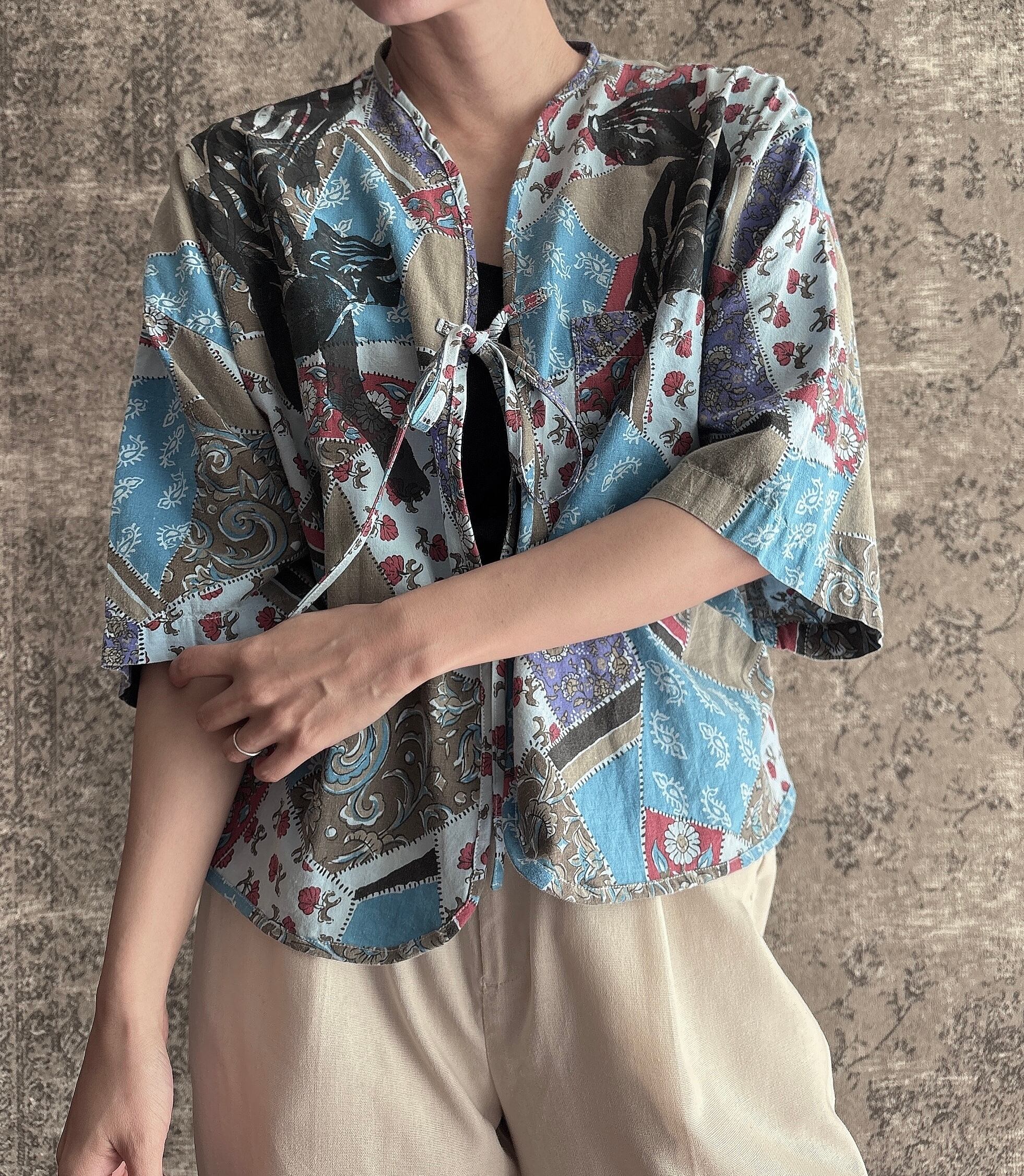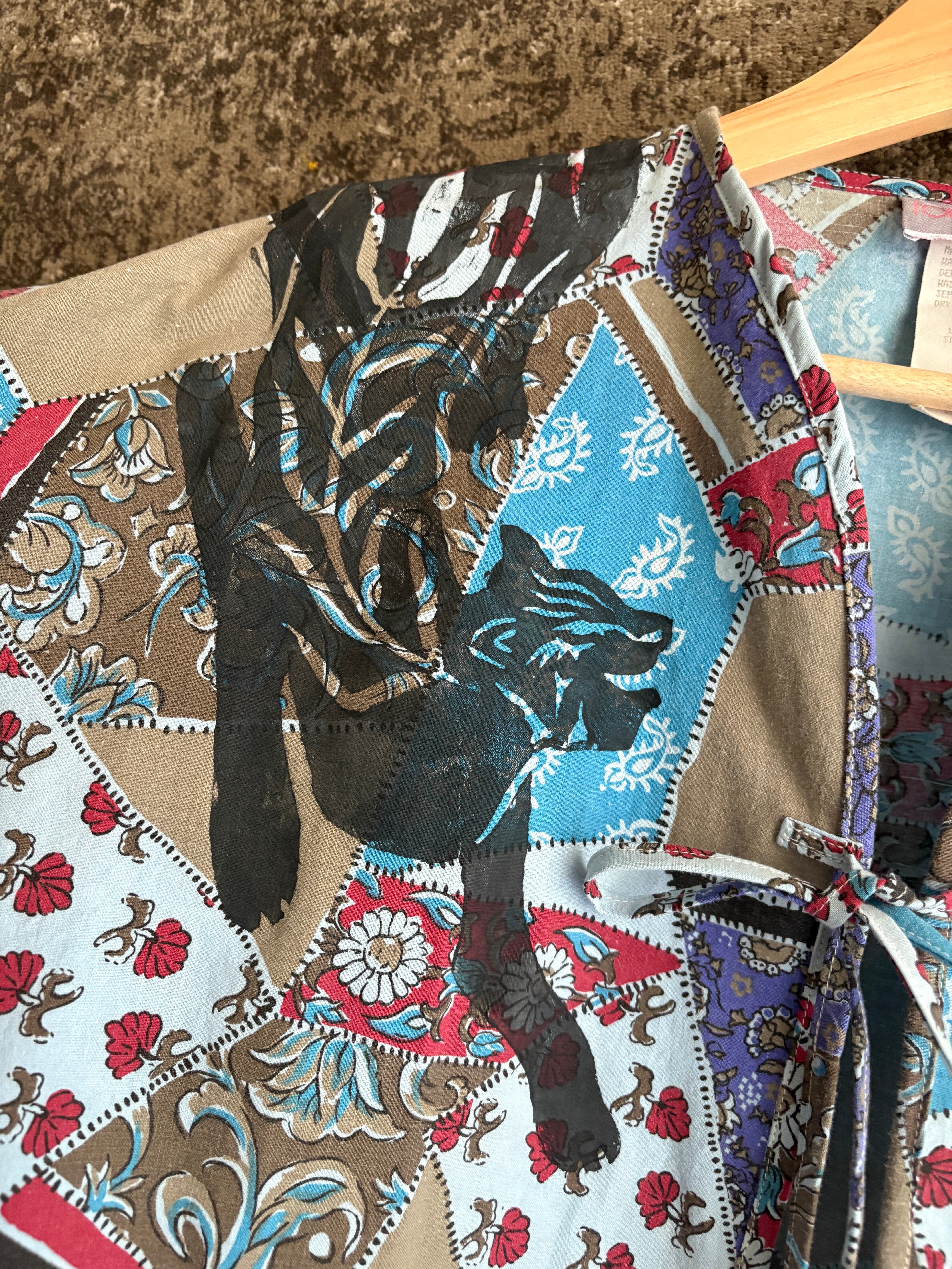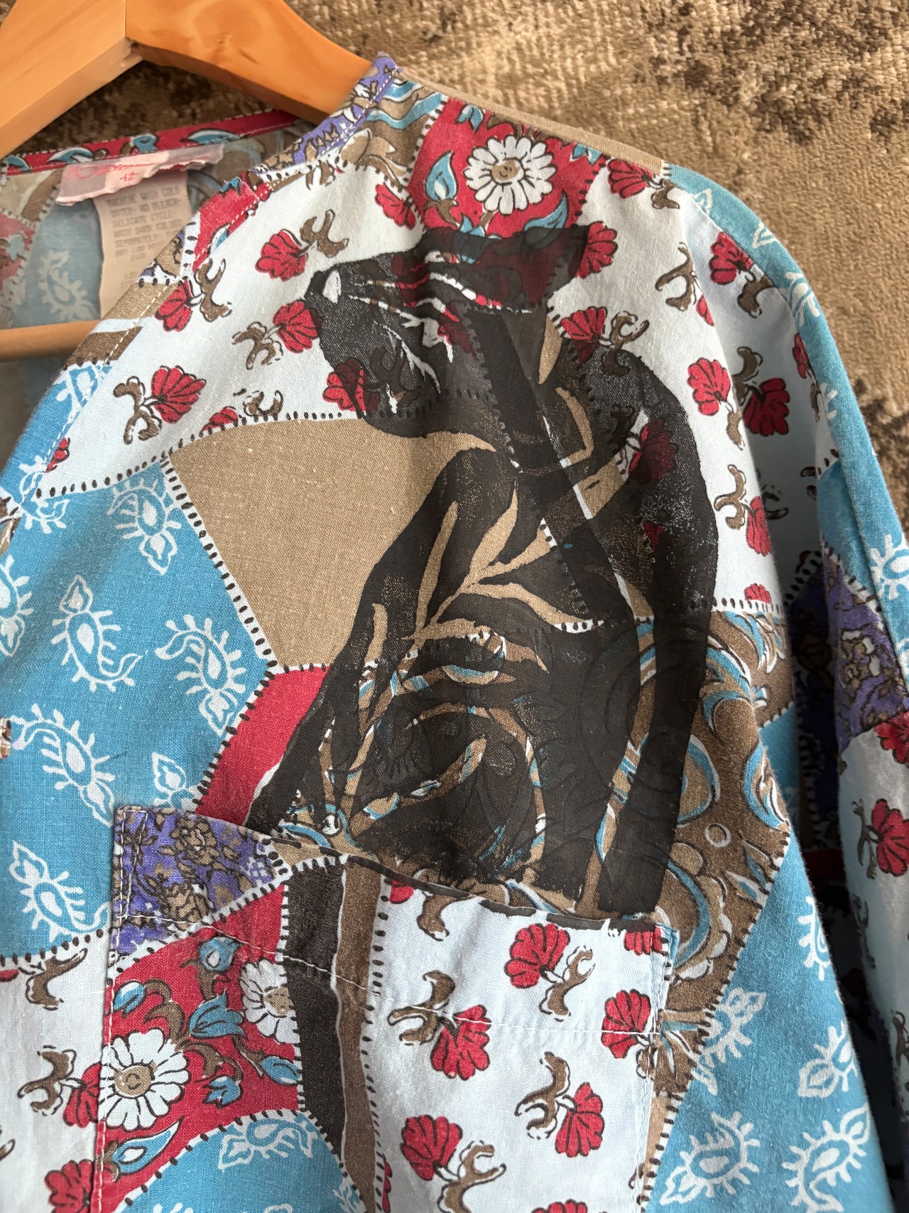 羽織り コットン ブロックプリント 猫 USA 古着 シャツ ブラウス