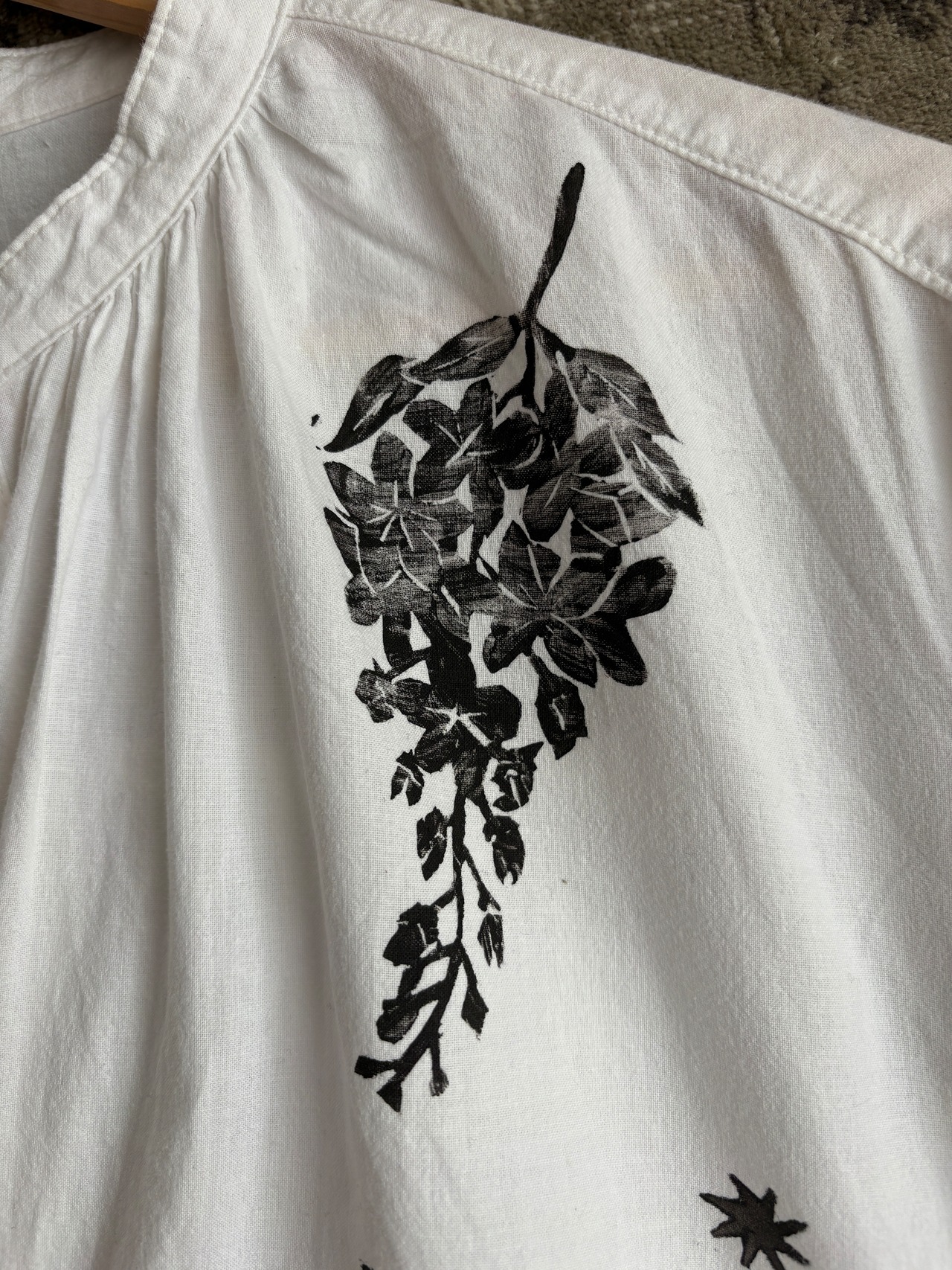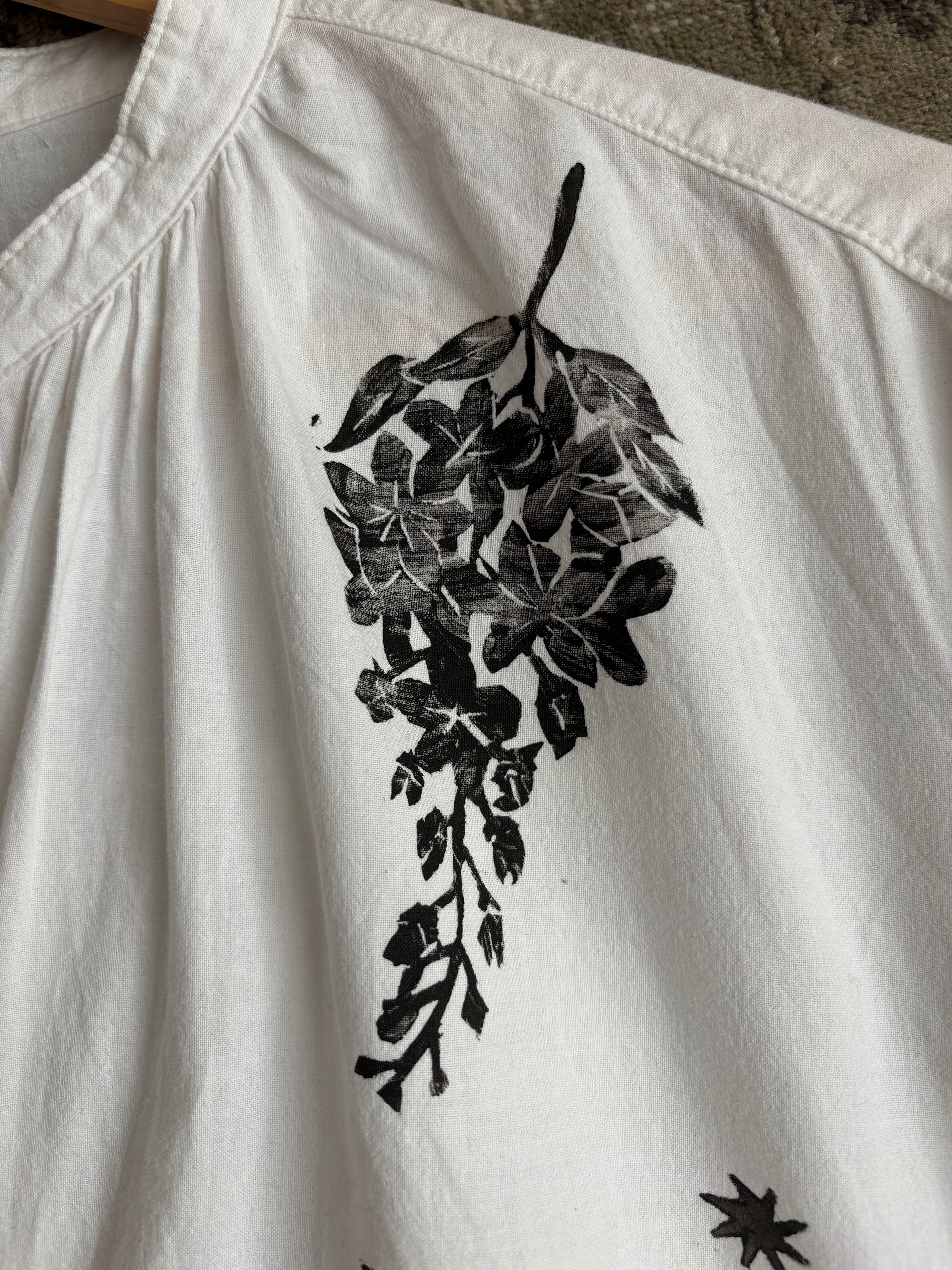 オーダー頂きました持ち込みのシャツに手彫りで彫った版を一つ一つ手作業でプリントしております