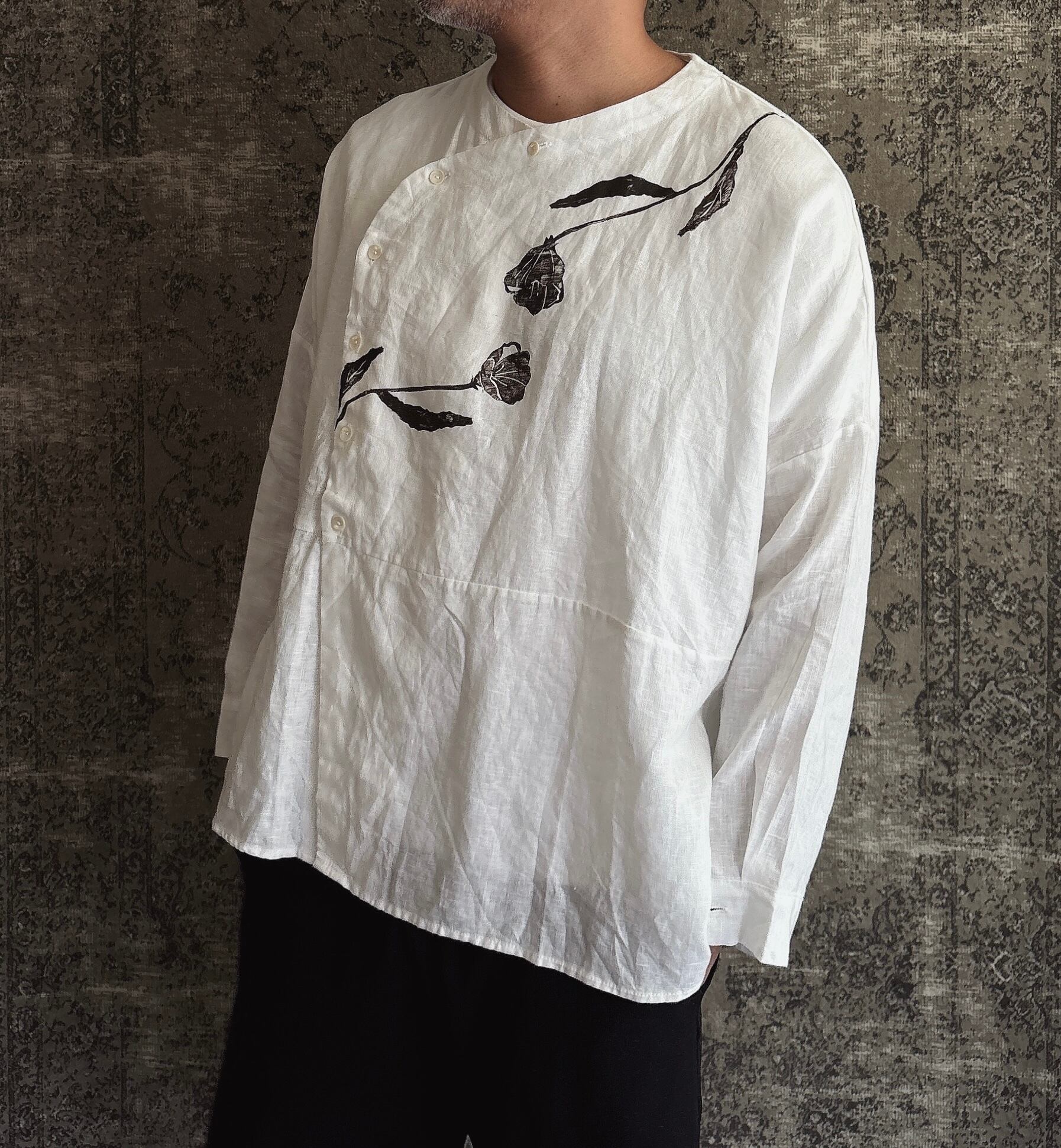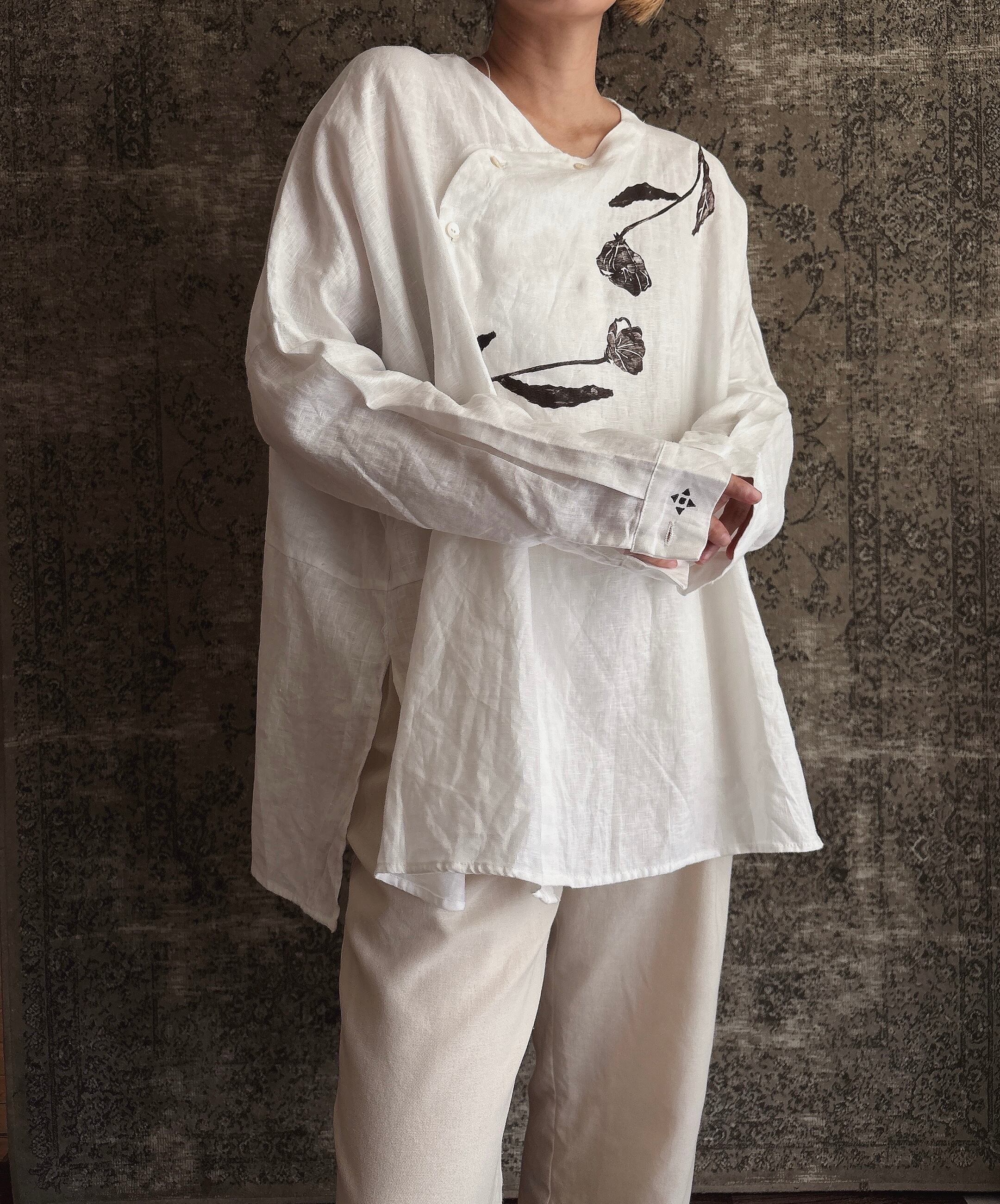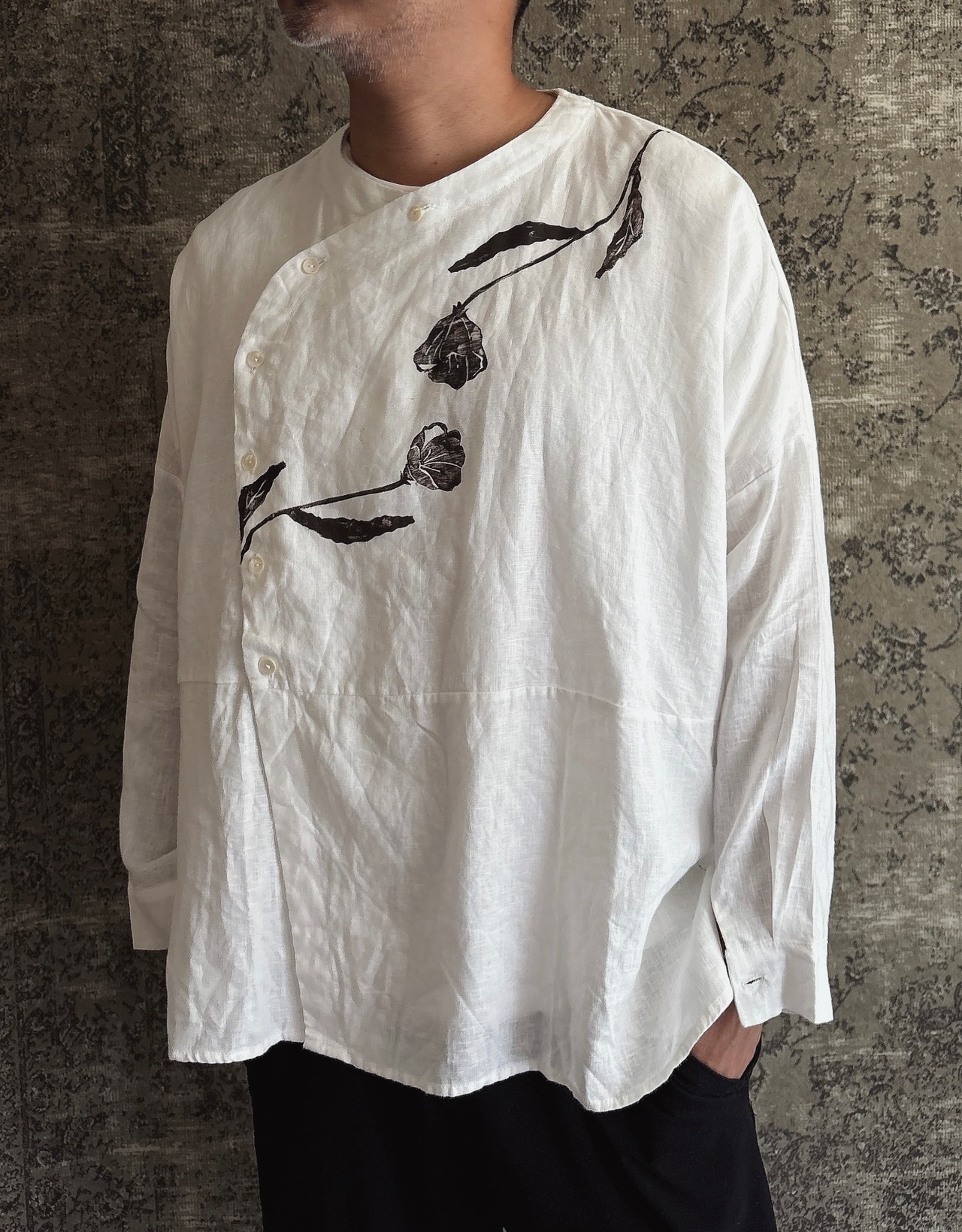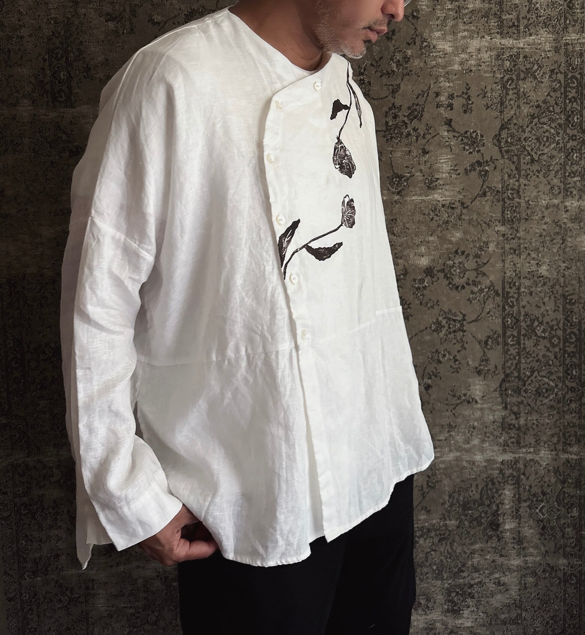 リネン ノーカラーシャツ バンドカラーシャツ 花柄 ブロックプリント 白 ホワイト メンズ 麻