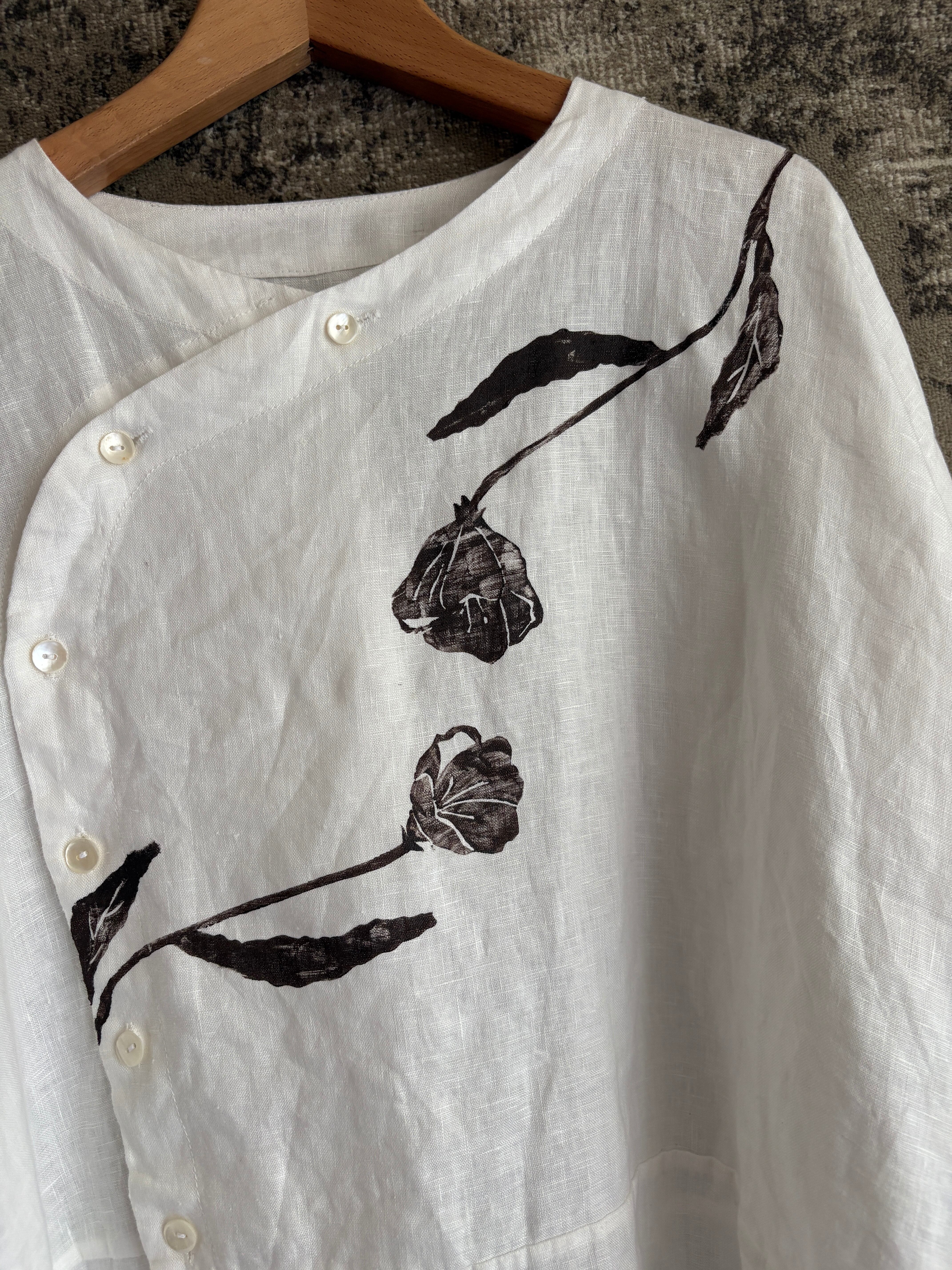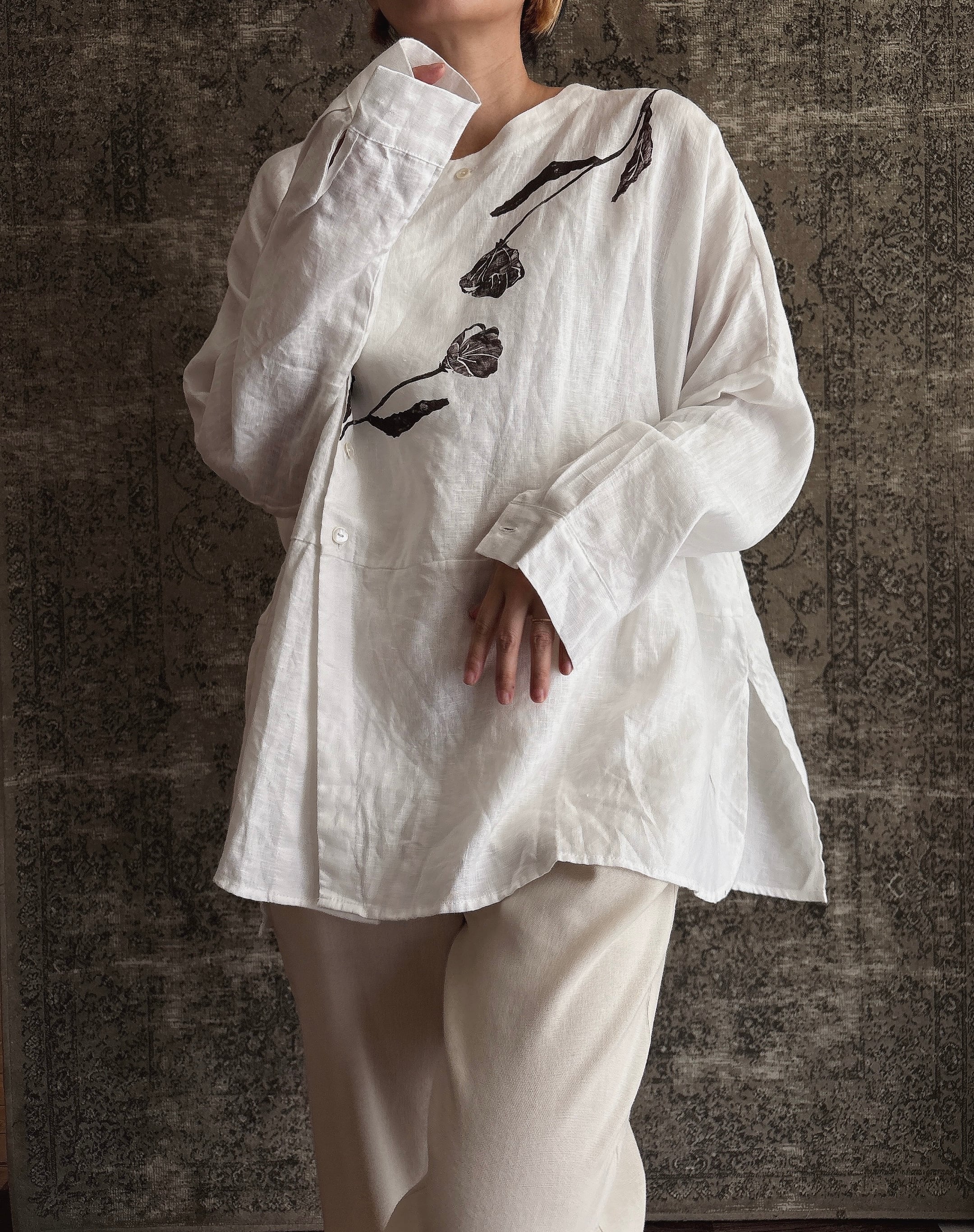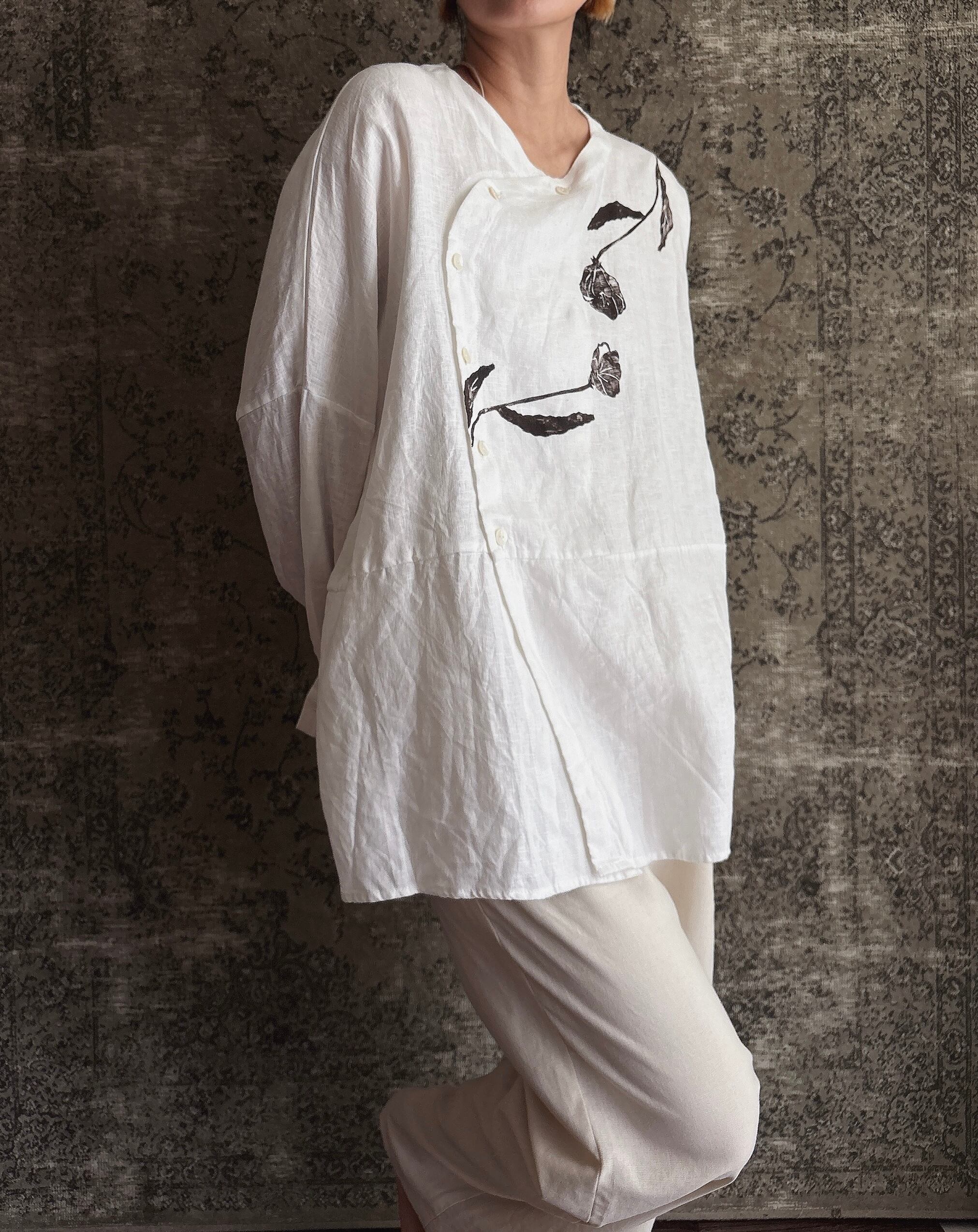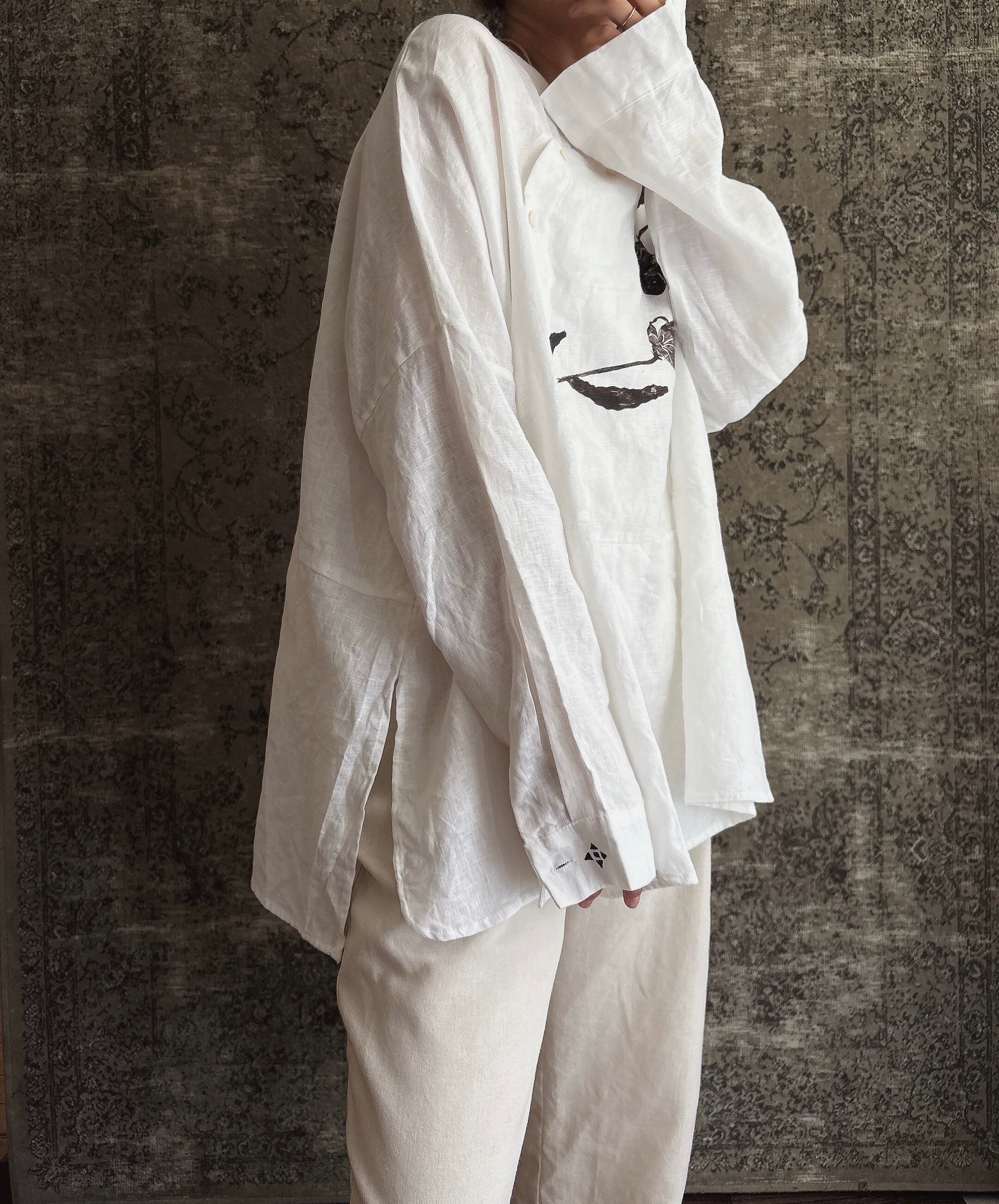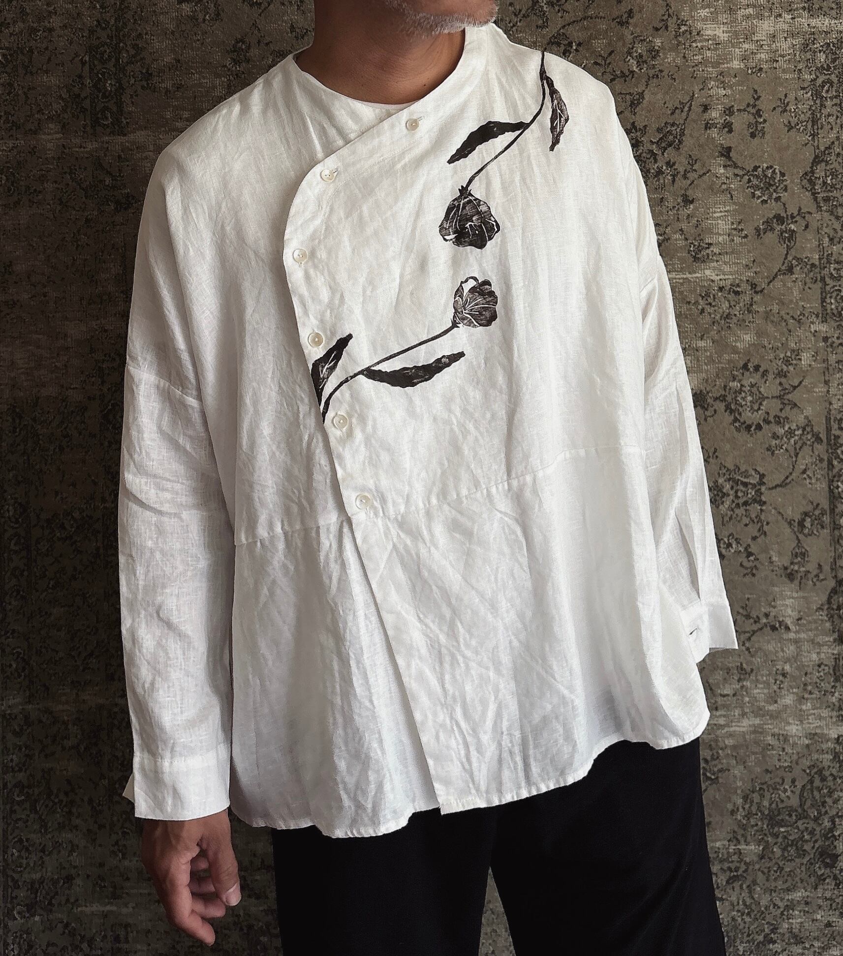 リネン ノーカラーシャツ バンドカラーシャツ 花柄 ブロックプリント 白 ホワイト メンズ 麻
