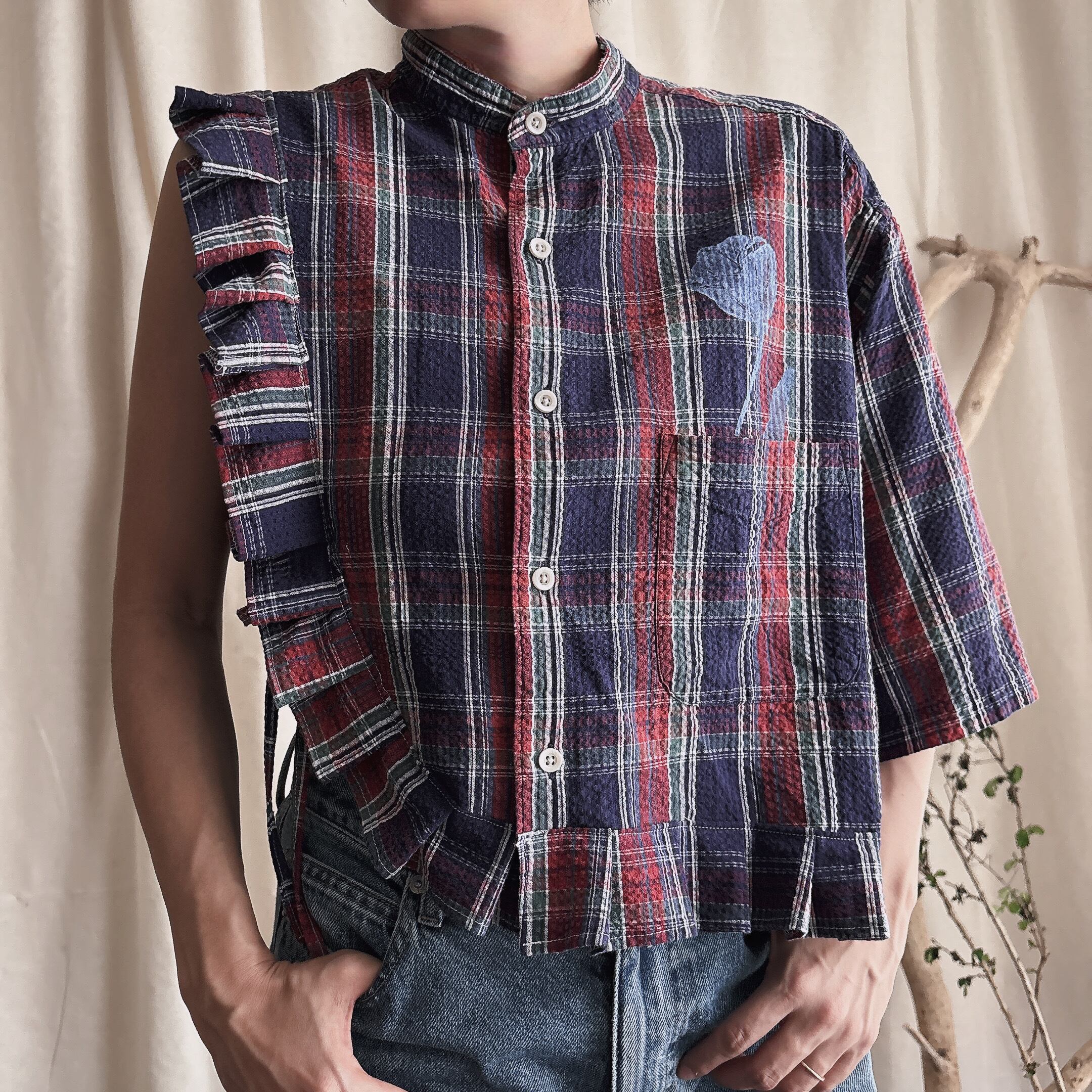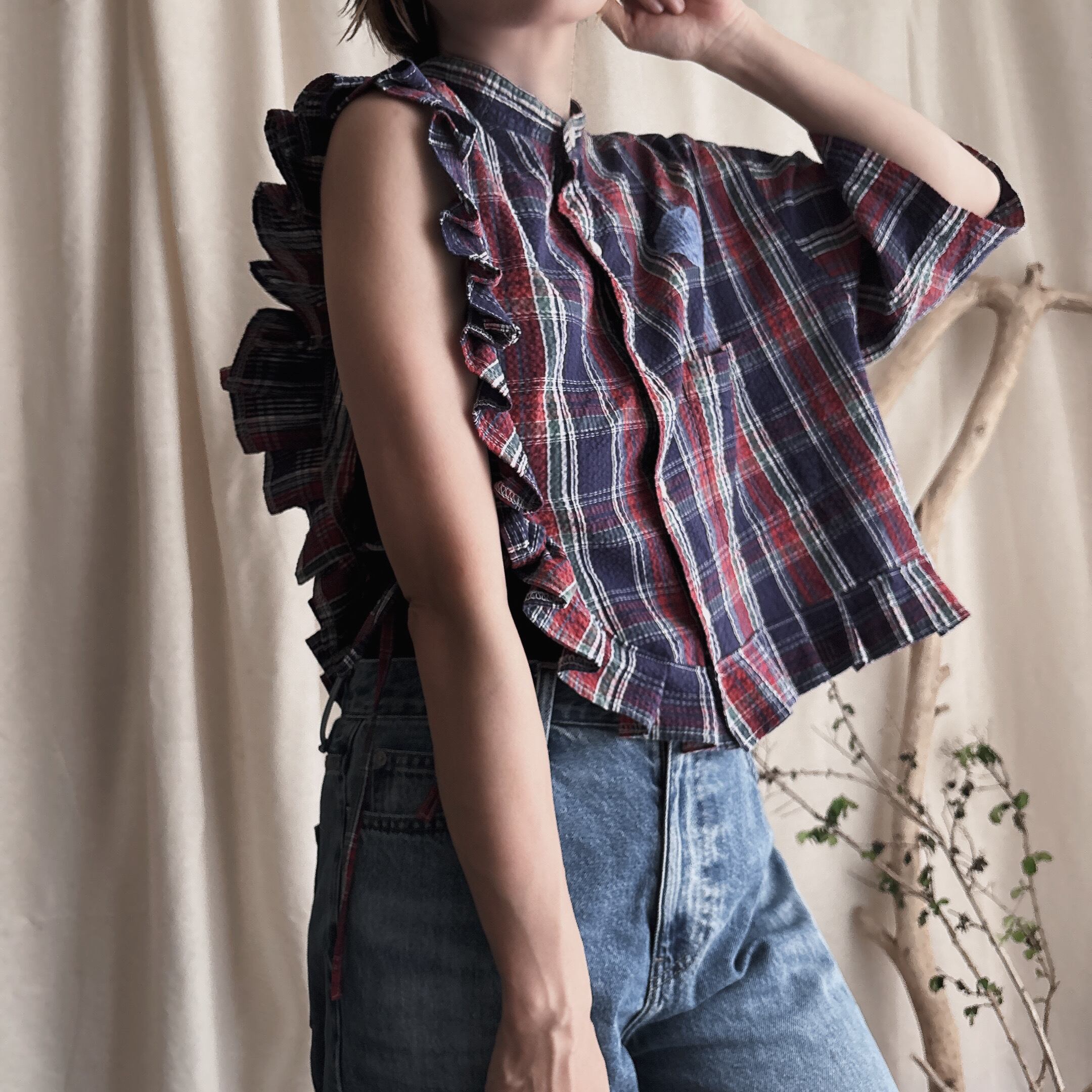 ヴィンテージ フリル コットン 半袖 シャツ ブラウス レディース チェック