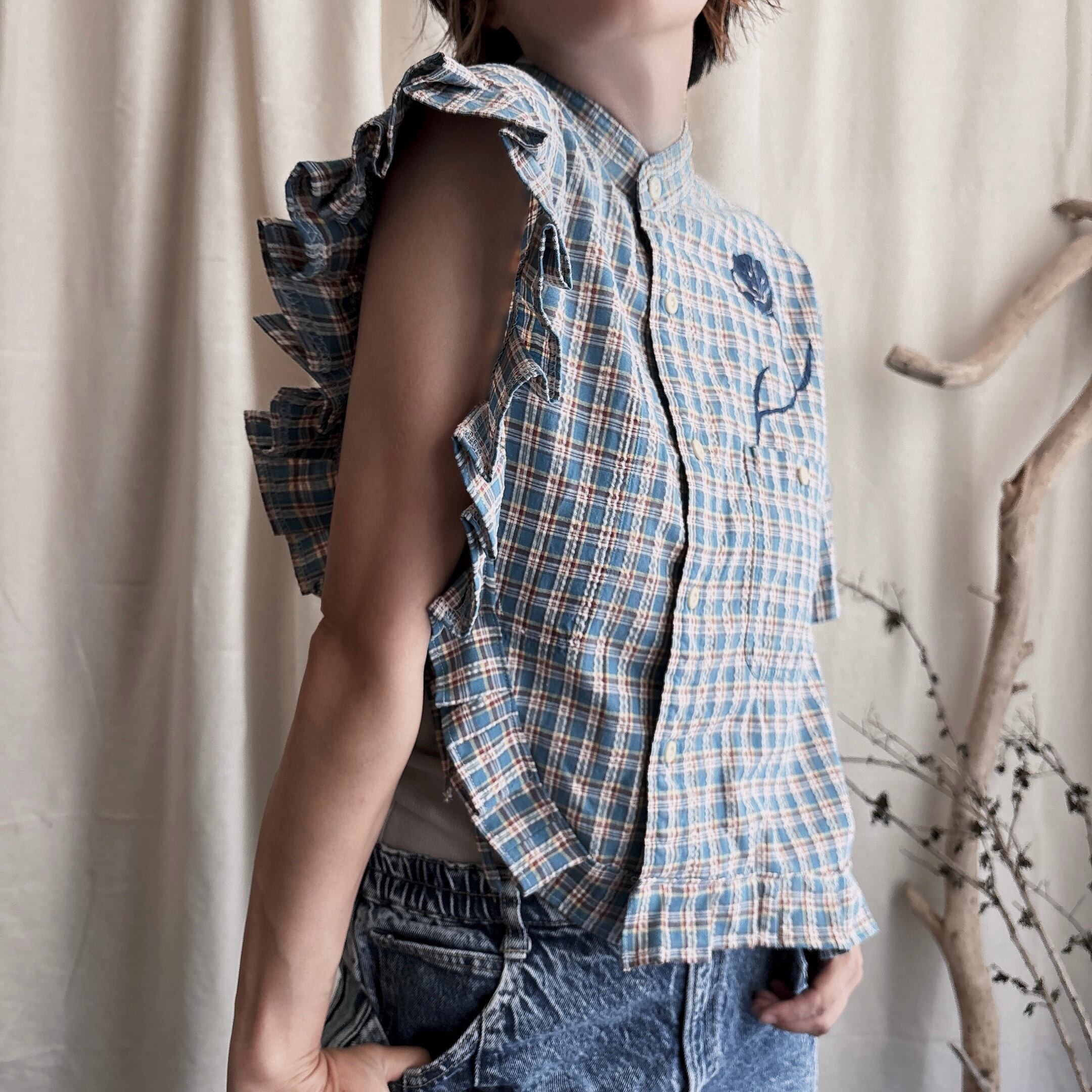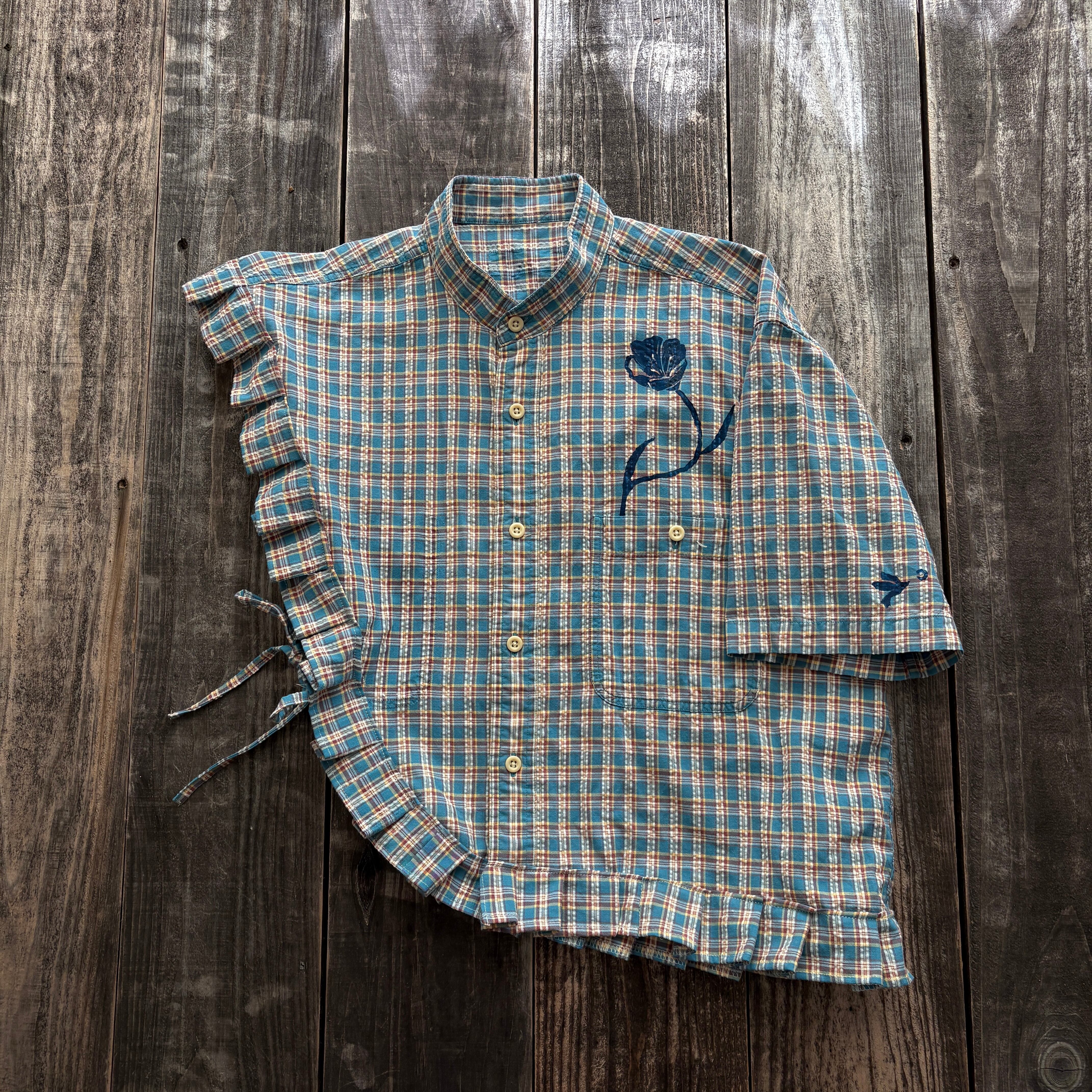 ヴィンテージ フリル コットン 半袖 ギンガムチェック シャツ ブラウス レディース