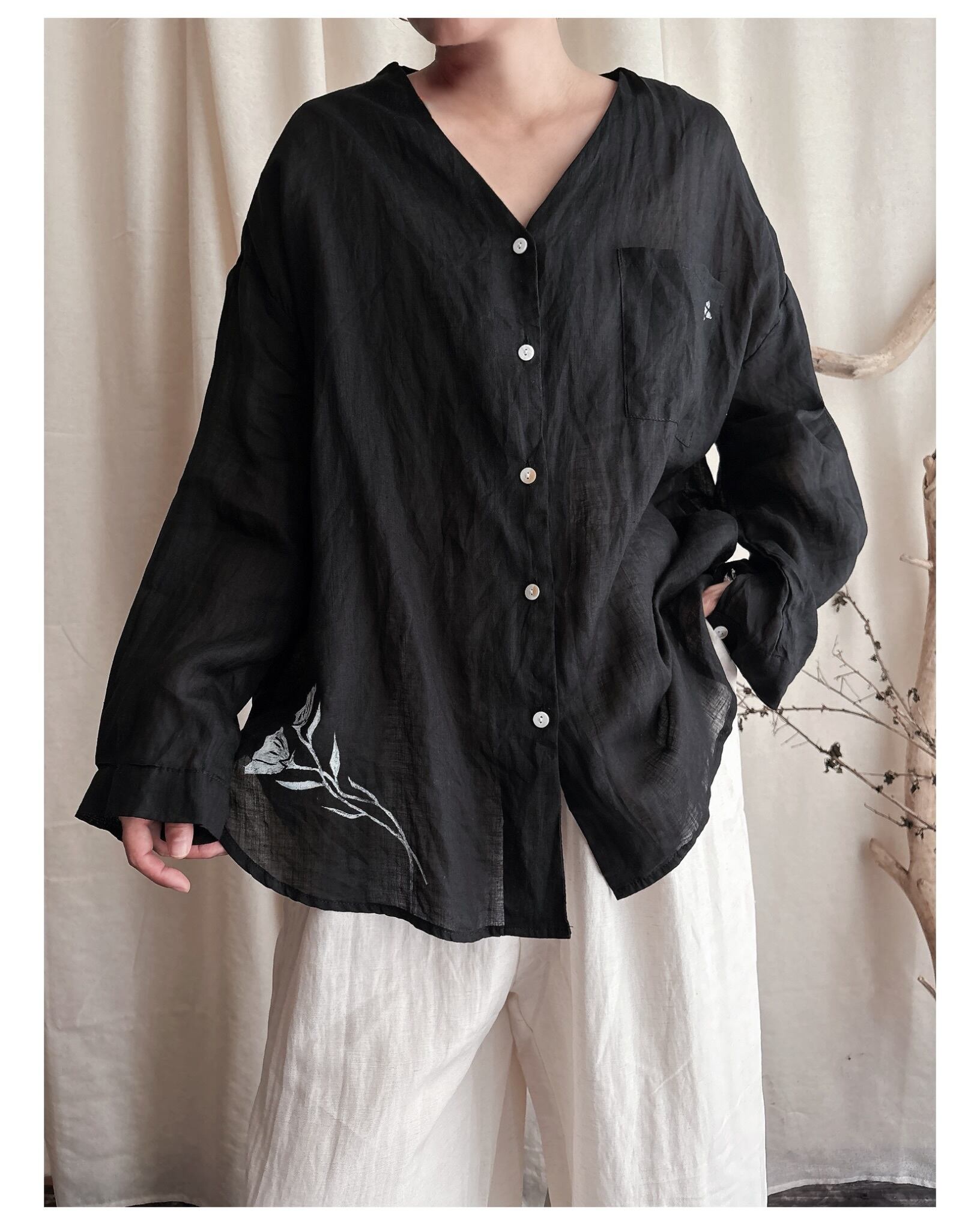 リネン シャツブラウス 黒 ブラック 月の満ち欠け 丸首