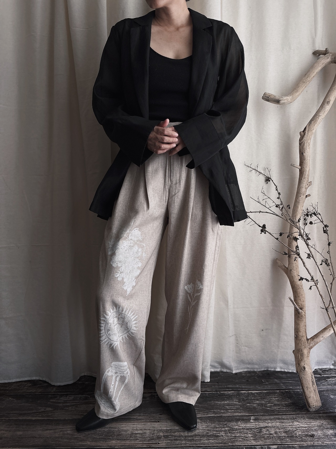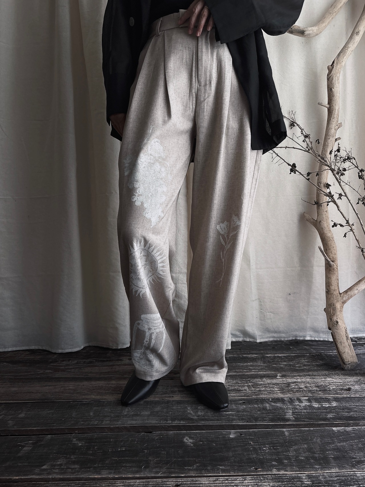 パンツ リネンパンツ 柄 レディース タックパンツ ブロックプリント スラックスパンツ 麻 リネン