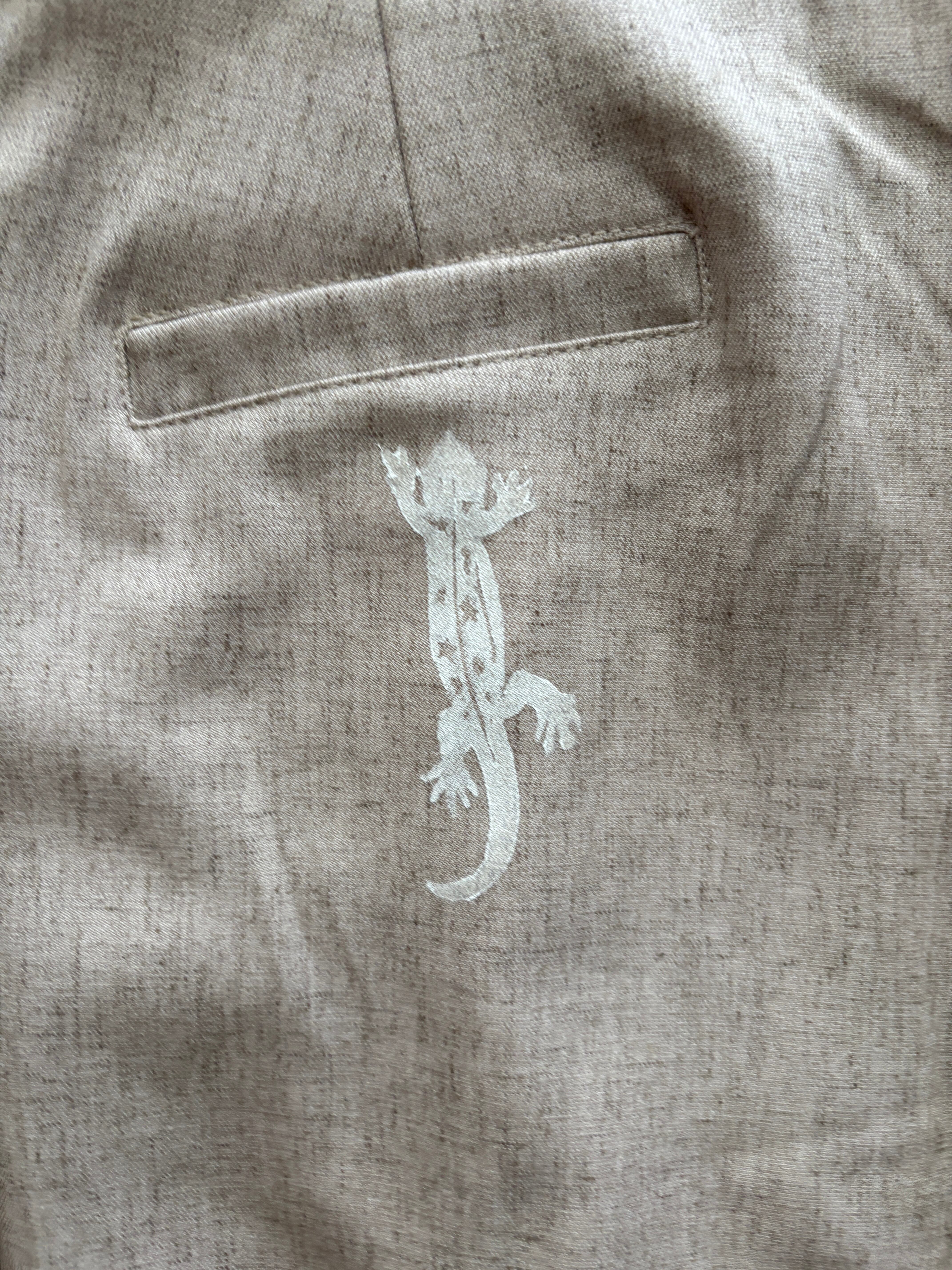 沖縄にちなんだ物をシルクスクリーンではなく、手彫りした版で一つ一つ手作業で服にプリントしてます