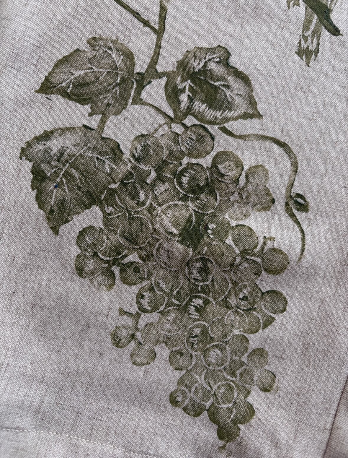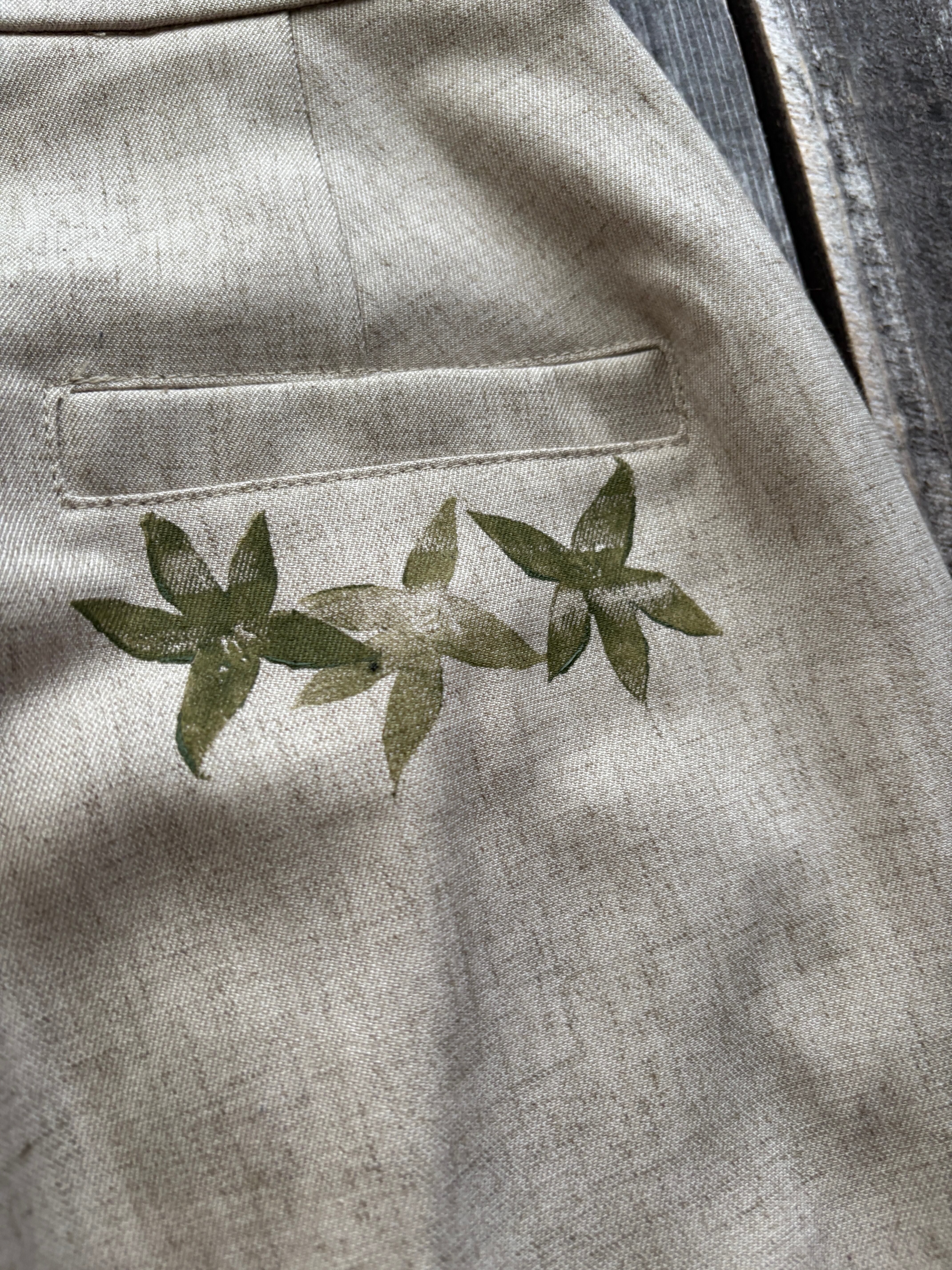 春のオリーブ色で版を押しました、反対側に琉球ガネブブドウのツルが伸びている所がポイントです⭐︎⁎ˇ◡ˇ⁎後ろのポケットに押してるのは琉球マイヤーレモンの花です