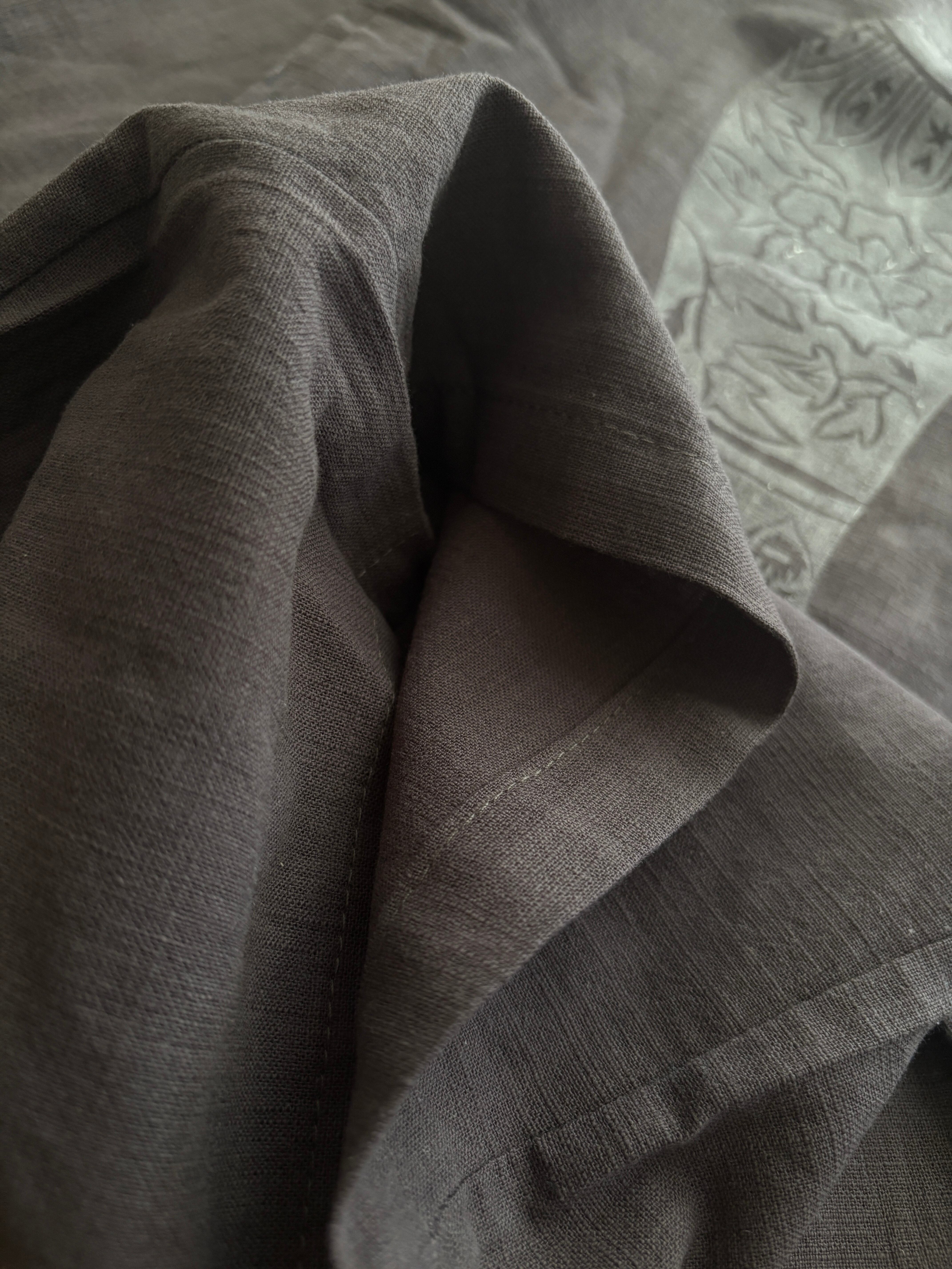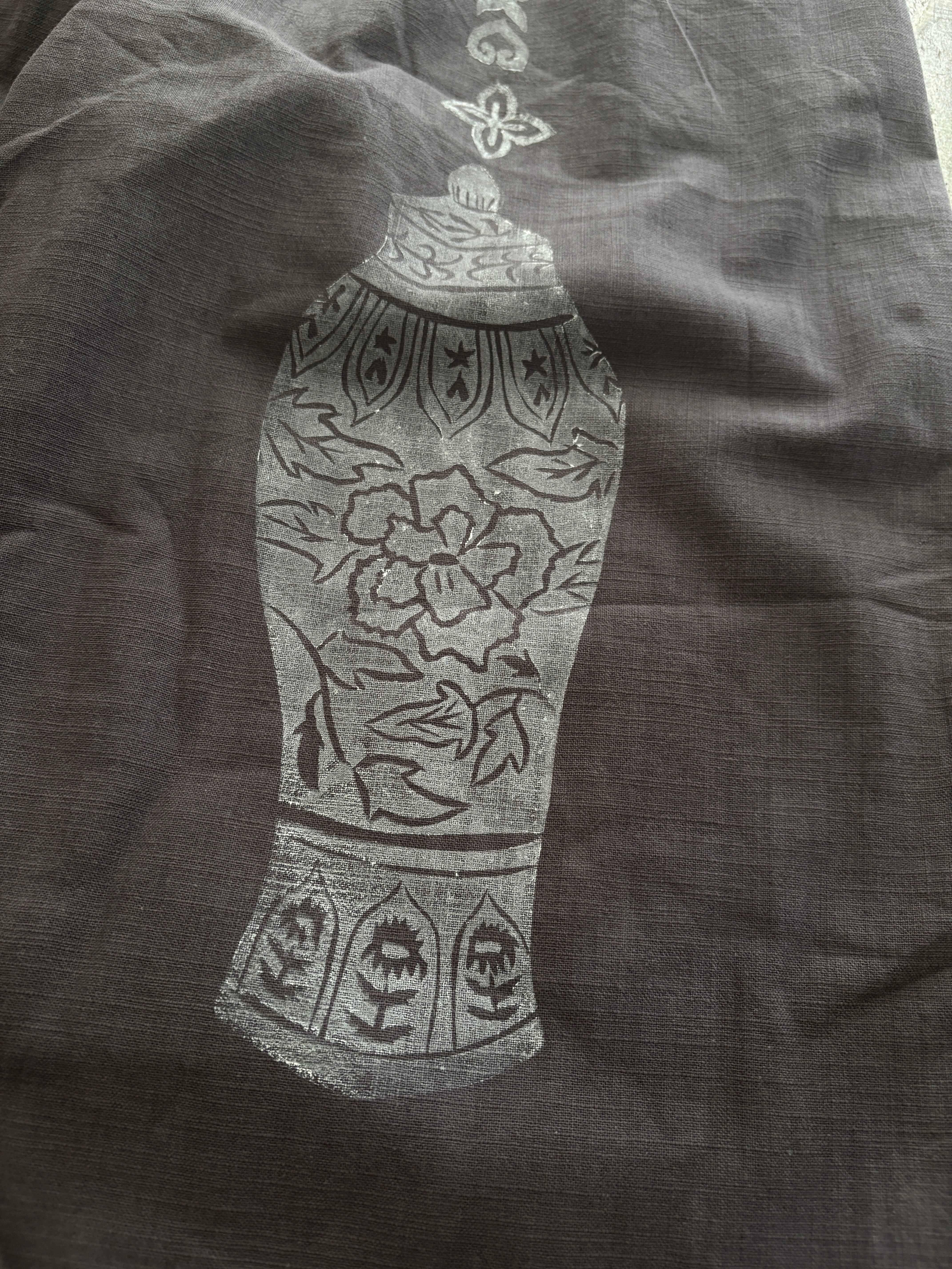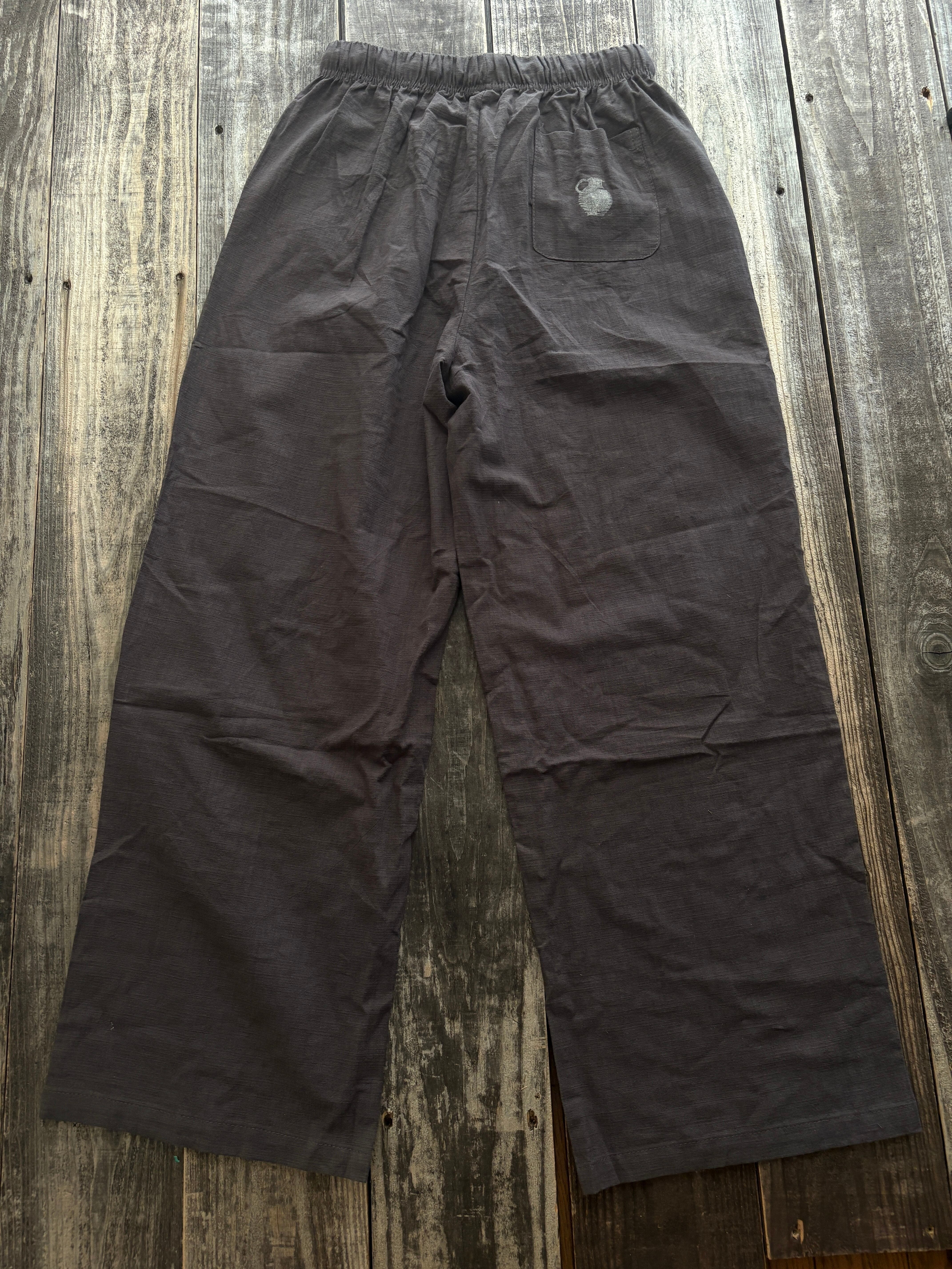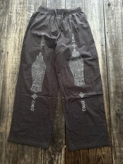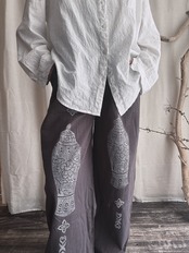 琉球王朝時代の壺を手彫りして服にプリントしてます。麻のパンツで、チャコールグレーがまたいいです