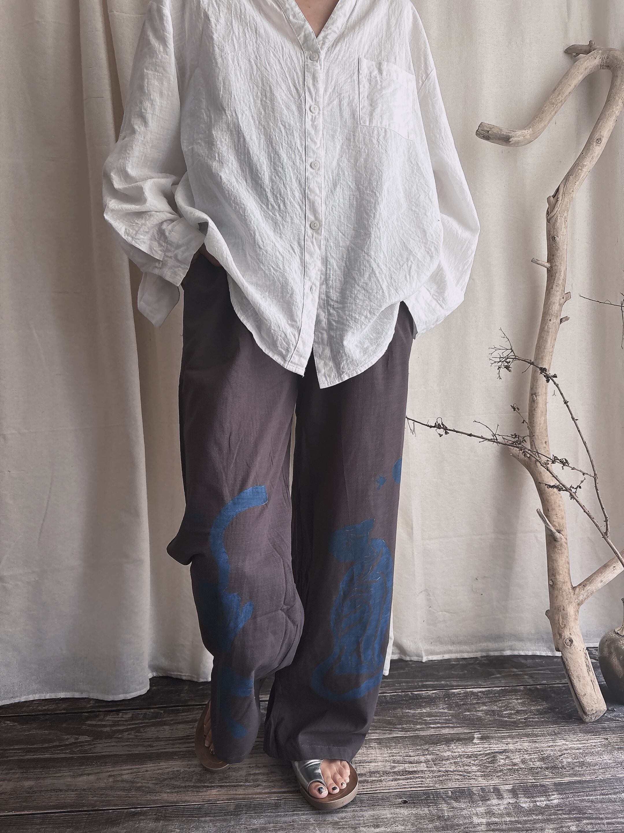 麻のパンツで、チャコールグレーがまたいいです