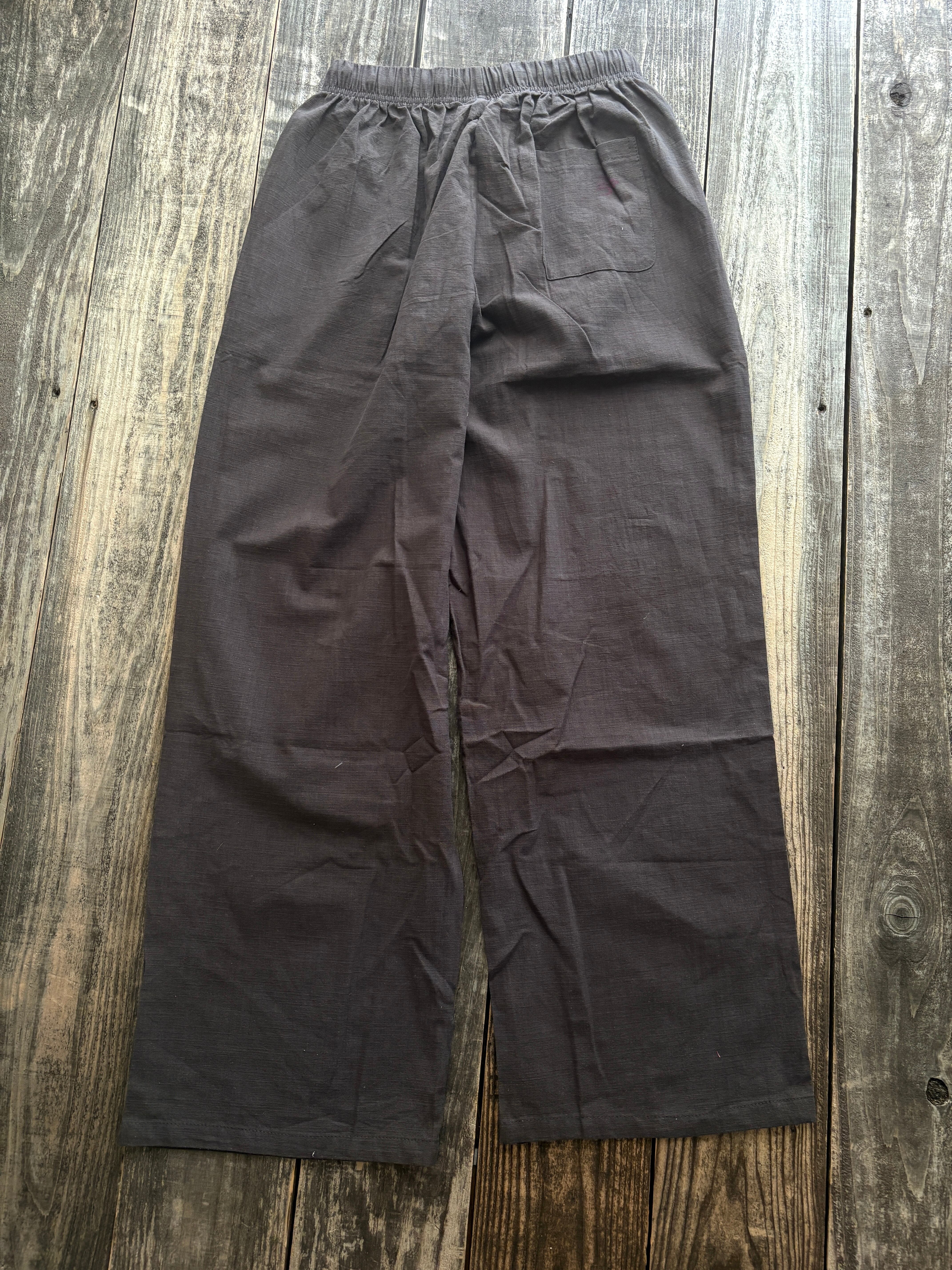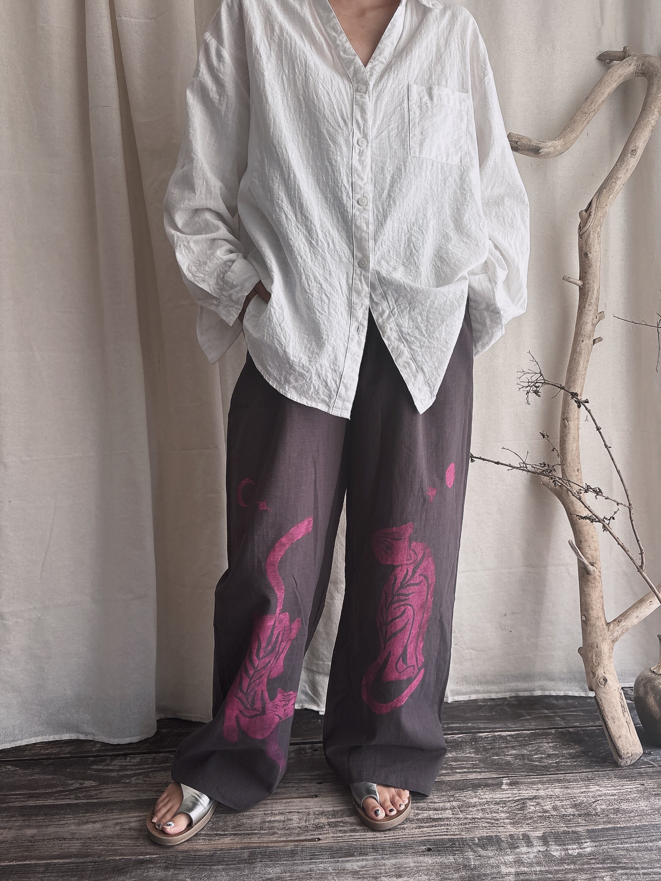 麻 リネン パンツ ブロックプリント猫 総柄 リメイク ハンドメイド