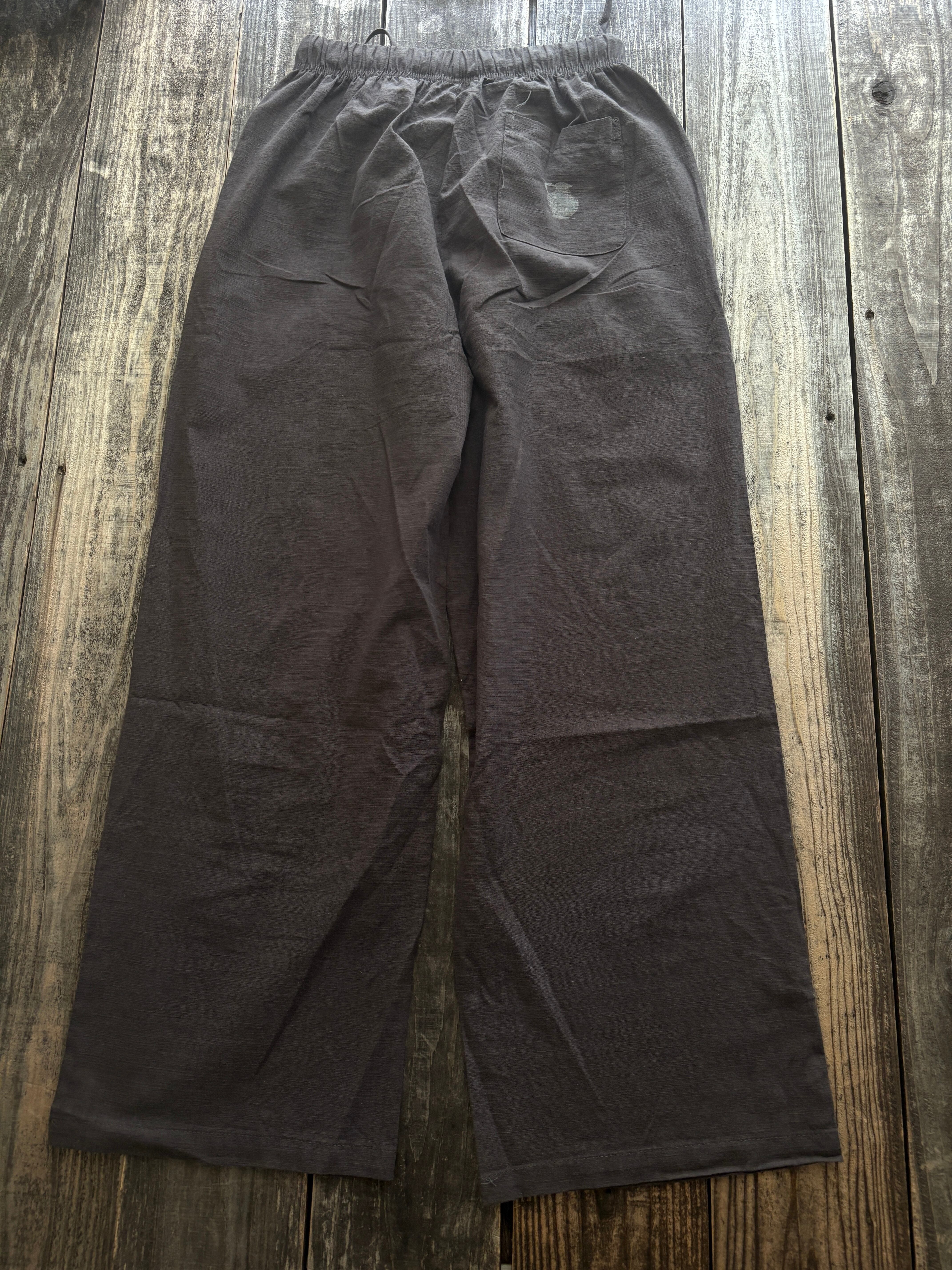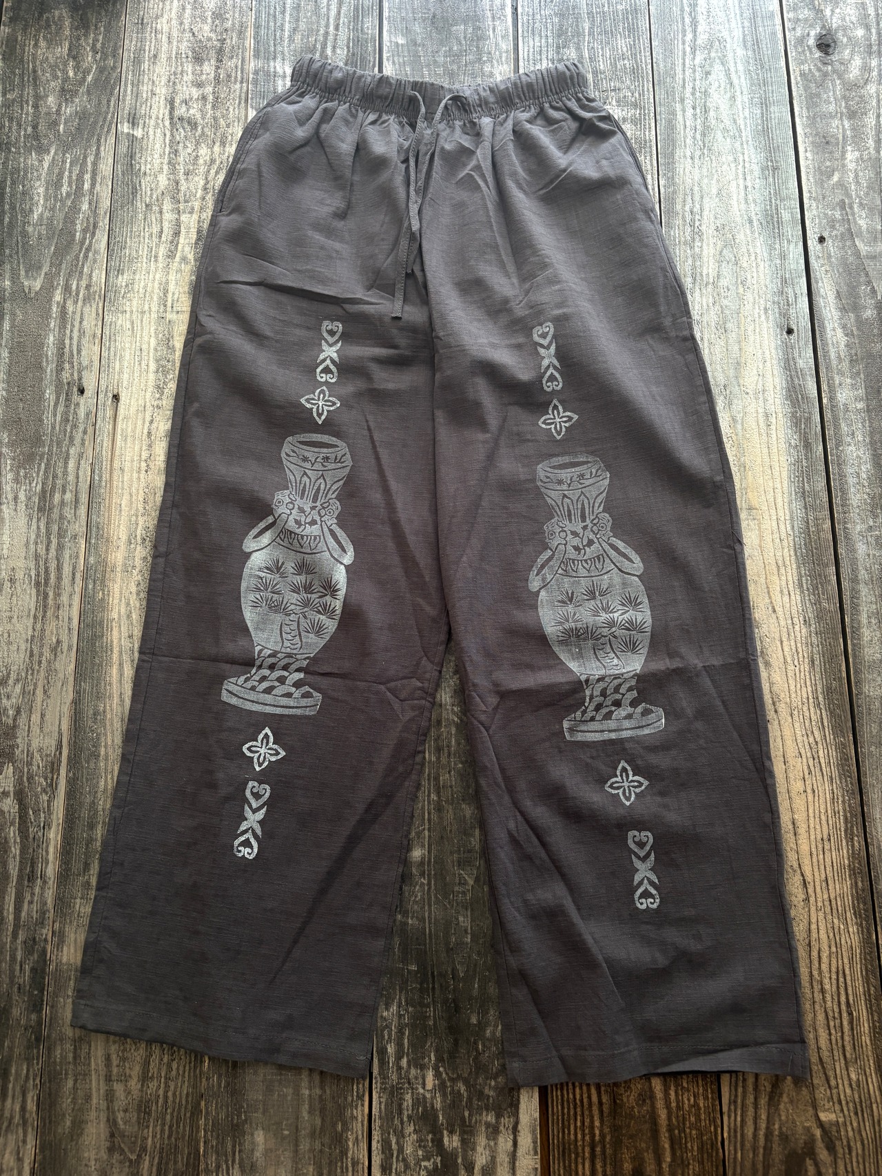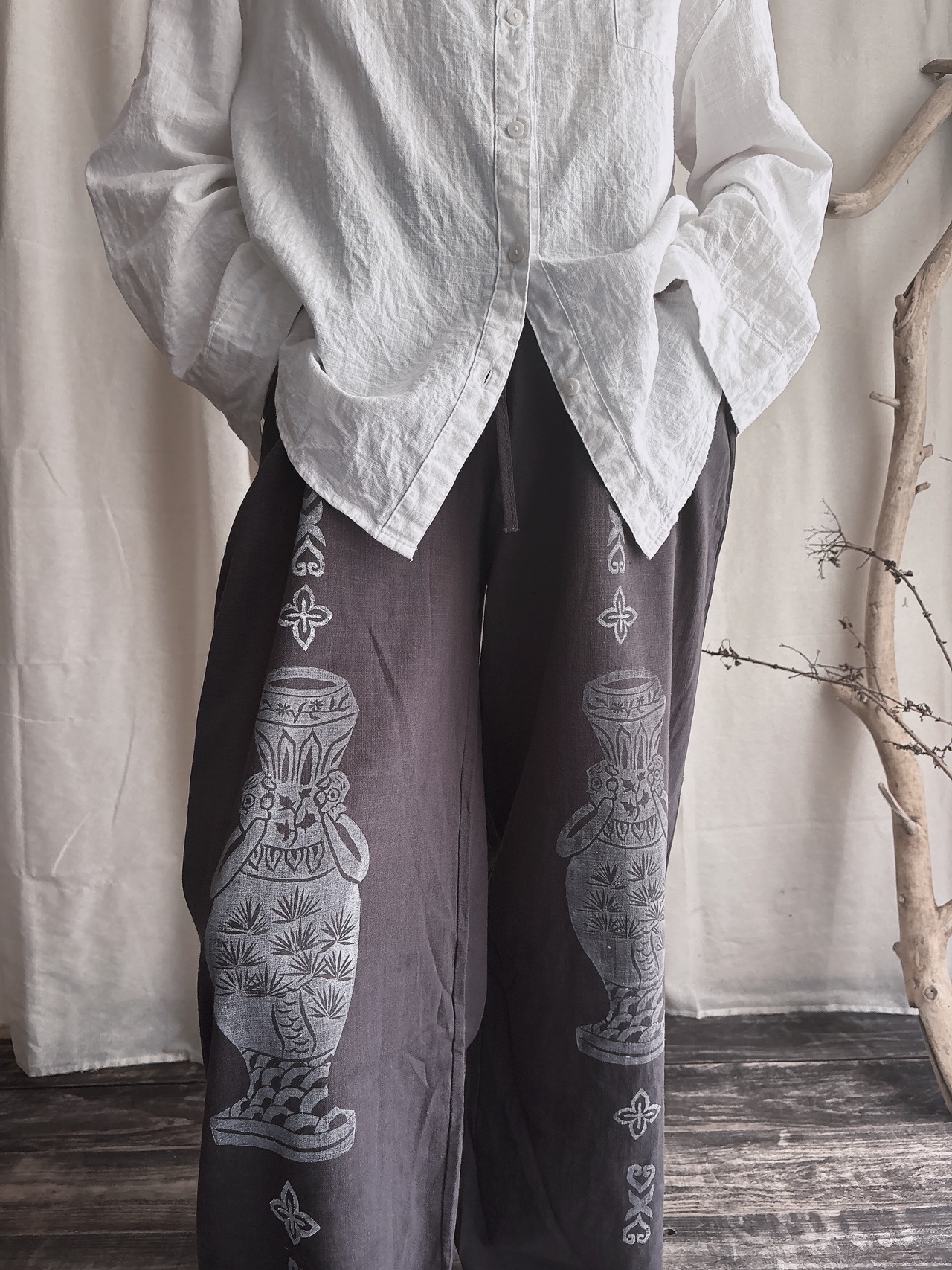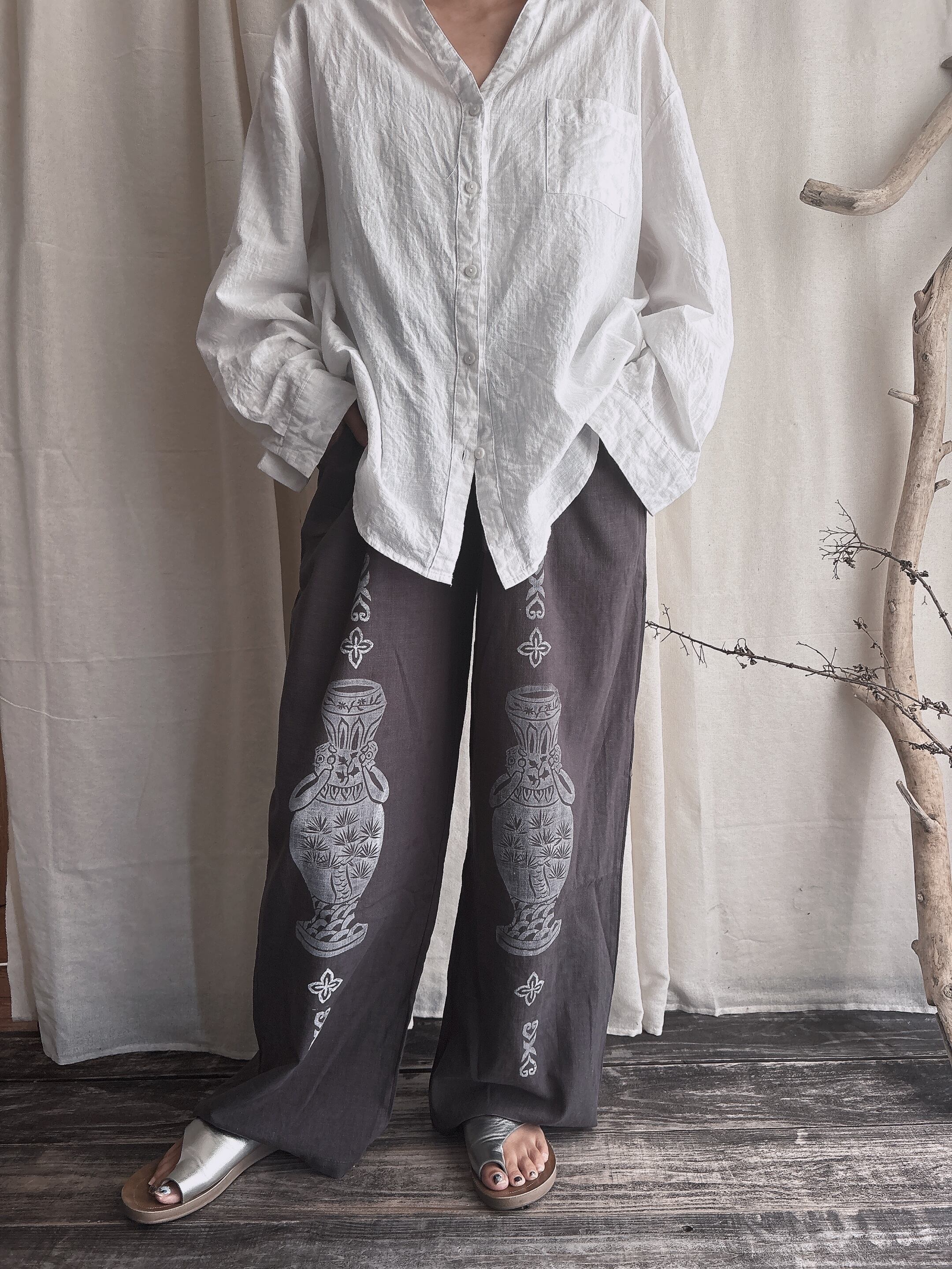 琉球王朝時代の壺を手彫りして服にプリントしてます。麻のパンツで、チャコールグレーがまたいいです