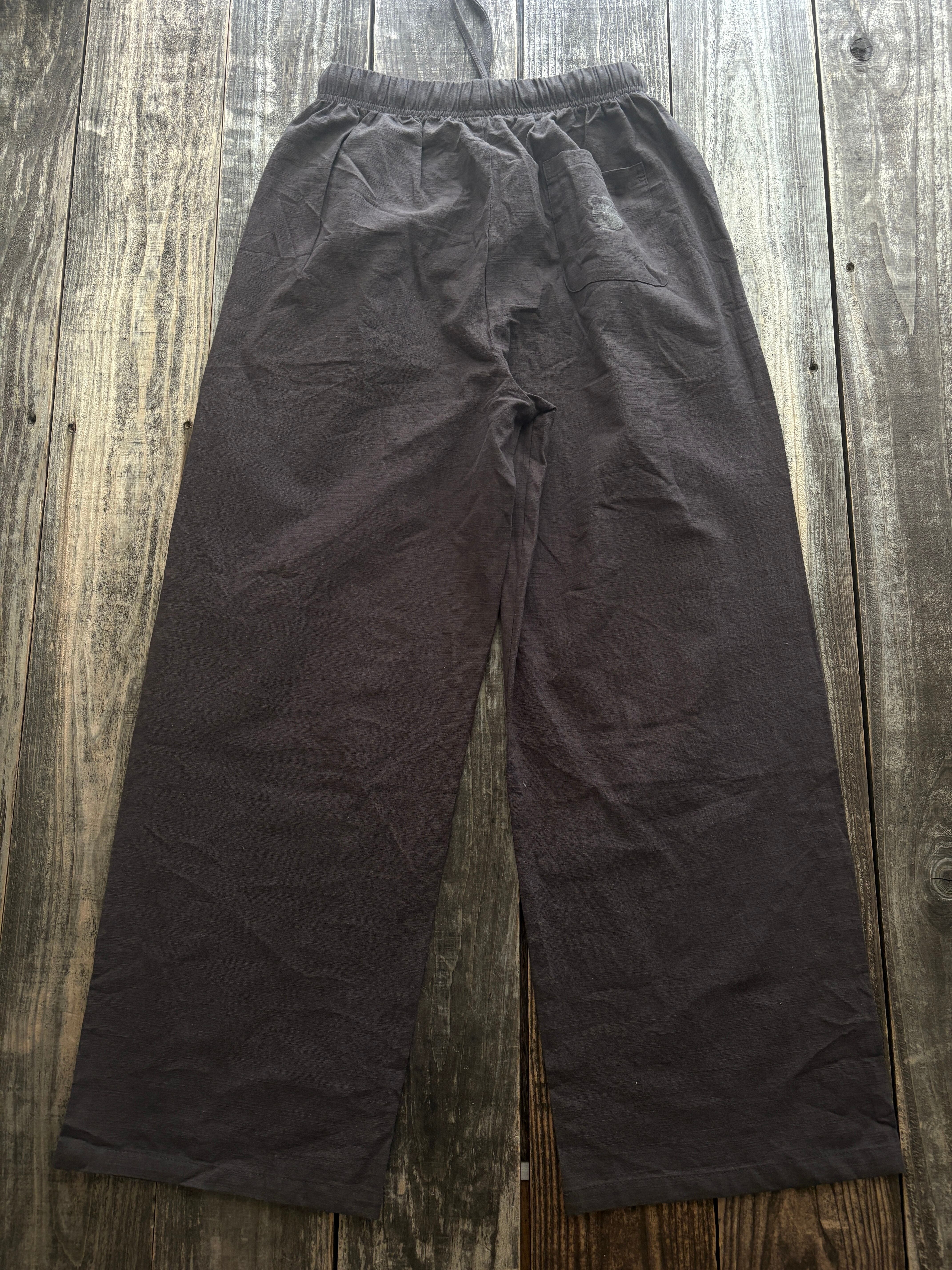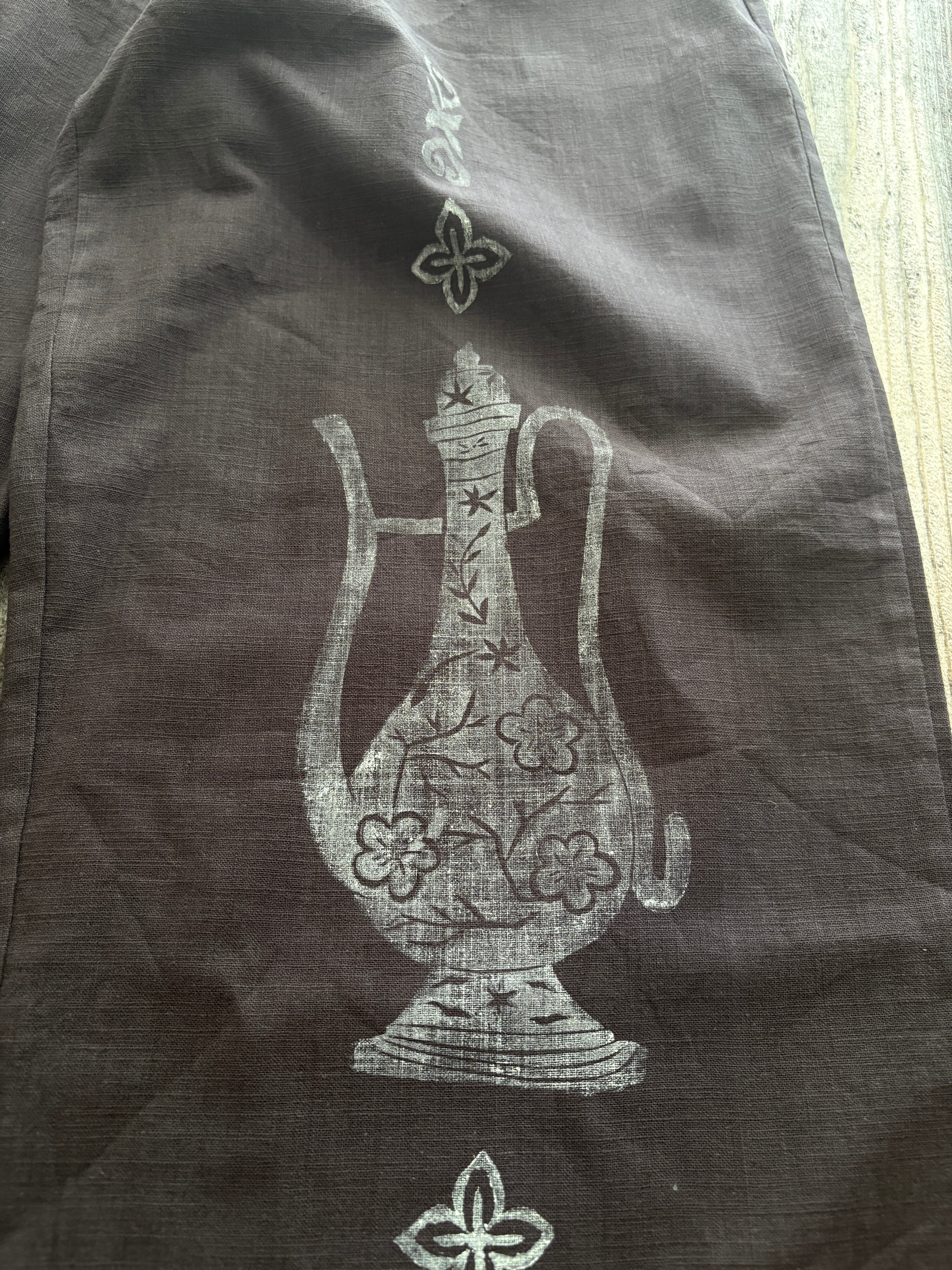 琉球王朝時代の壺を手彫りして服にプリントしてます。麻のパンツで、チャコールグレーがまたいいです
