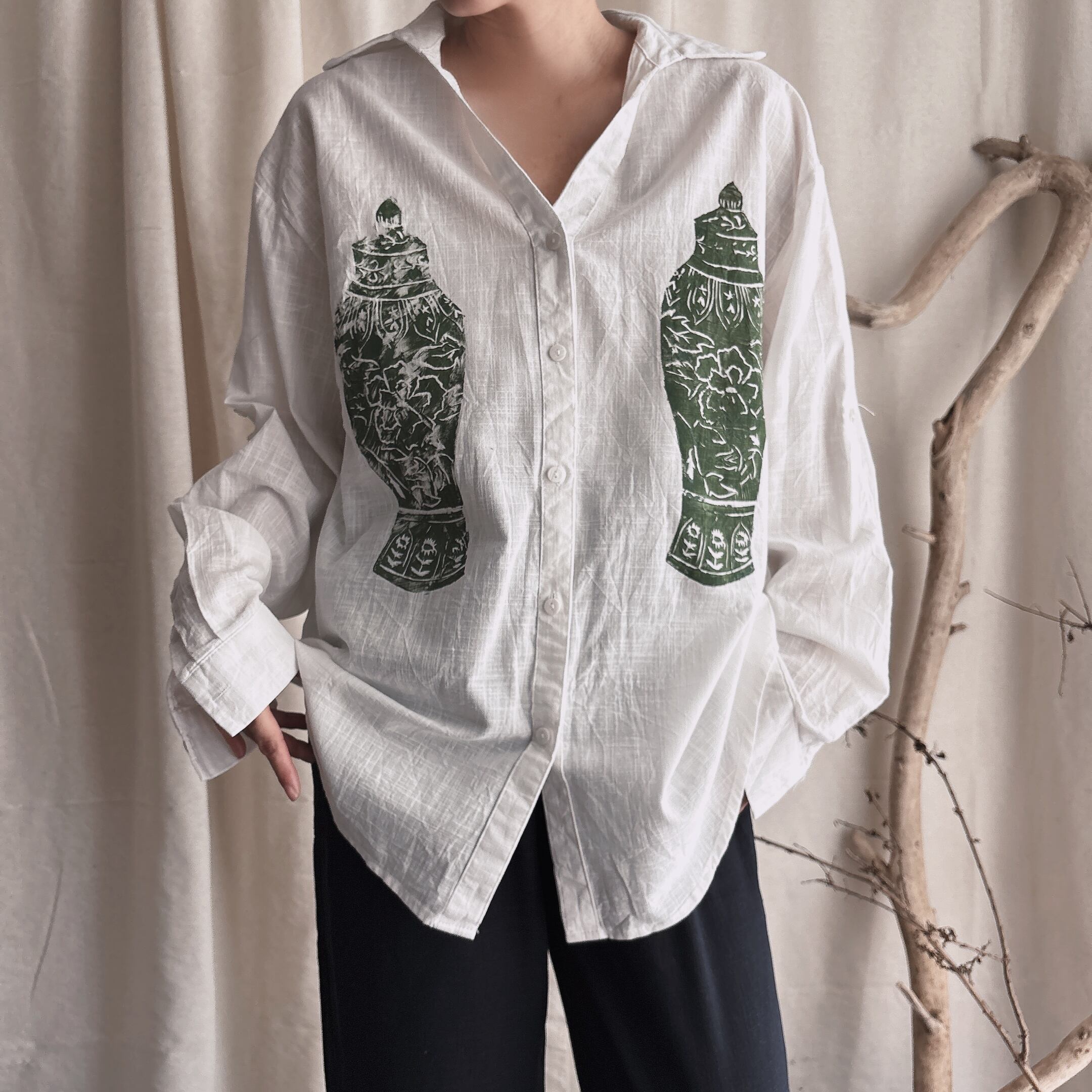 琉球王朝時代の壺を手彫りし服に押してます⭐︎