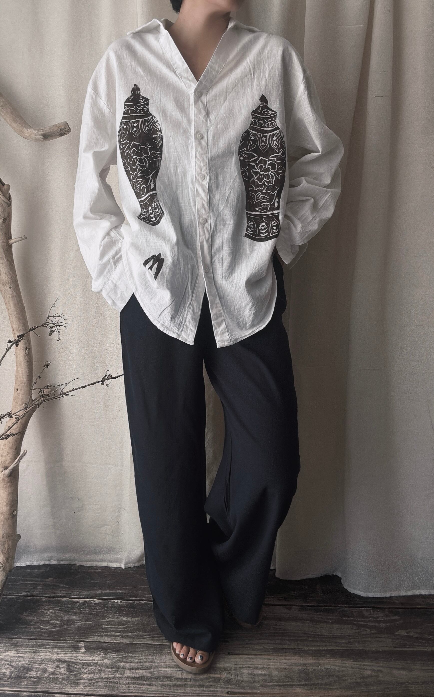 琉球王朝時代の壺を手彫りし服に押してます⭐︎