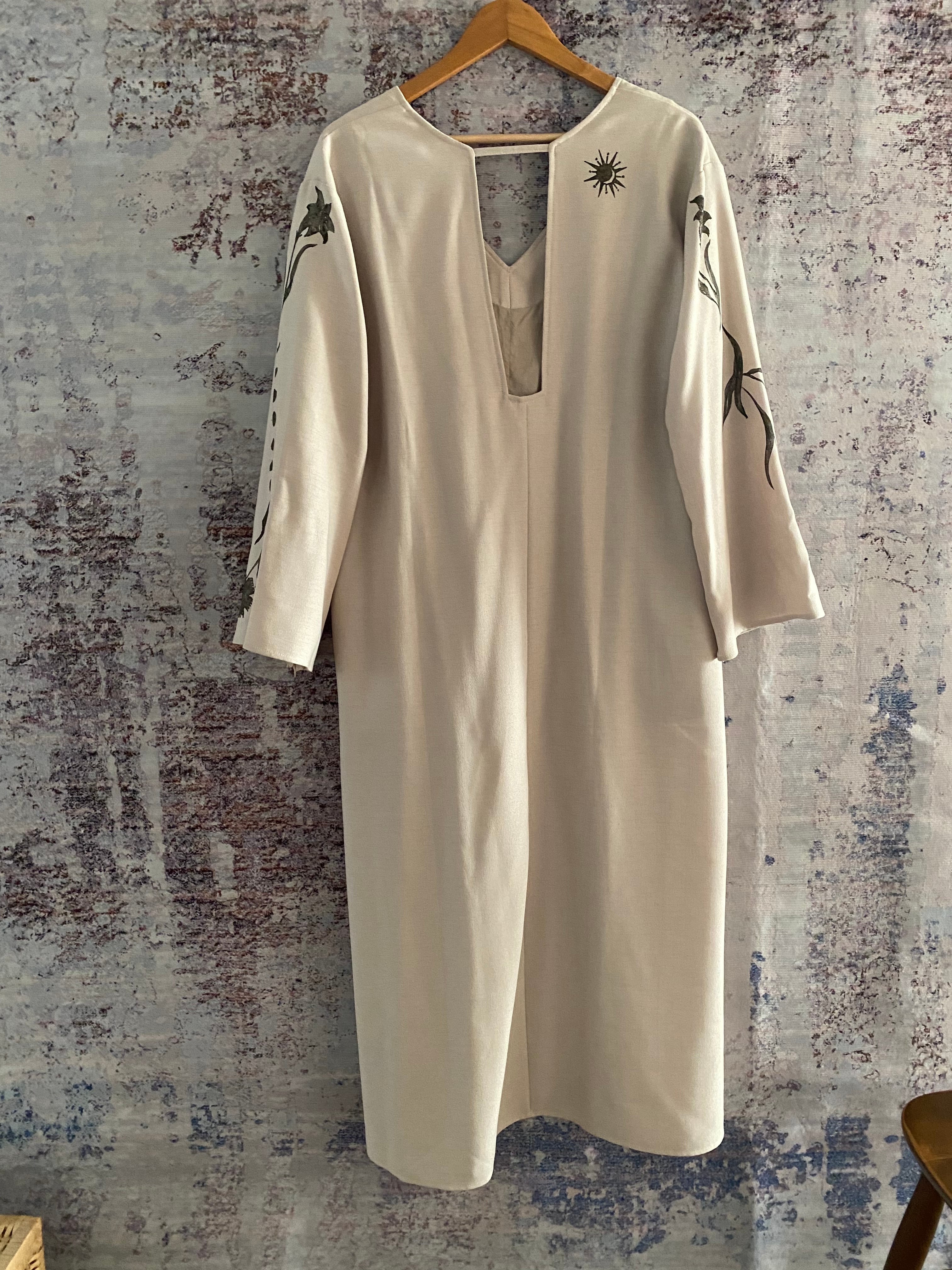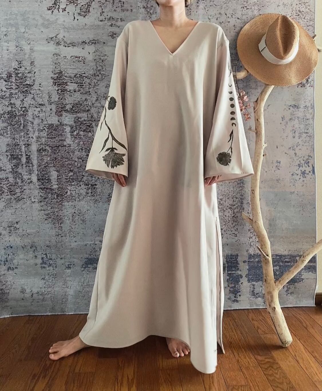 花柄月星Vネックカフタンロングワンピース古着レディース ブロックプリント