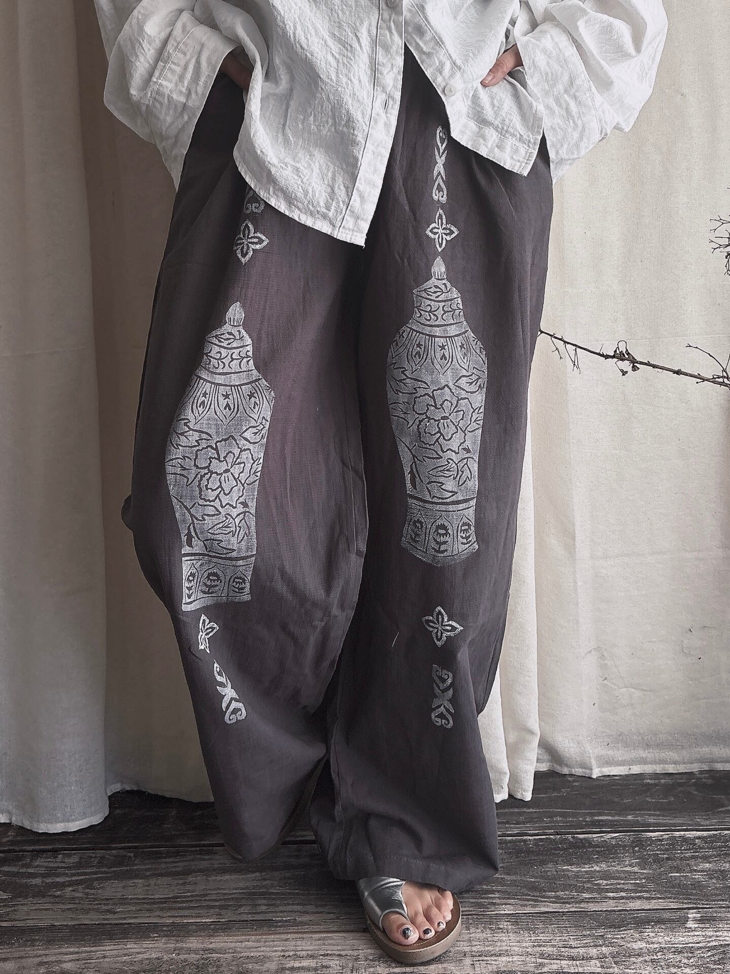 琉球王朝時代の壺を手彫りして服にプリントしてます。麻のパンツで、チャコールグレーがまたいいです