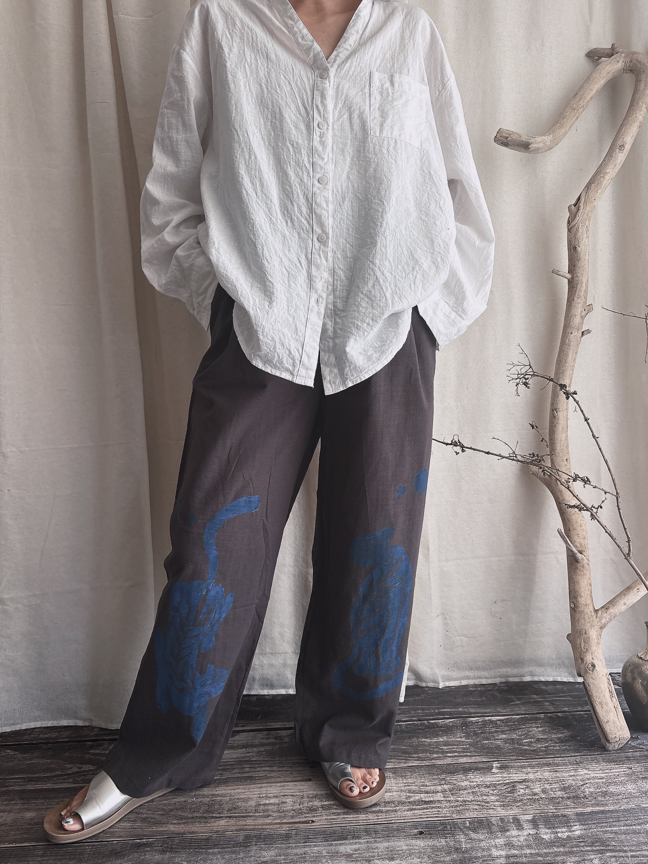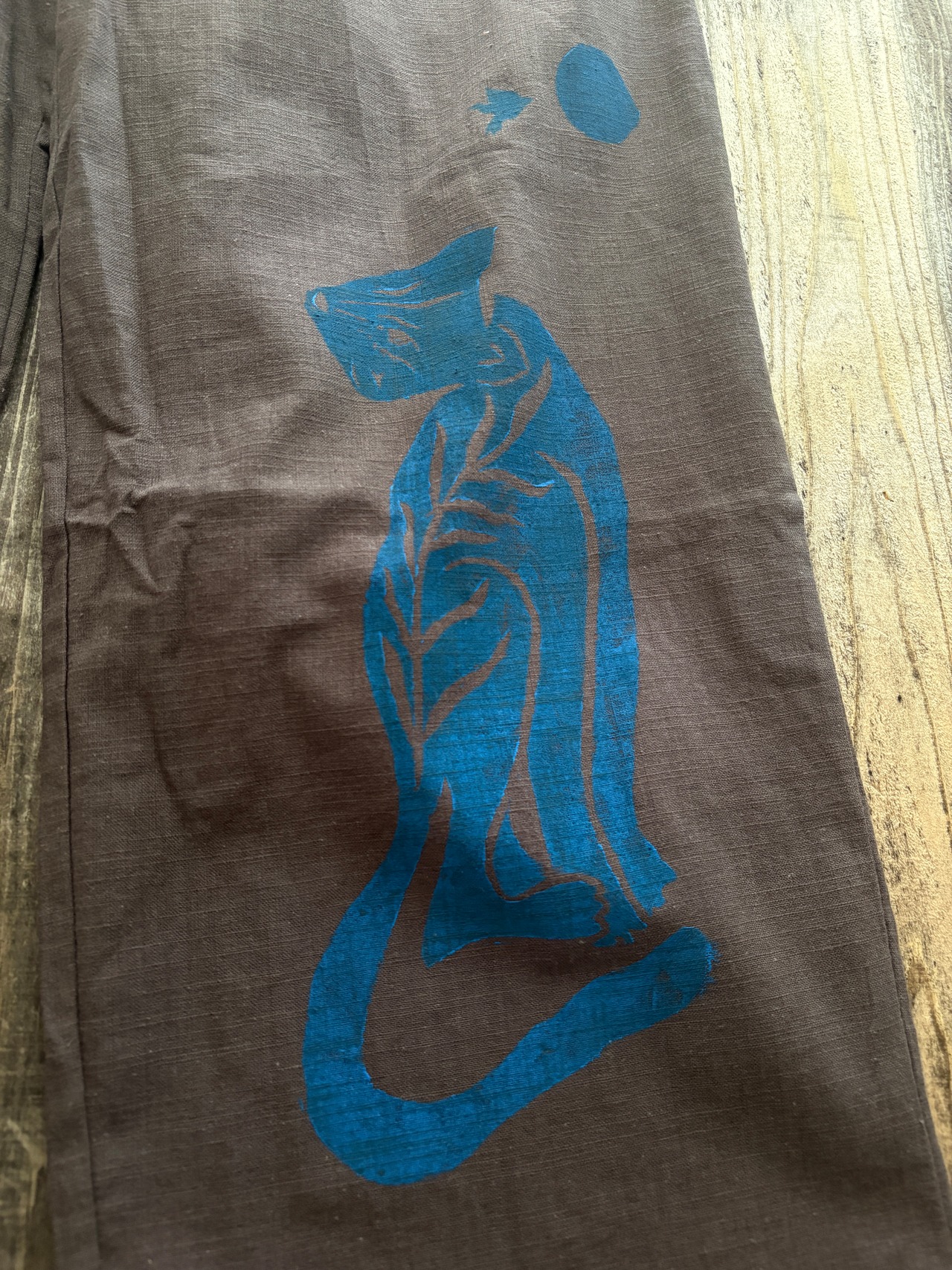 イリオモテヤマネコを手彫りして服にプリントしてます。イリオモテヤマネコの背中に入ってるのはチャーギと言って神様に供える葉になり、花言葉は「慈愛」になります。