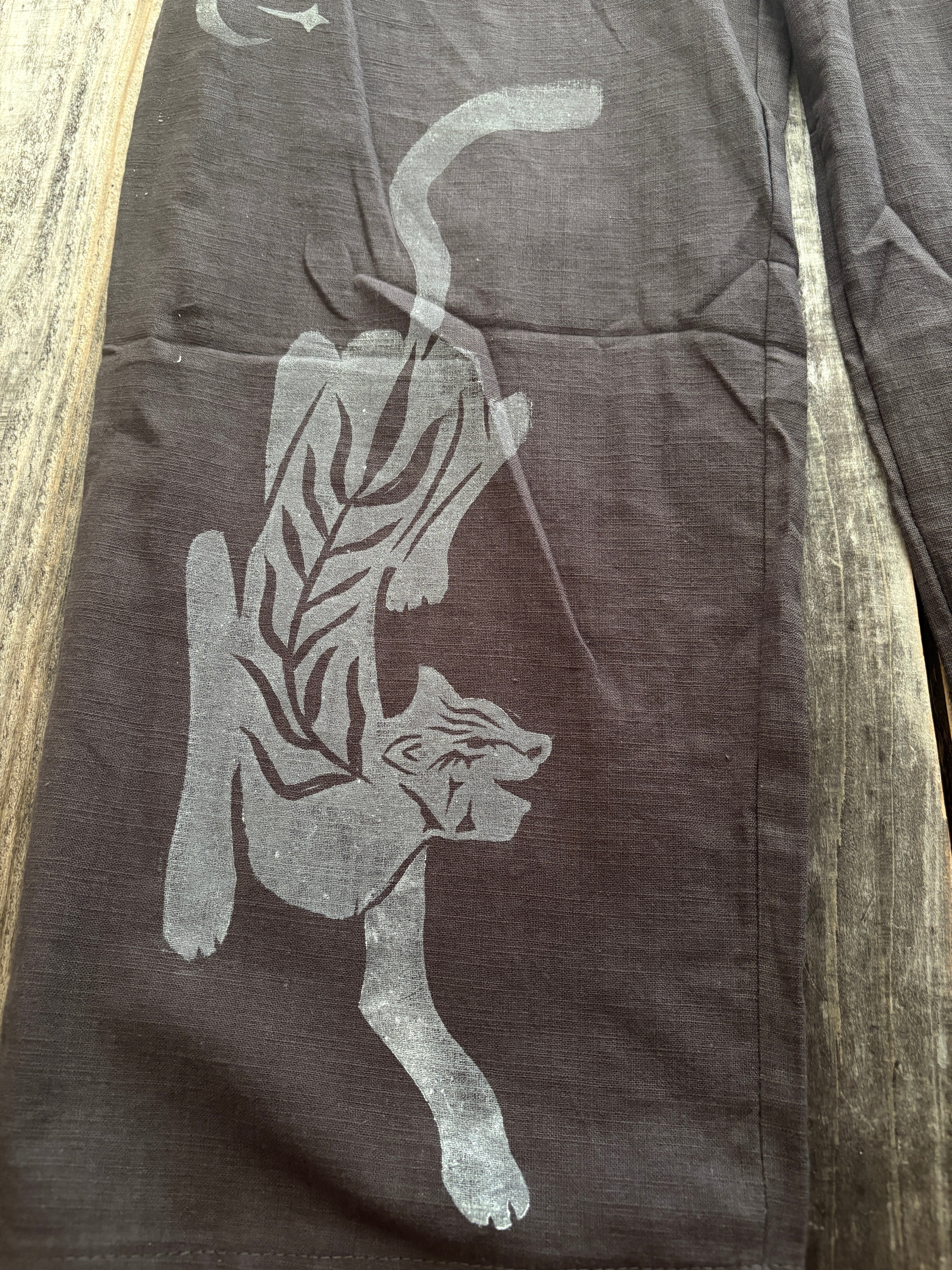 イリオモテヤマネコを手彫りして服にプリントしてます。イリオモテヤマネコの背中に入ってるのはチャーギと言って神様に供える葉になり、花言葉は「慈愛」になります。