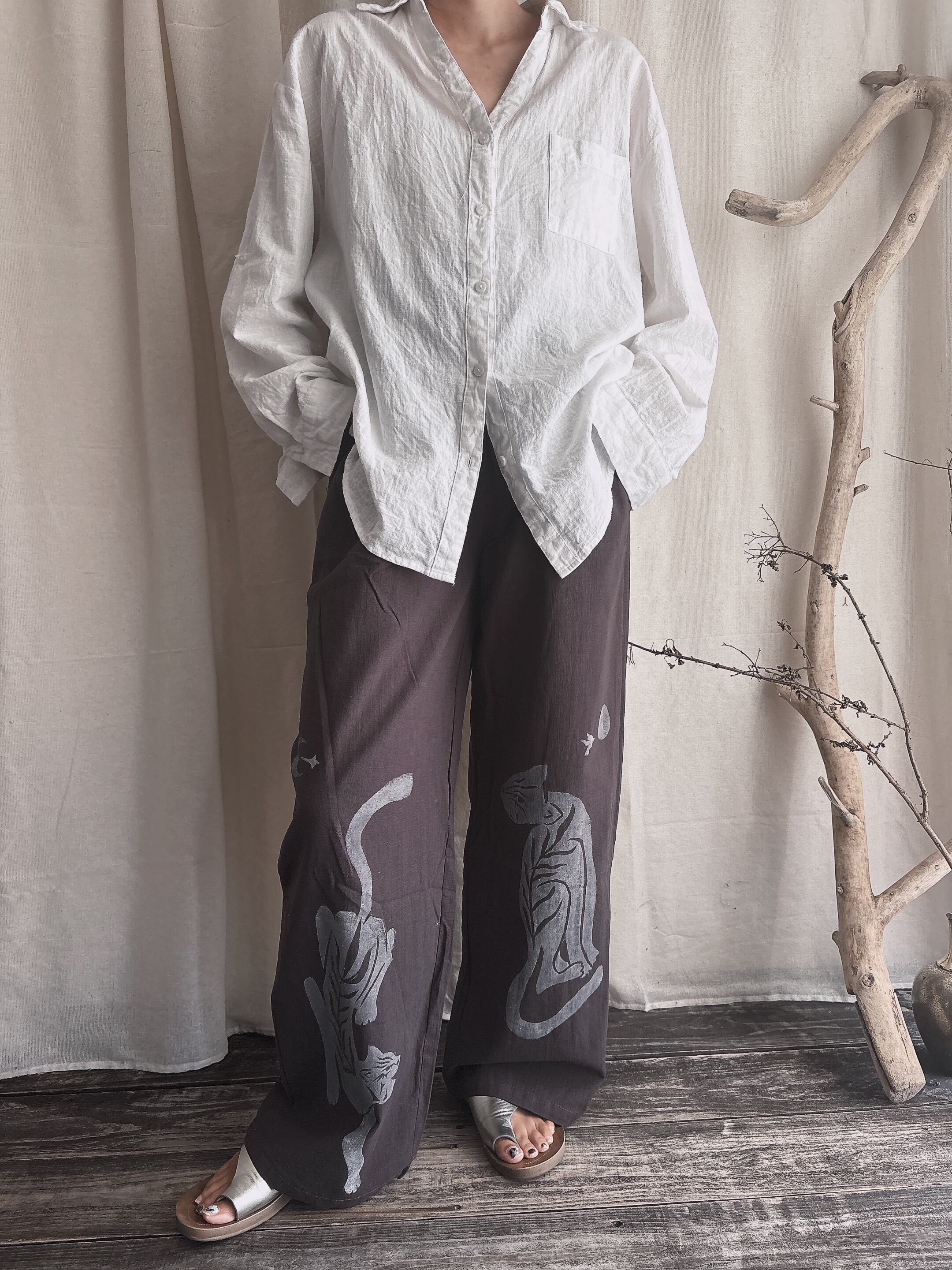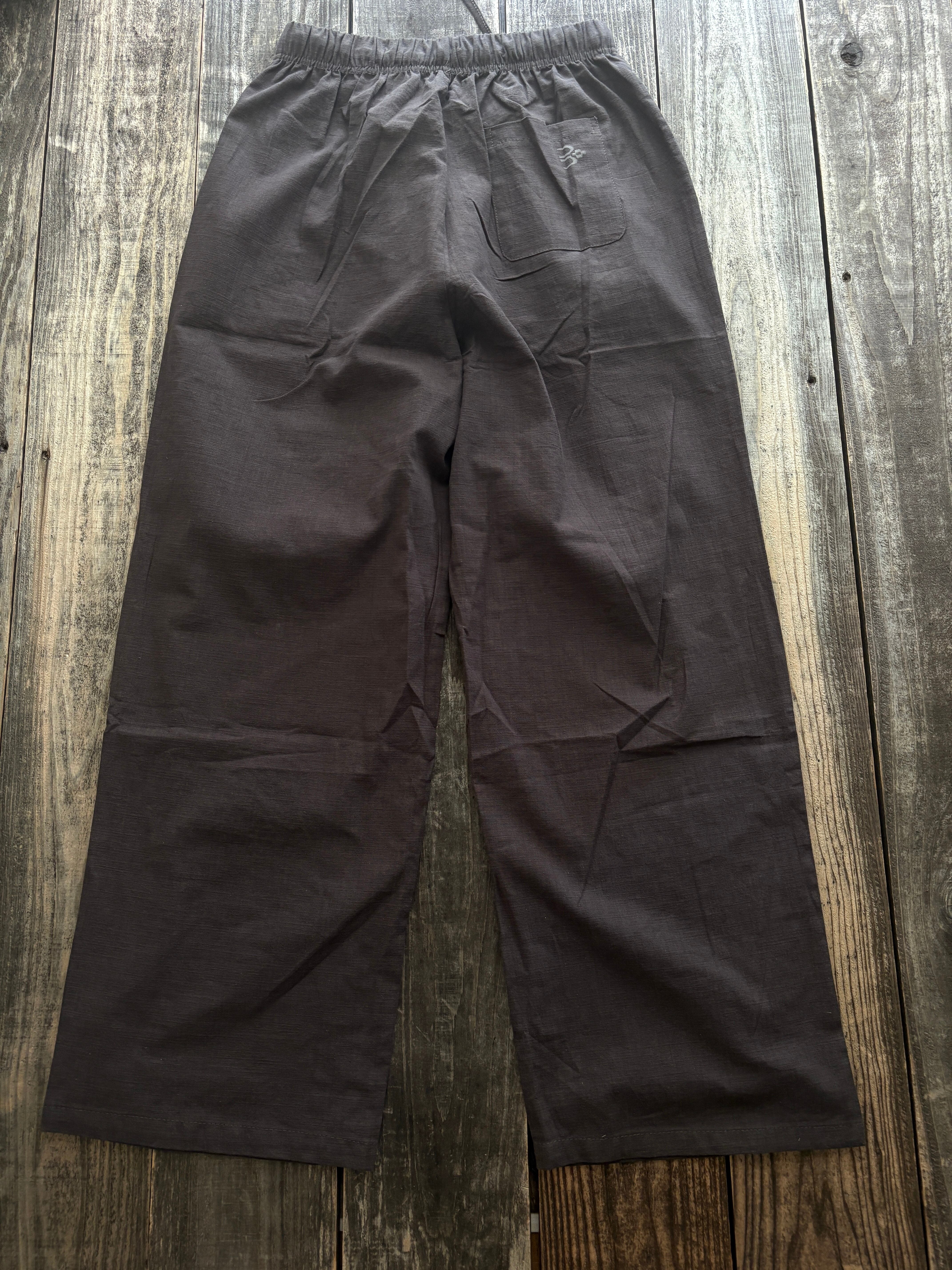 麻のパンツで、チャコールグレーがまたいいです