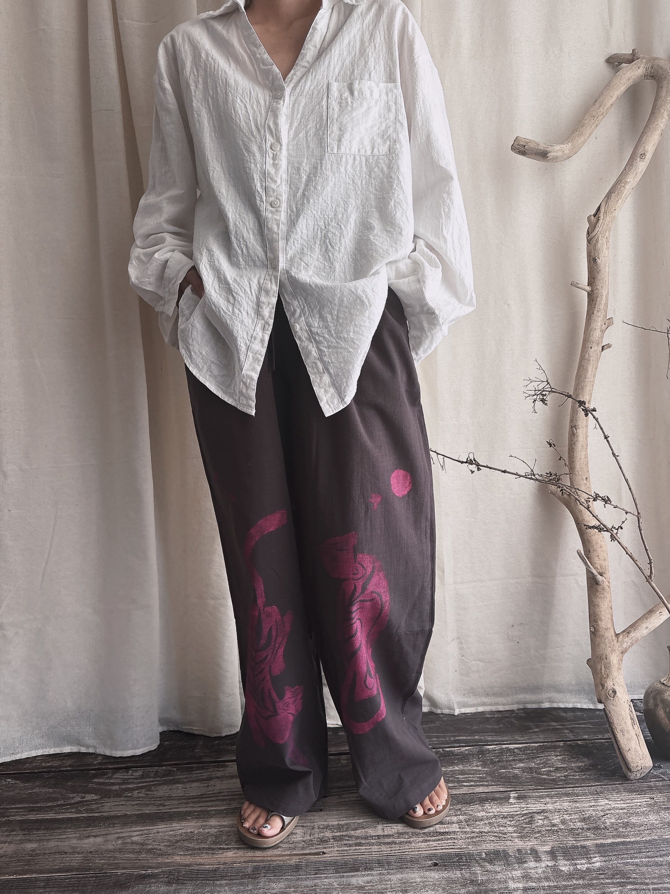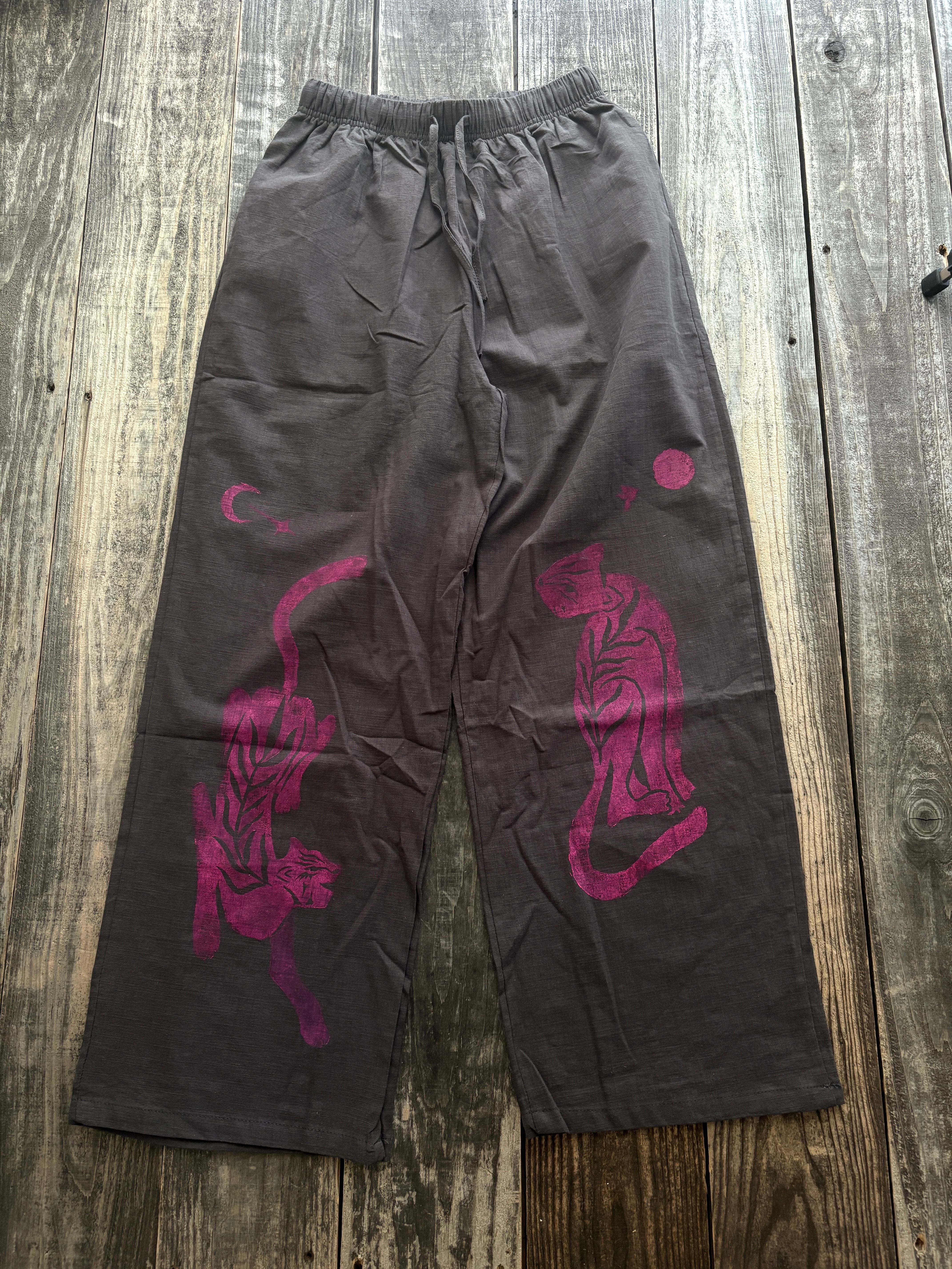 麻 リネン パンツ ブロックプリント猫 総柄 リメイク ハンドメイド