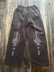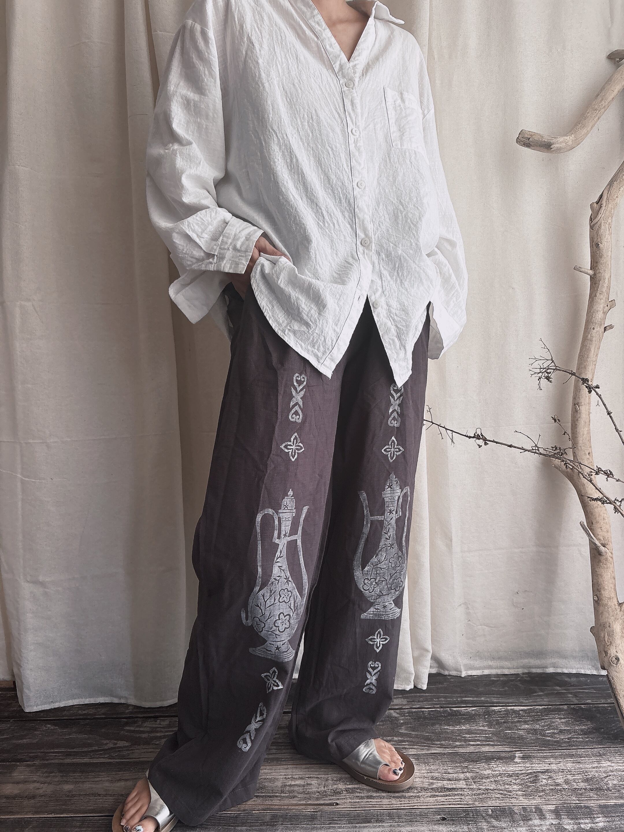 琉球王朝時代の壺を手彫りして服にプリントしてます。麻のパンツで、チャコールグレーがまたいいです