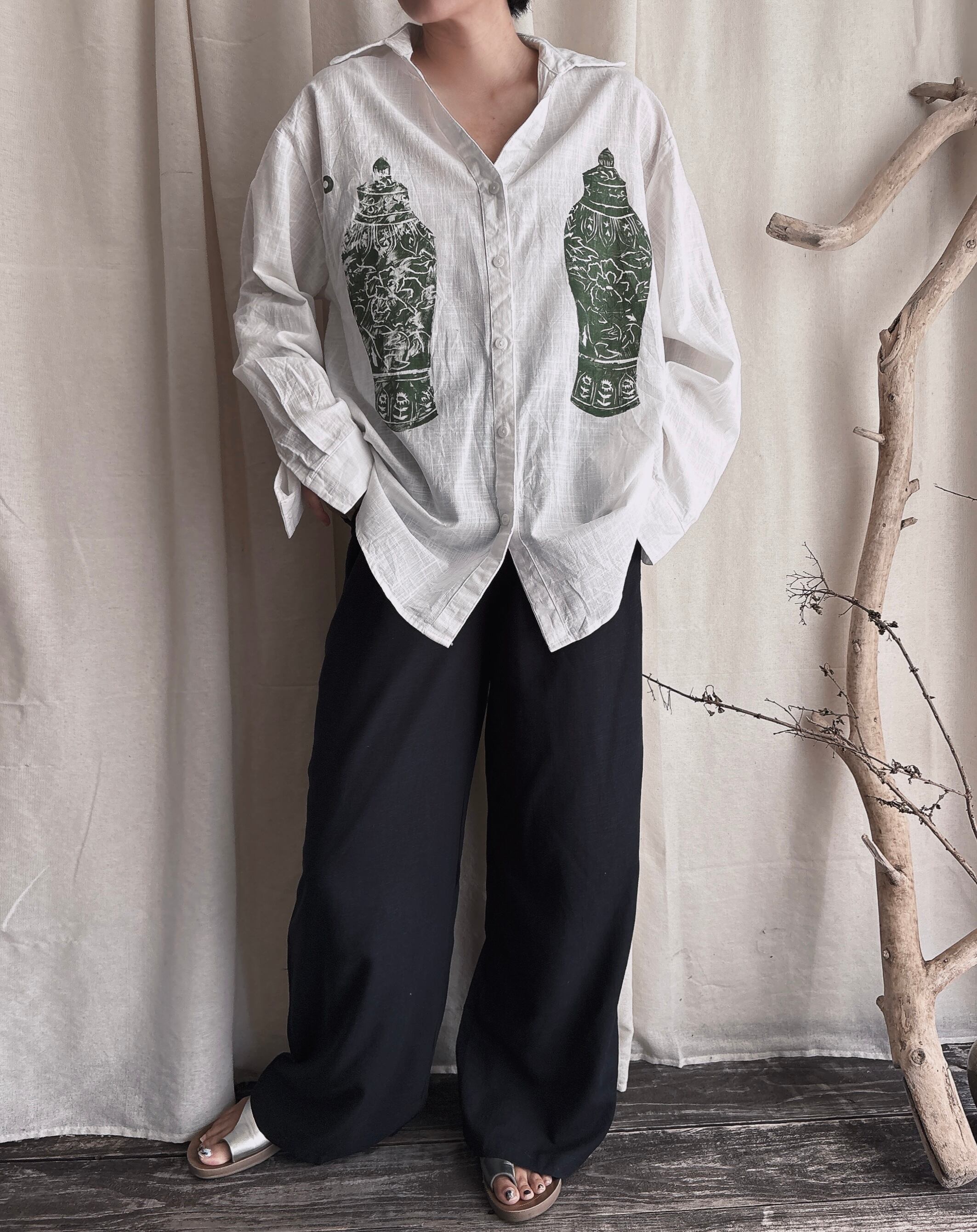 琉球王朝時代の壺を手彫りし服に押してます⭐︎