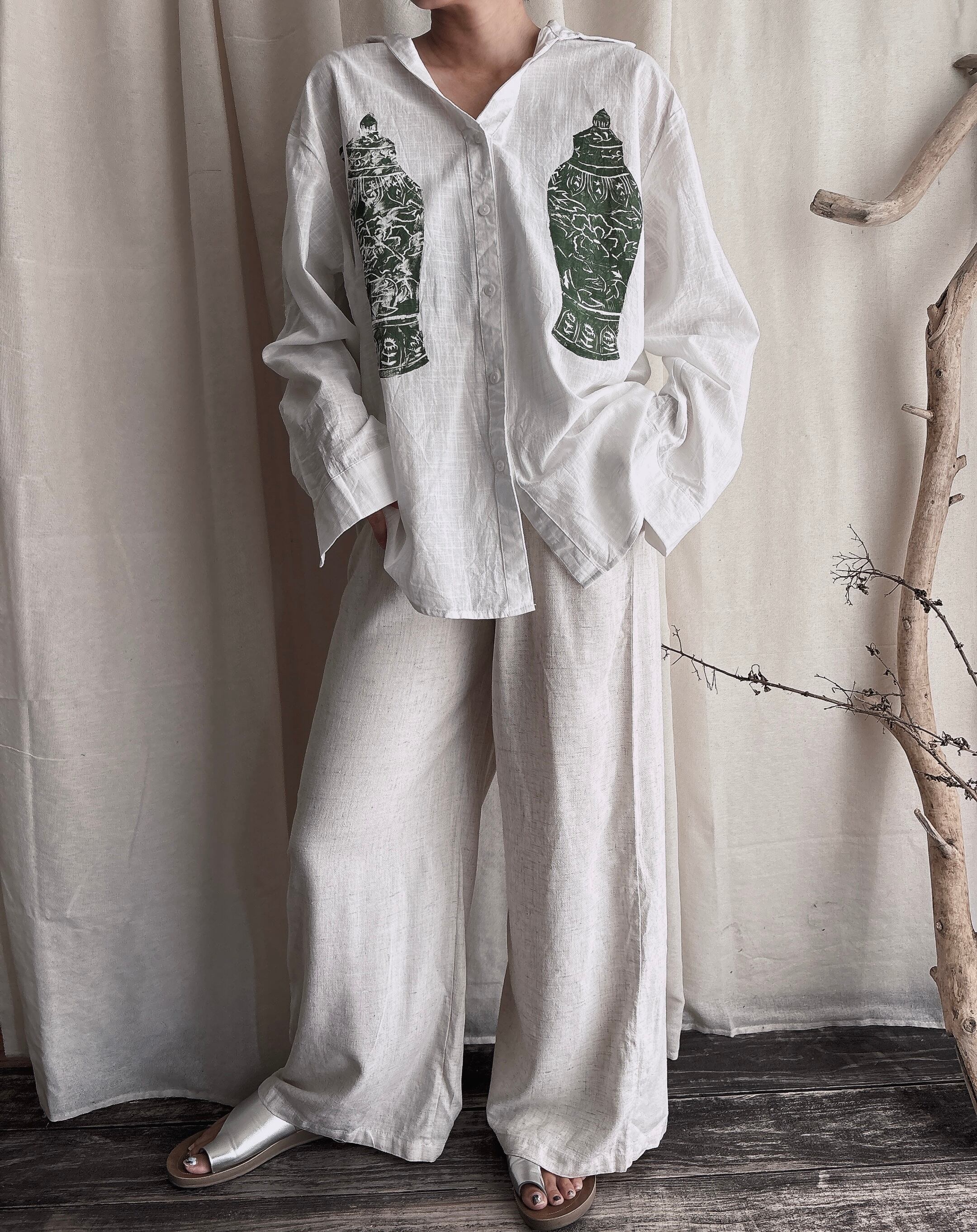 麻 リネン コットンシャツ 長袖 ブラウス 柄