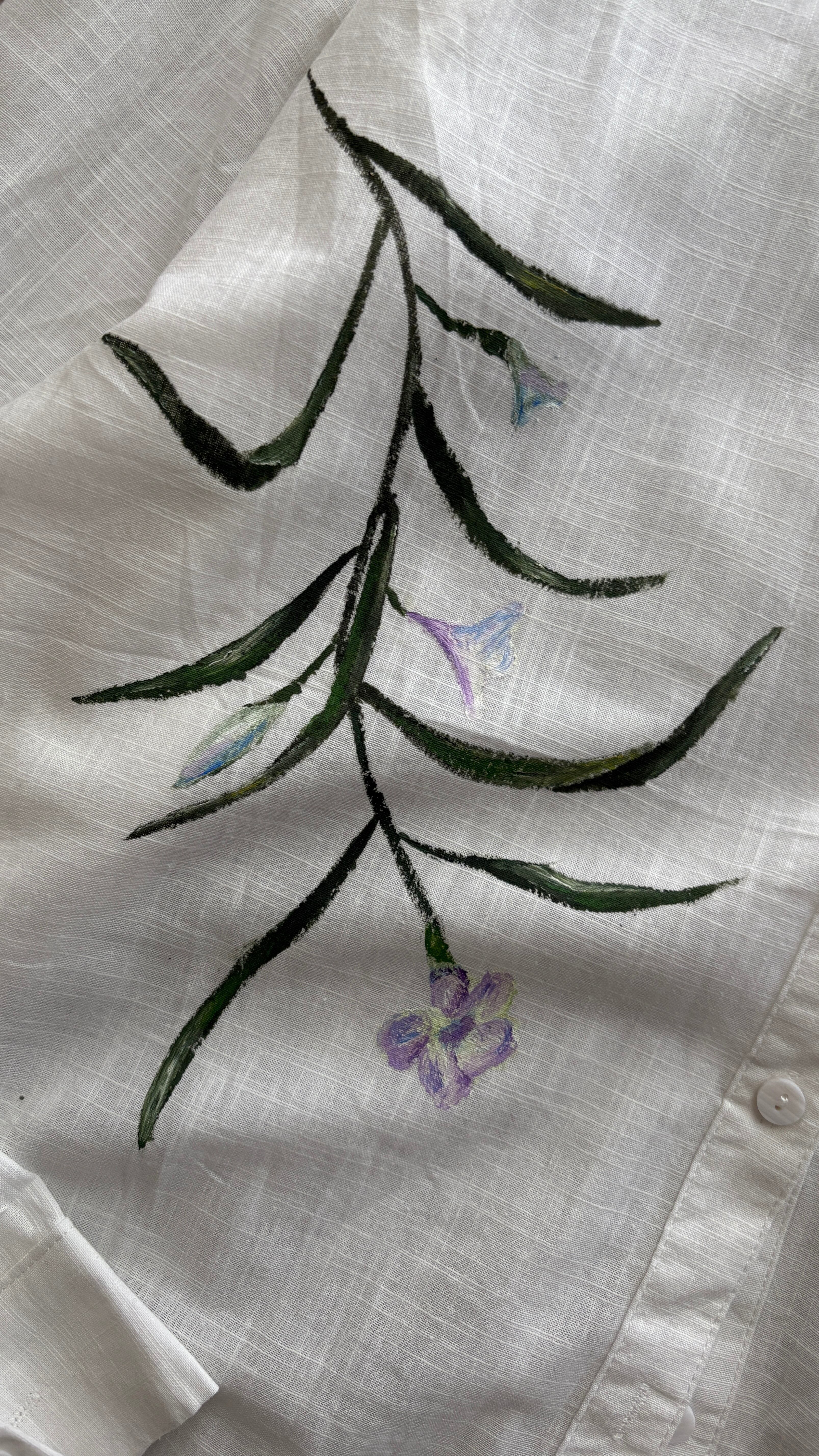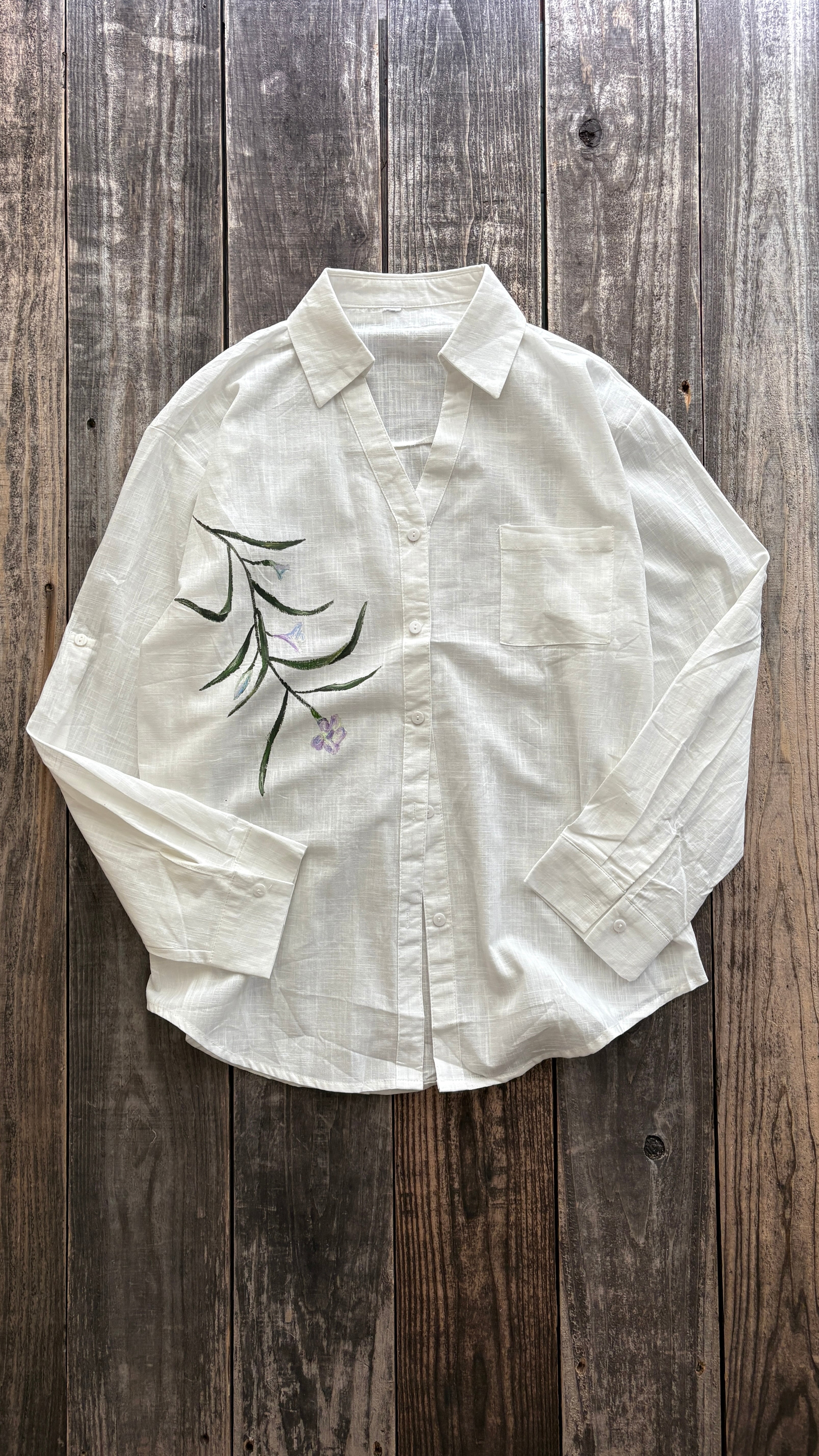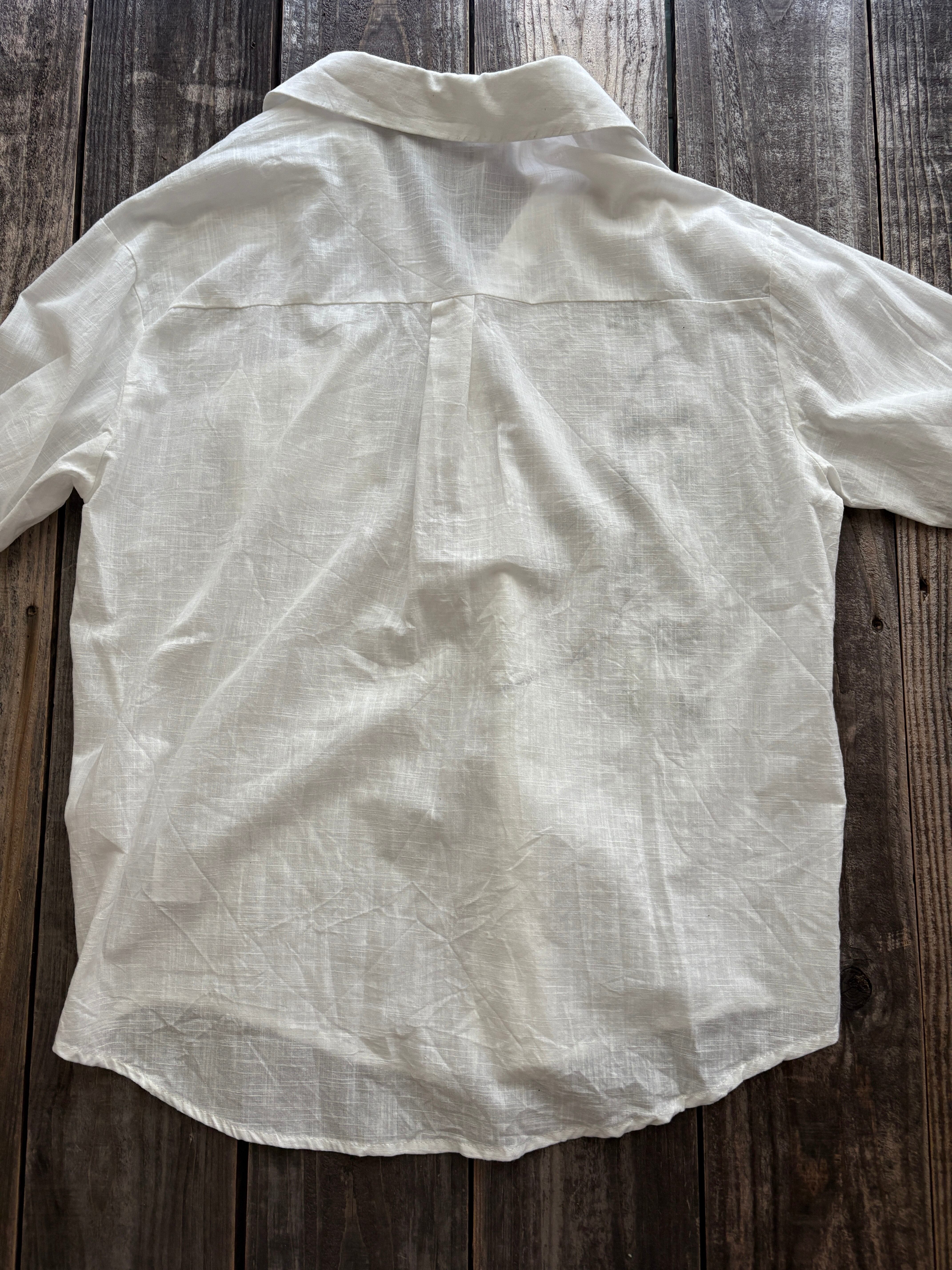 首の一番上のボタンは付いてなく、リネンコットンの素材で柔らかく、とても着やすくて肌触りいいです⭐︎