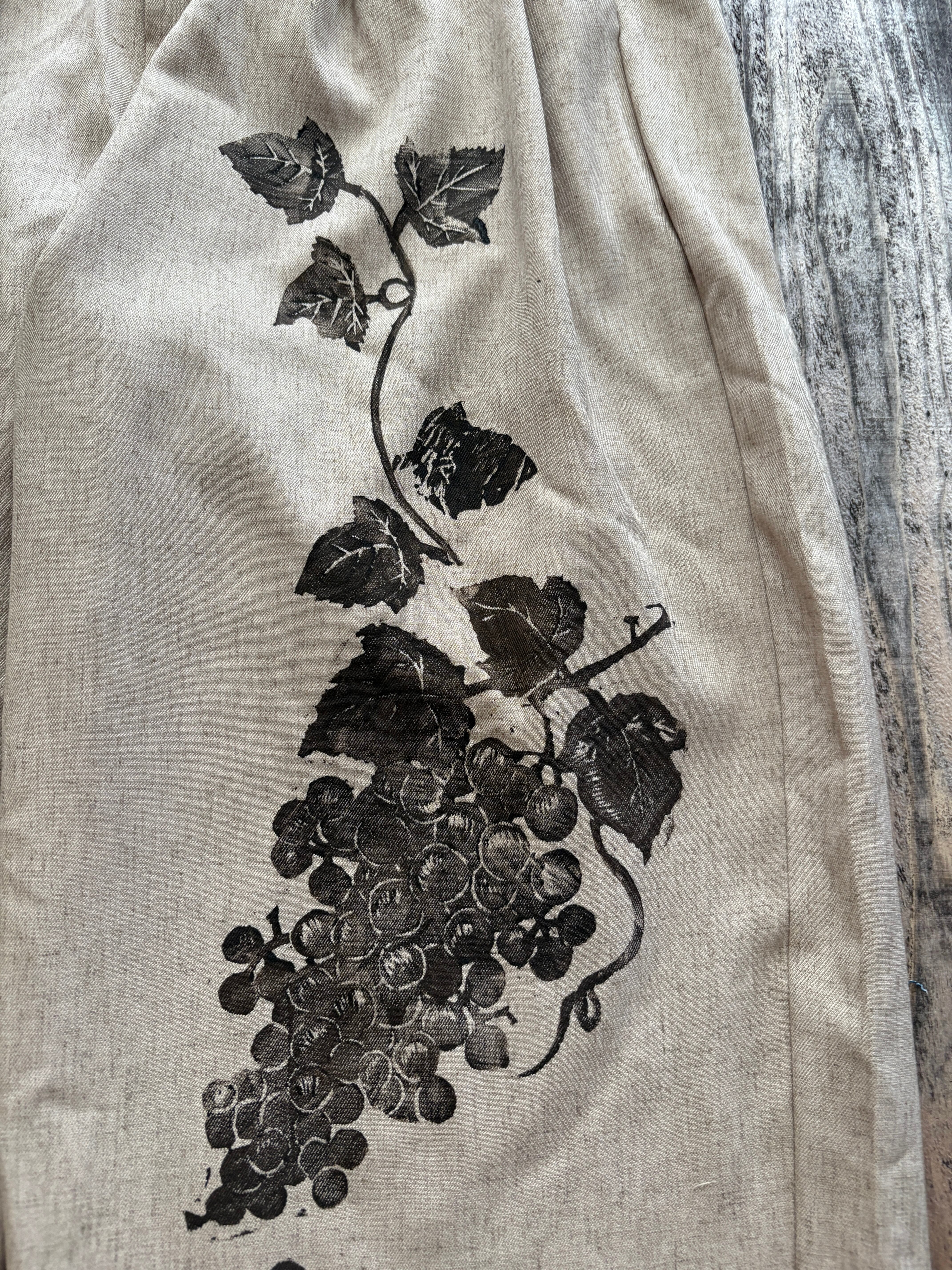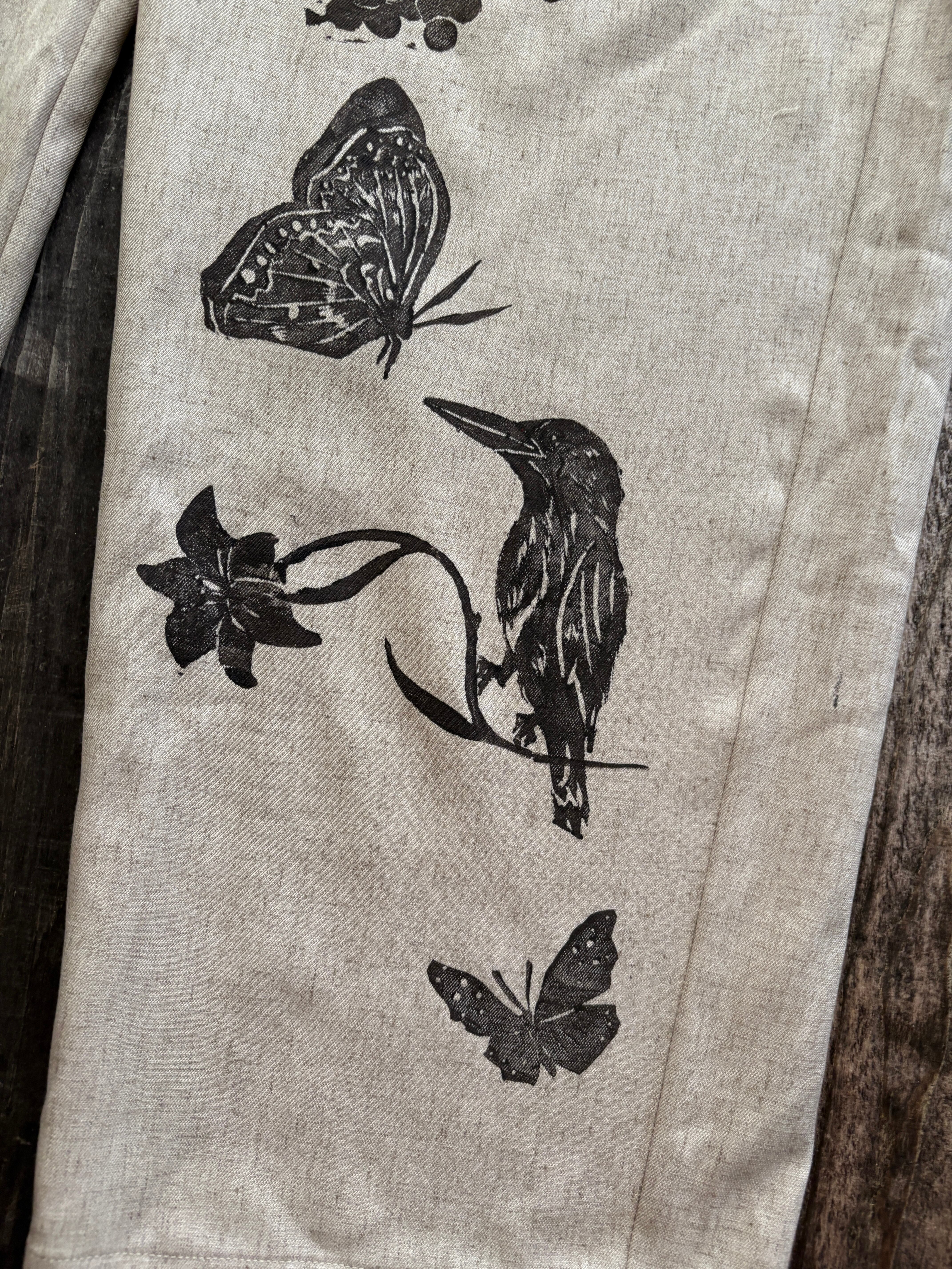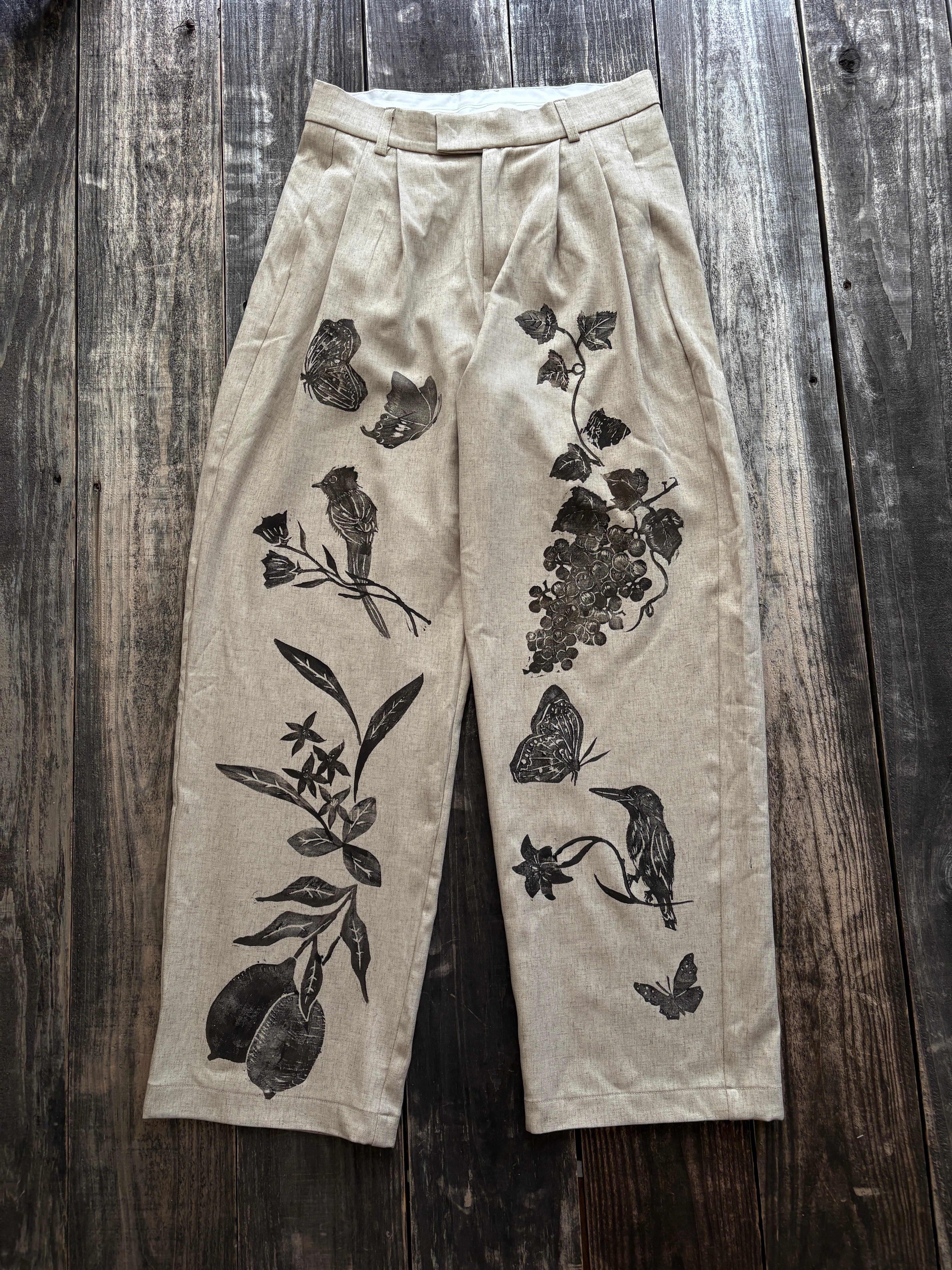 沖縄にちなんだ物をシルクスクリーンではなく、手彫りした版で一つ一つ手作業で服にプリントしてます