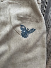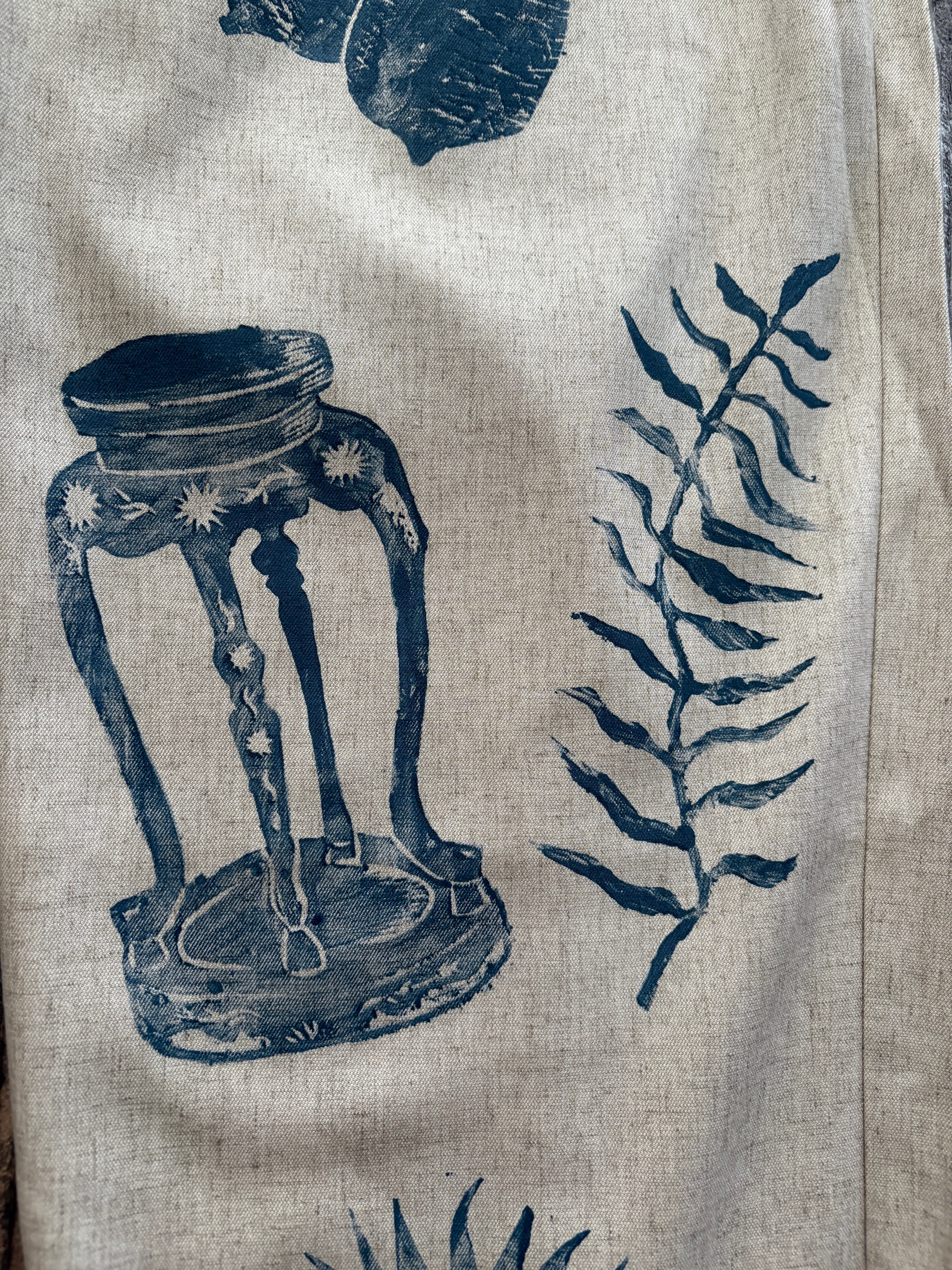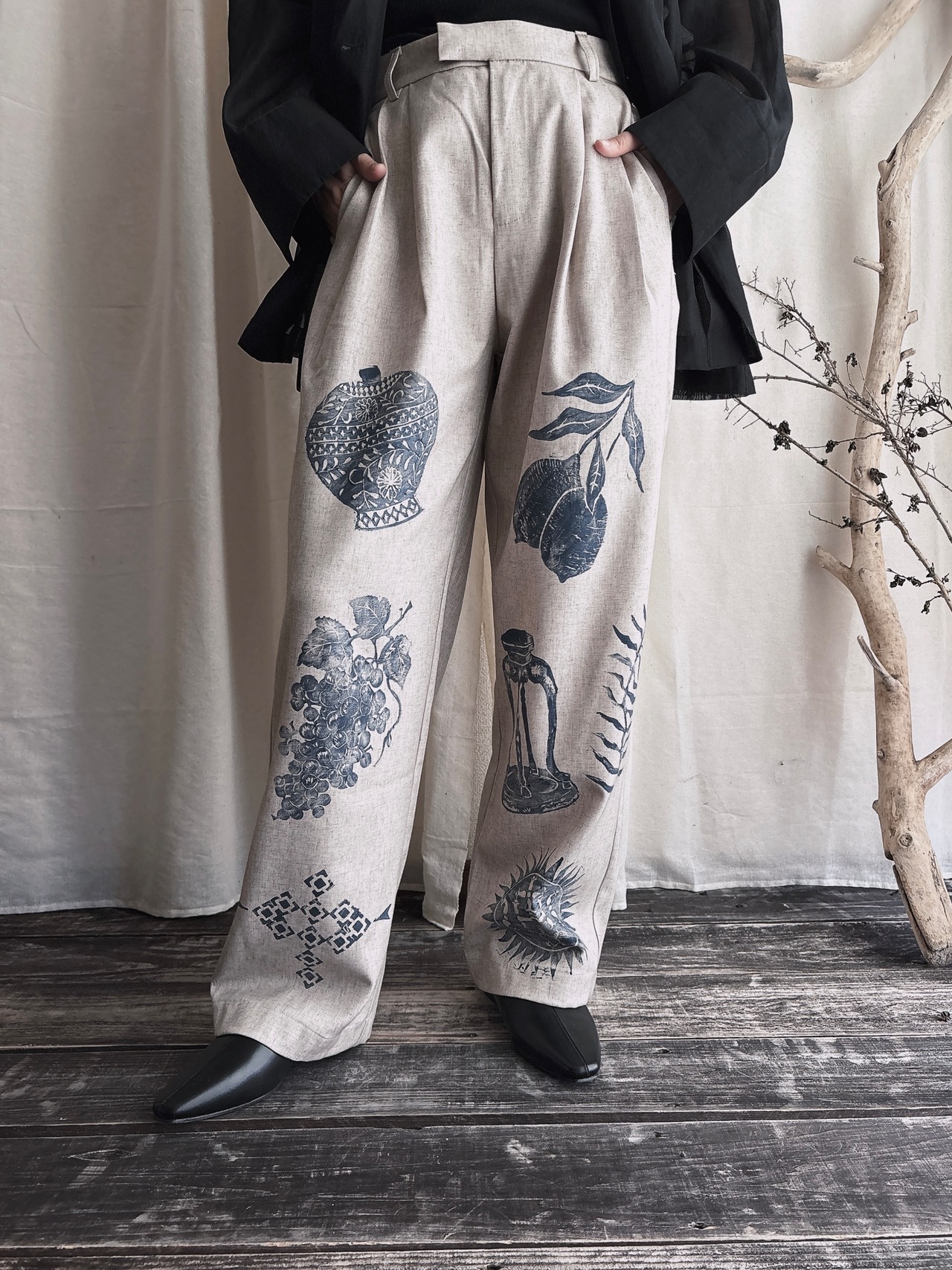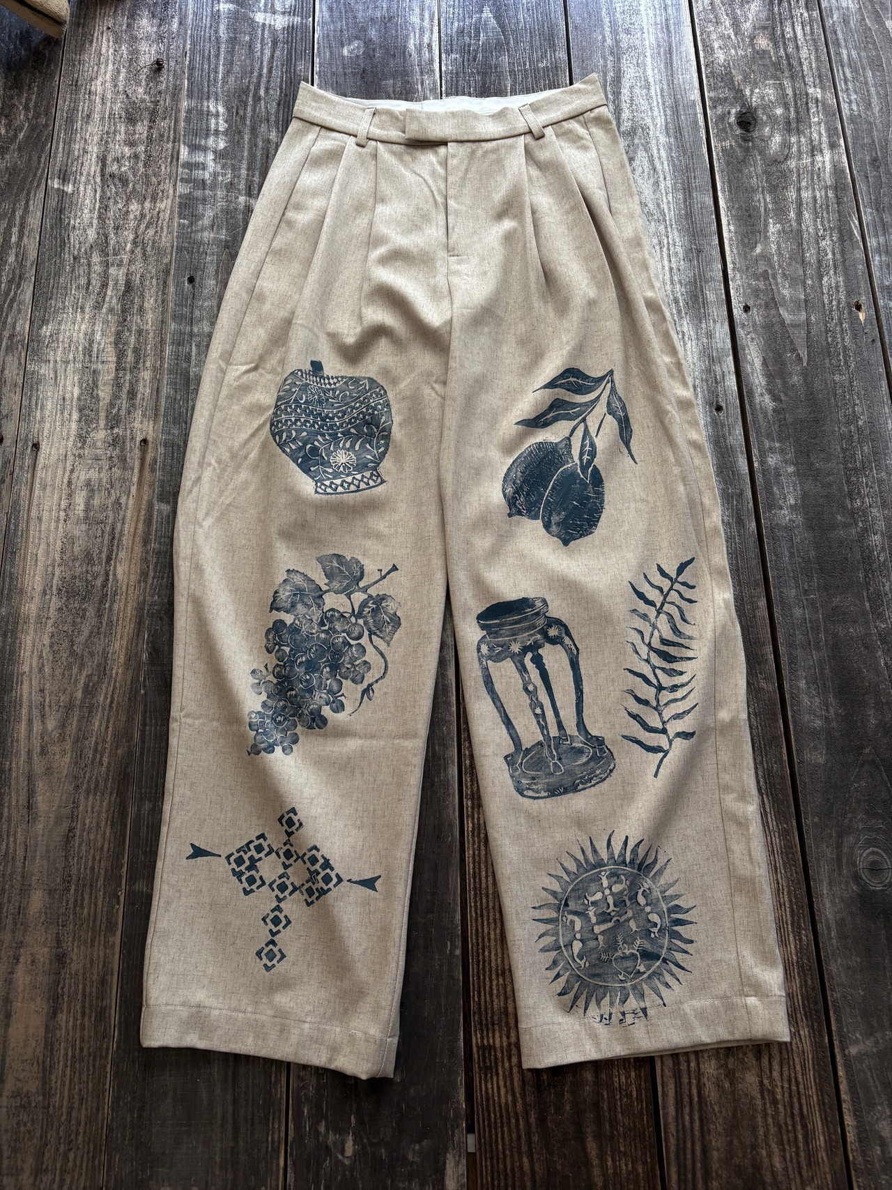 沖縄にちなんだ物をシルクスクリーンではなく、手彫りした版で一つ一つ手作業で服にプリントしてます