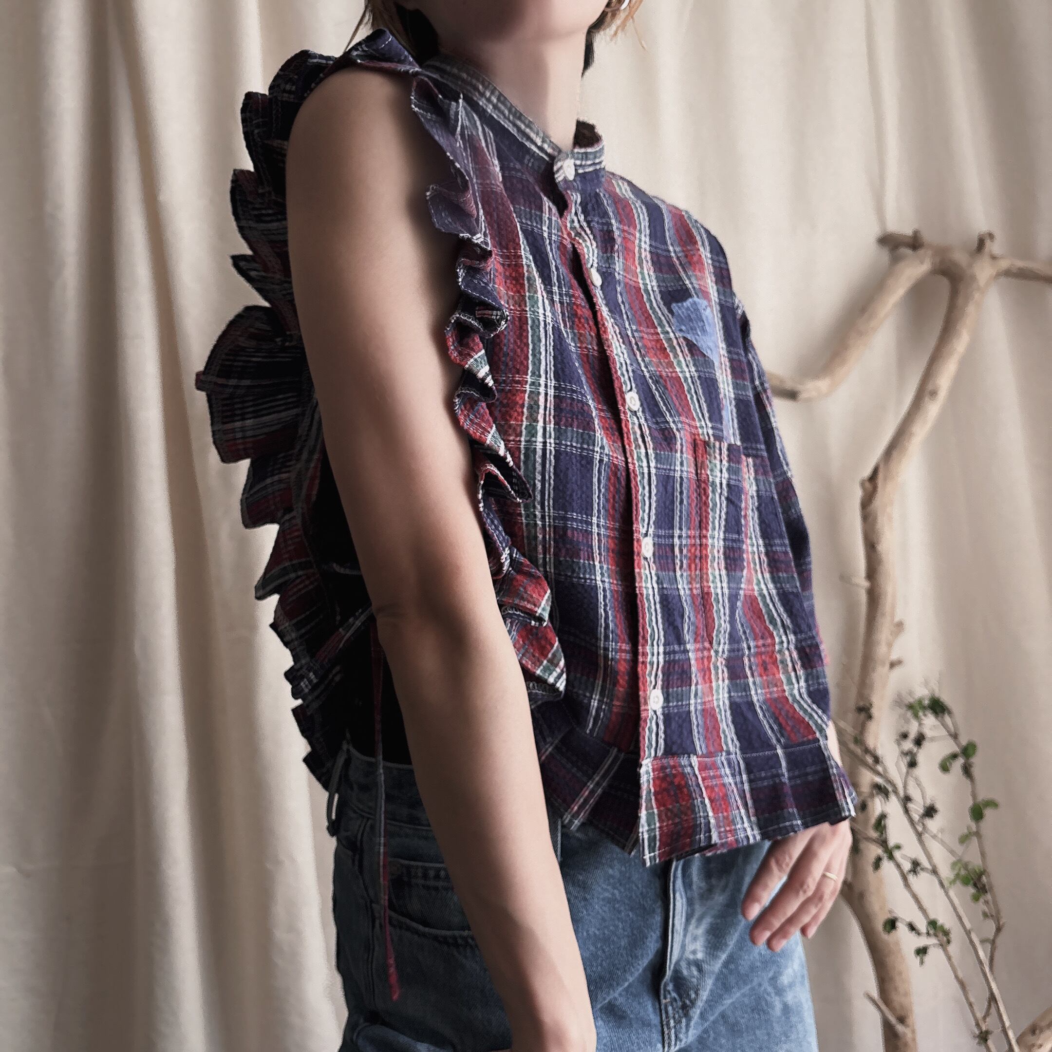 フリルとリボンがめちゃくちゃチェックに合ってて可愛い⭐︎私はいかり肩で肩幅広めなので若干ノースリーブ部分が肩ギリギリでした!もう一つの赤の方は若干長めなのでそちらは気にならなかったです☺️