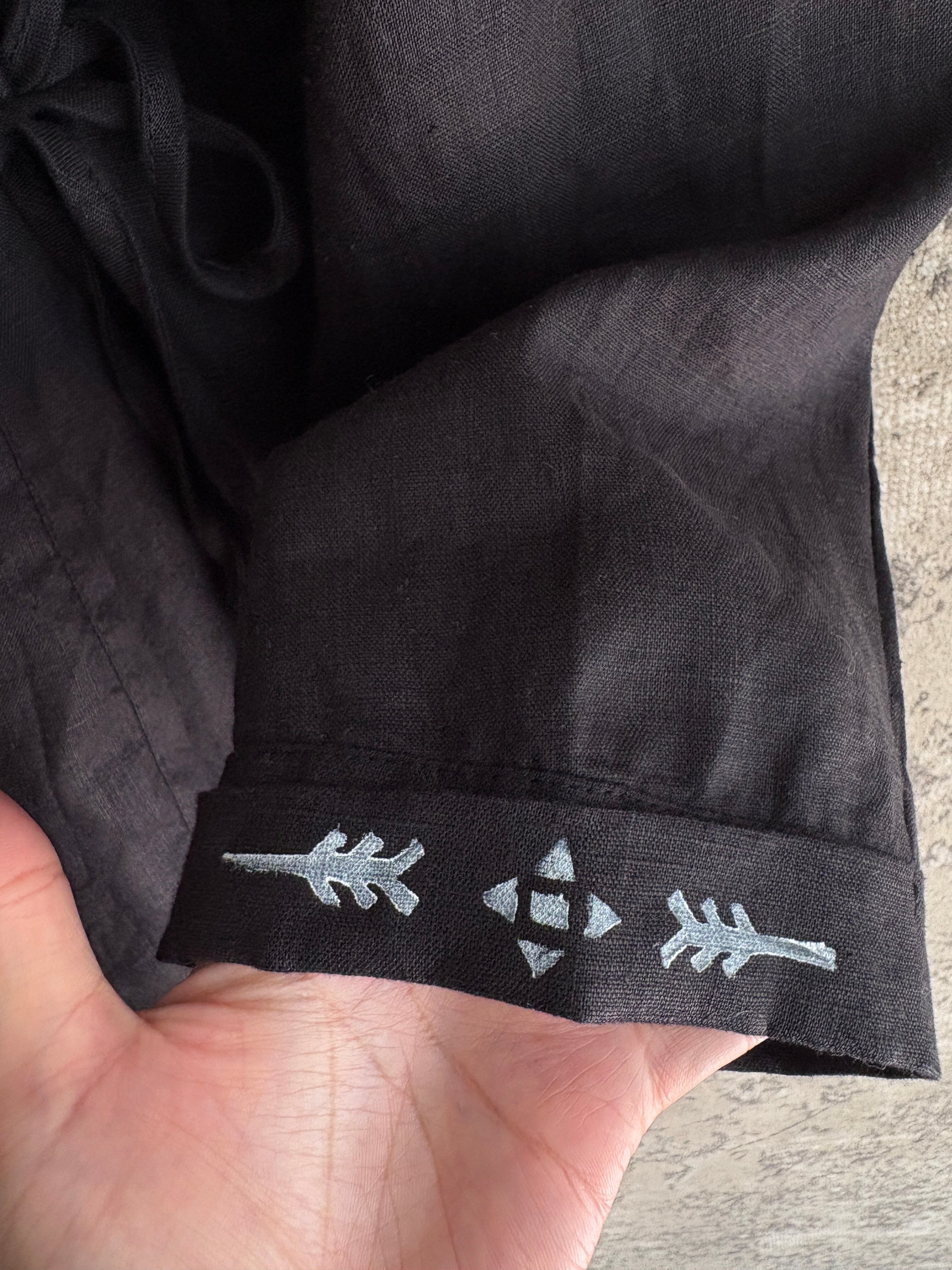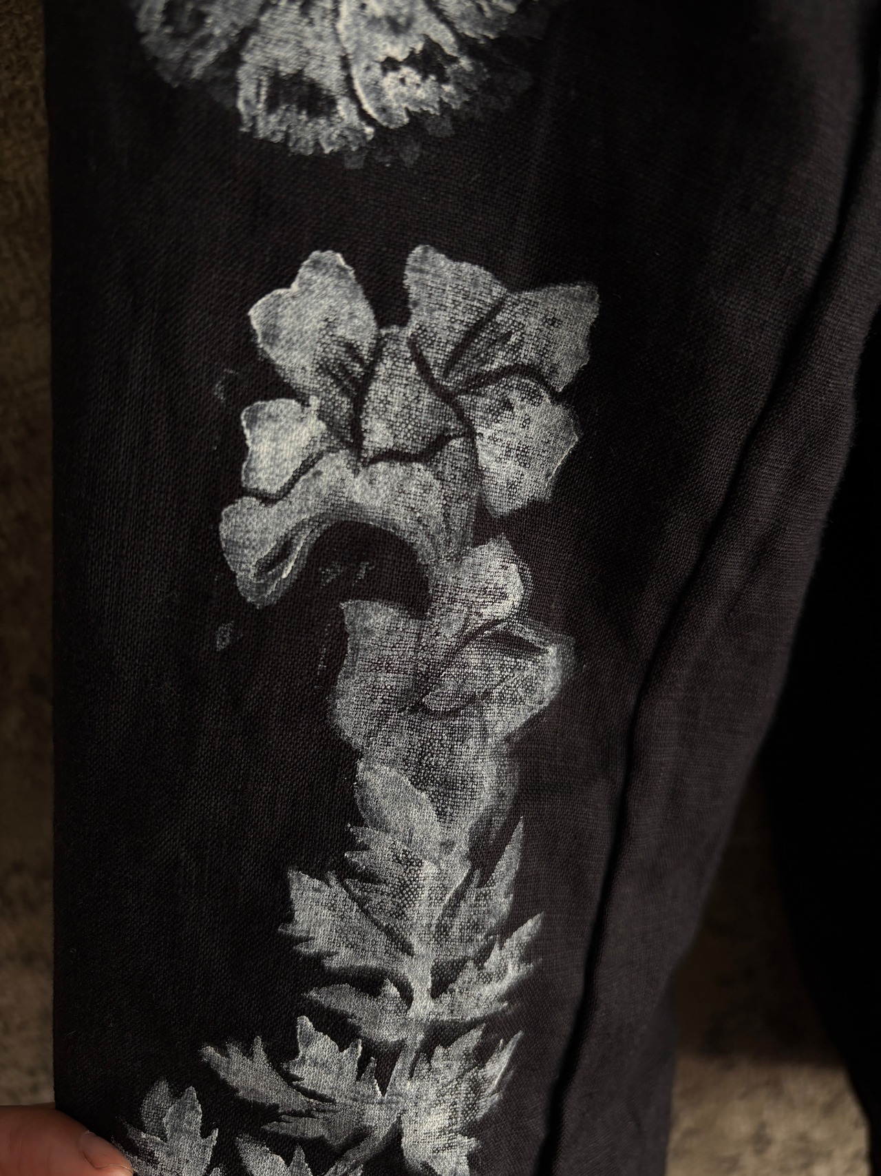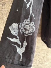 沖縄にちなんだ物をシルクスクリーンではなく、手彫りした版で一つ一つ手作業で服にプリントされてます