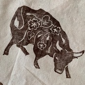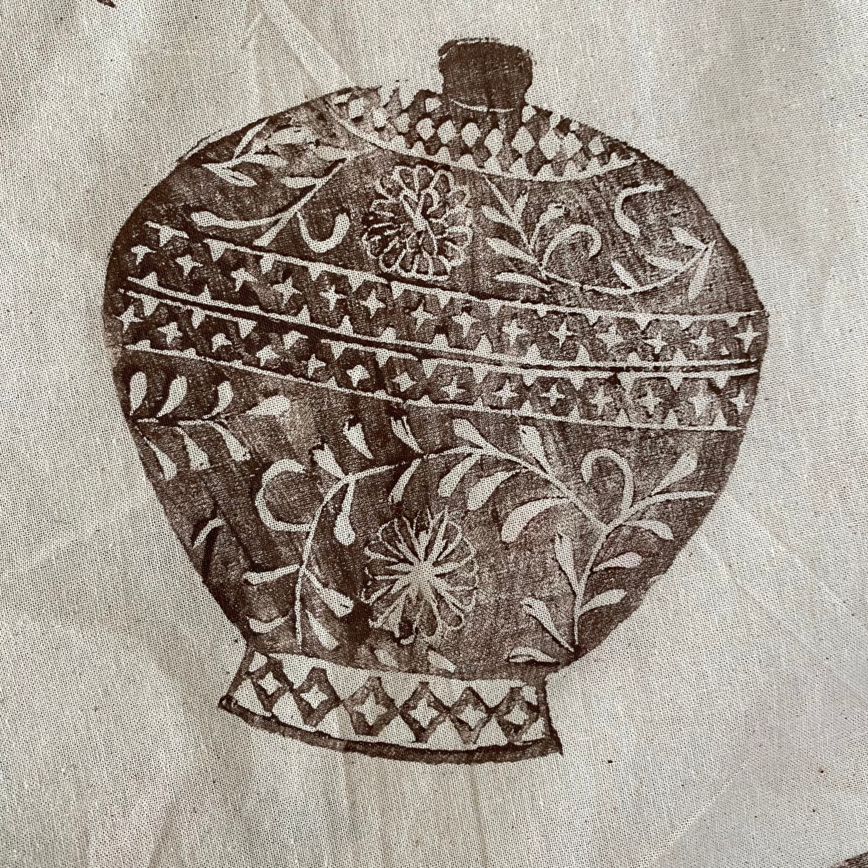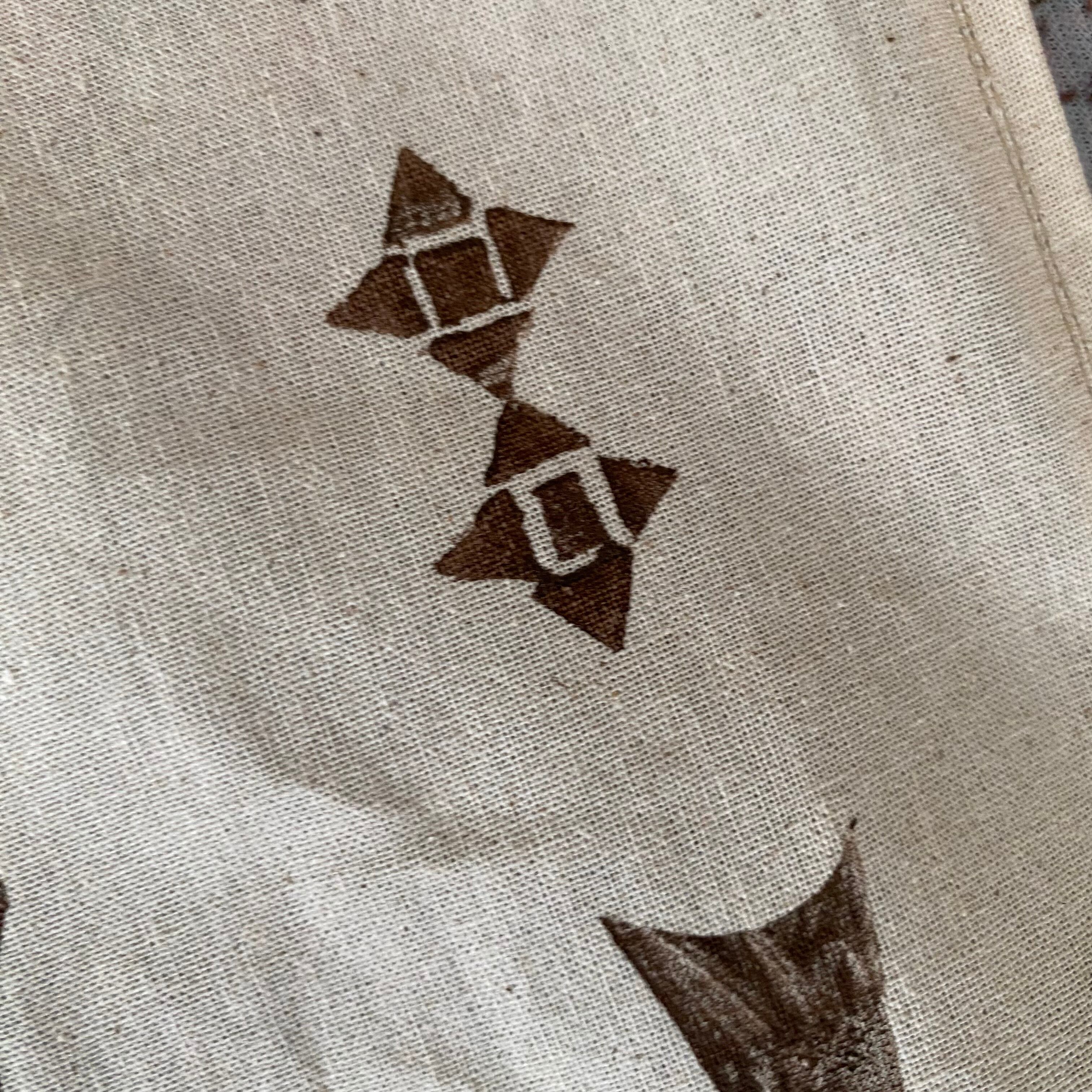 ◉端っこに押されている月の満ち欠けのブロックプリントを囲むように押されてる版は、琉球時代のハヂチと言って、タトゥーになります