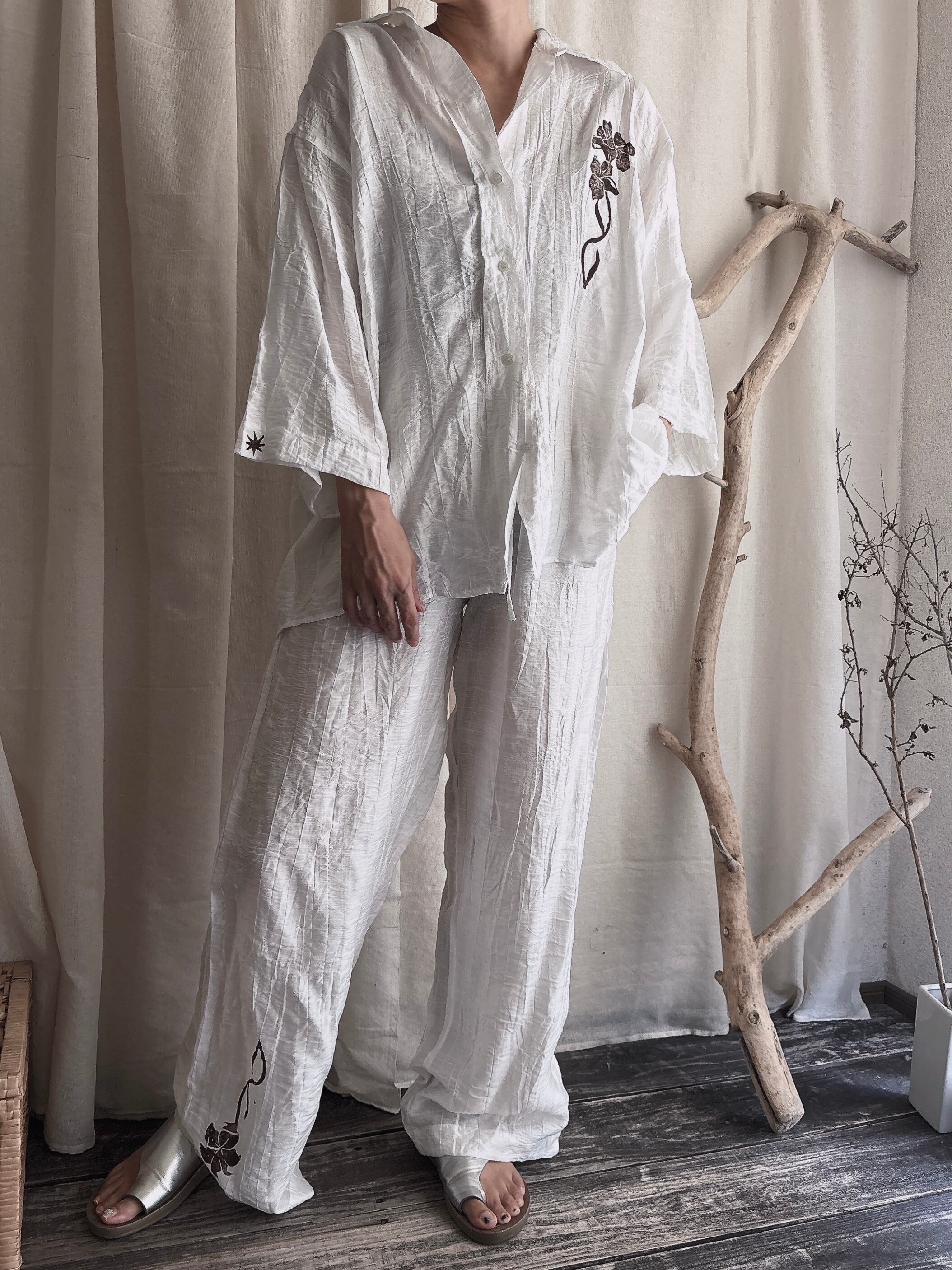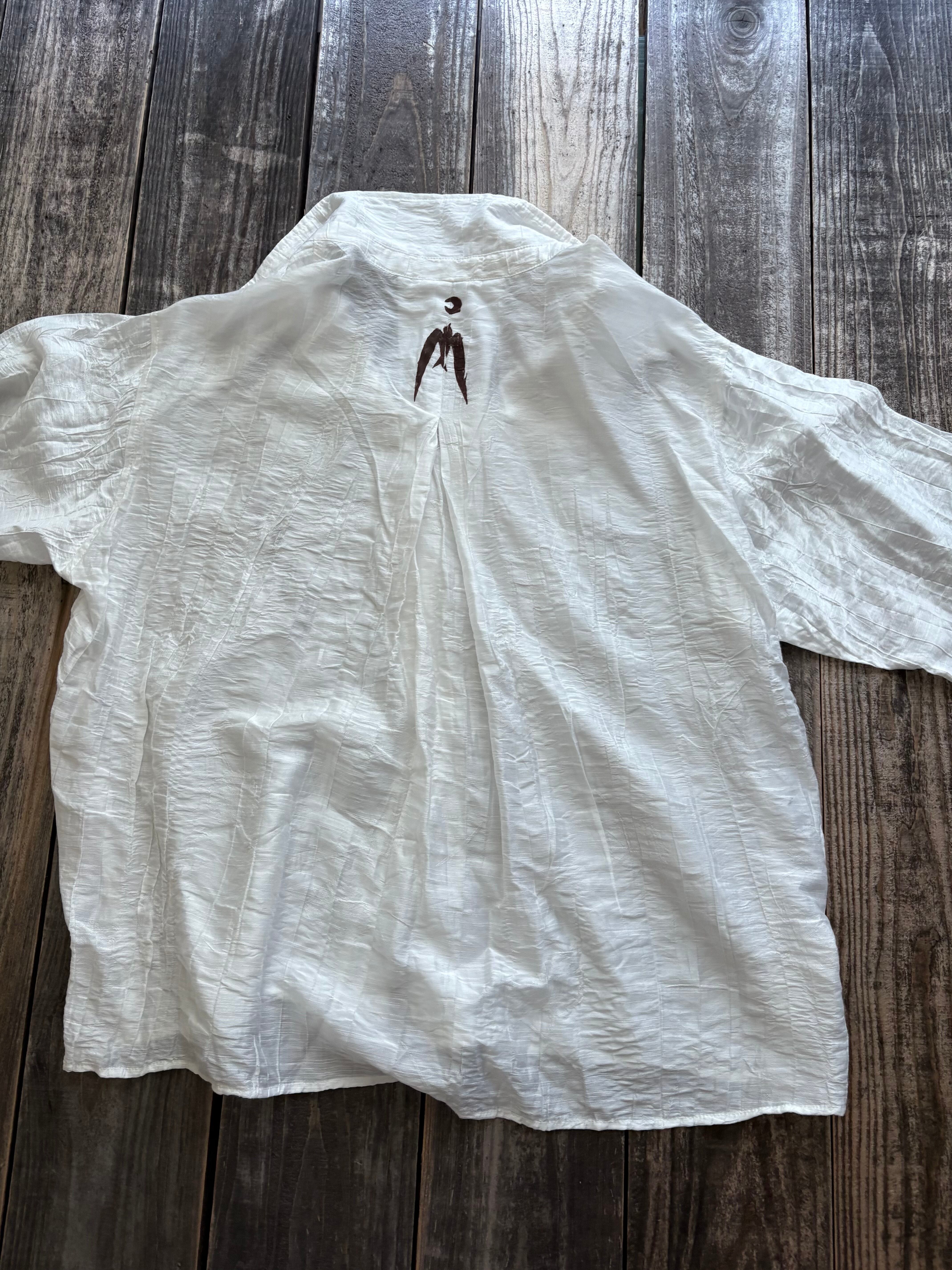 うっすら花の刺繍が全体にされてます。シワ加工あり。ゆったりめのシャツになります。