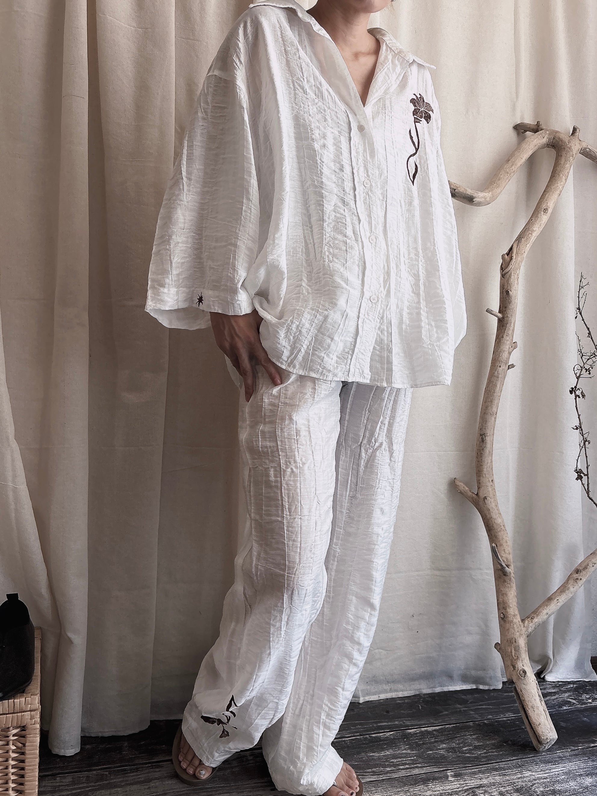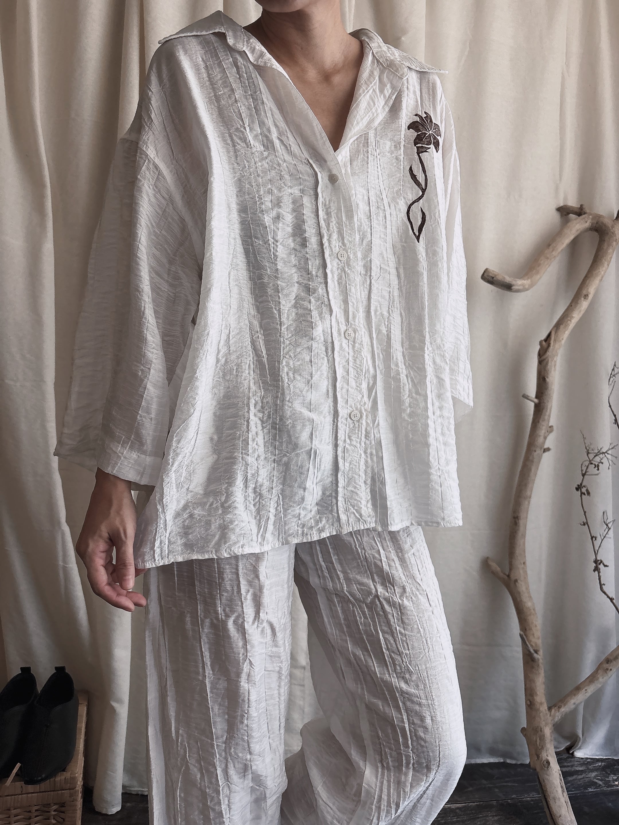 うっすら花の刺繍が全体にされてます。シワ加工あり。ゆったりめのシャツになります。
