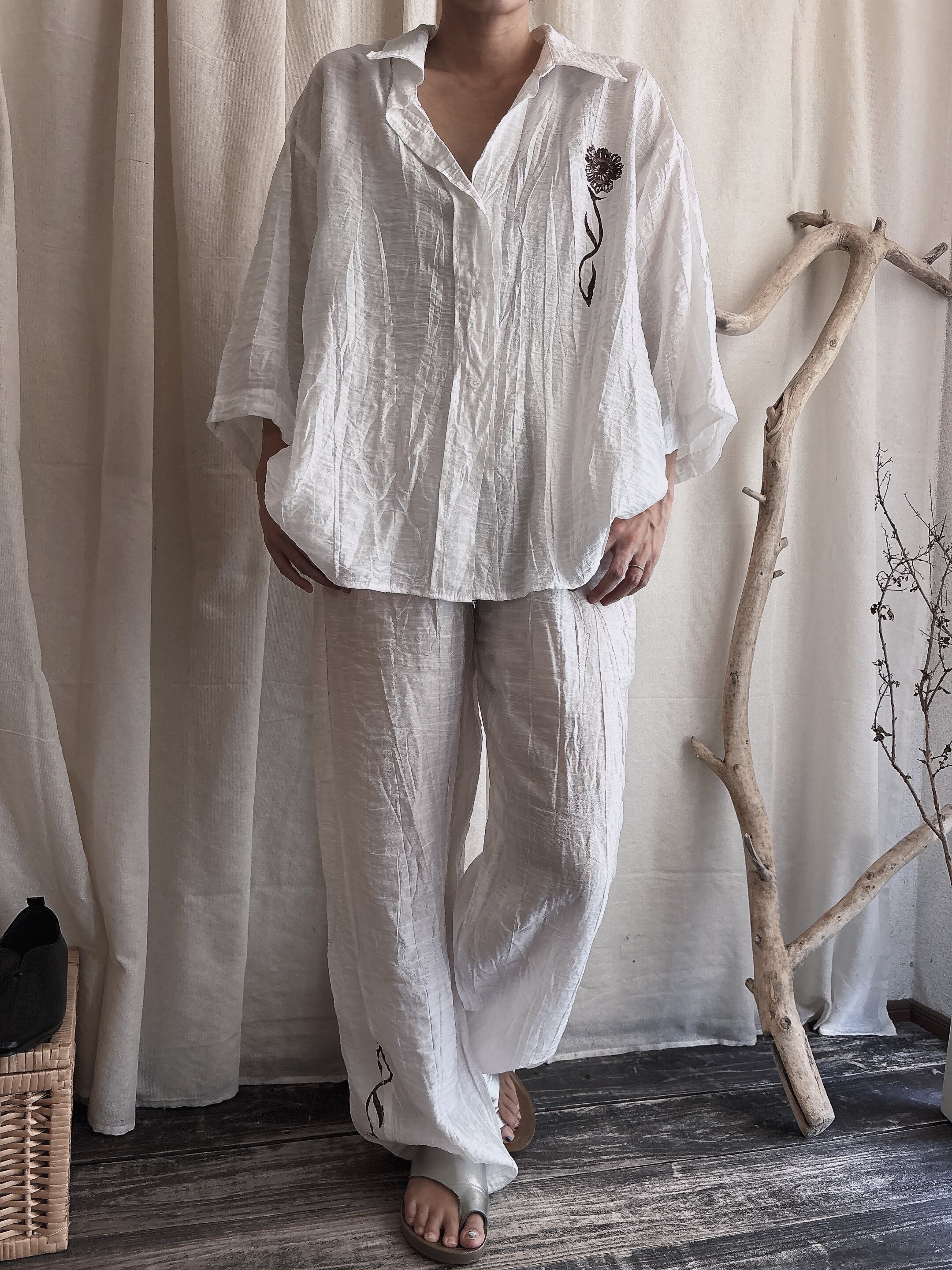 うっすら花の刺繍が全体にされてます。シワ加工あり。ゆったりめのシャツになります。