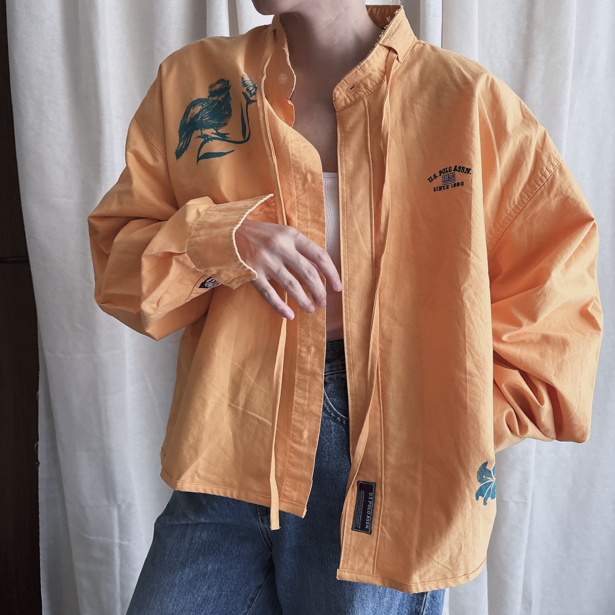 POLO古着をリメイクした作品に沖縄をモチーフに手彫りで彫った版画で一つ一つ服にプリントしています⁎ˇ◡ˇ⁎
