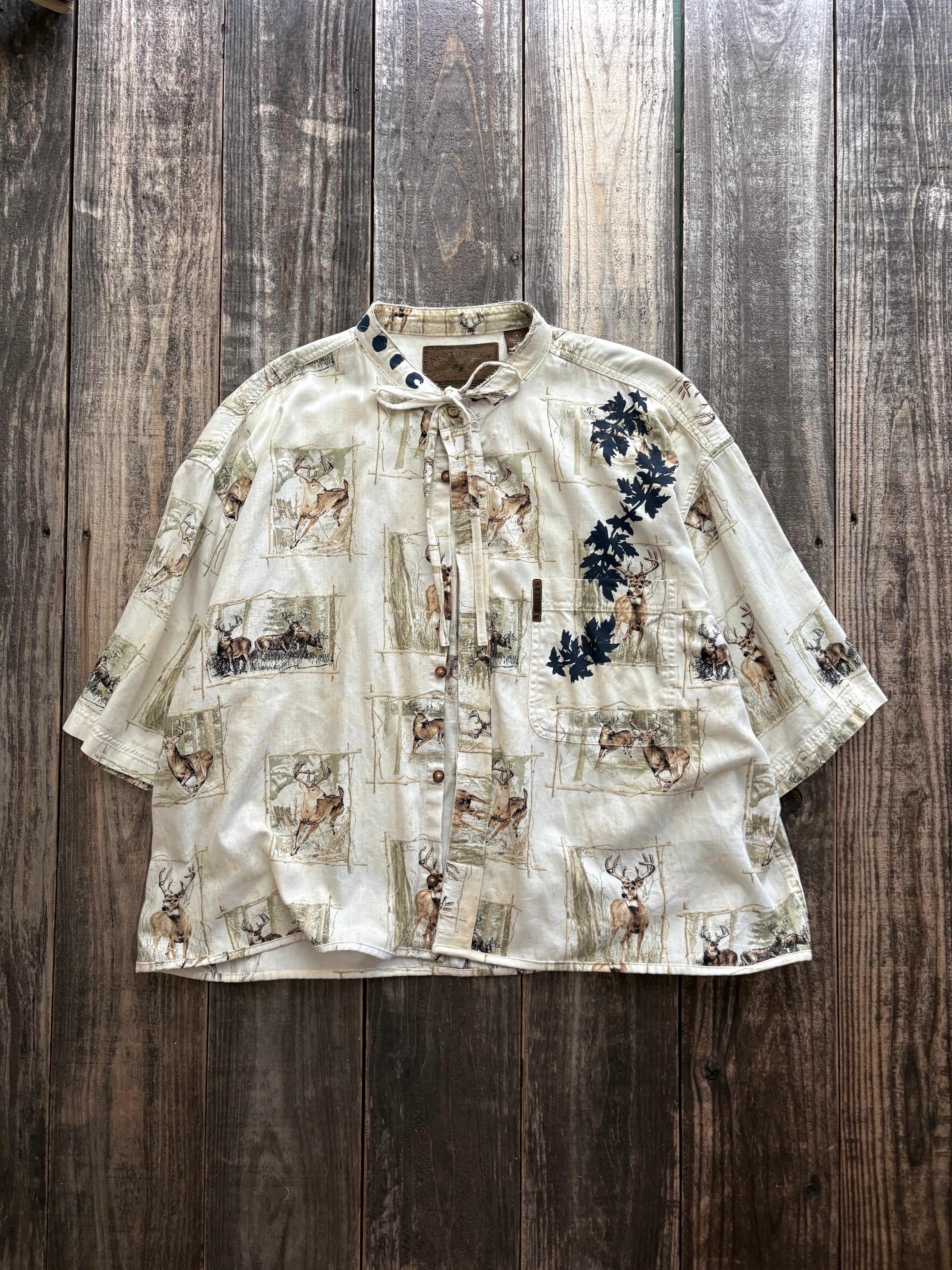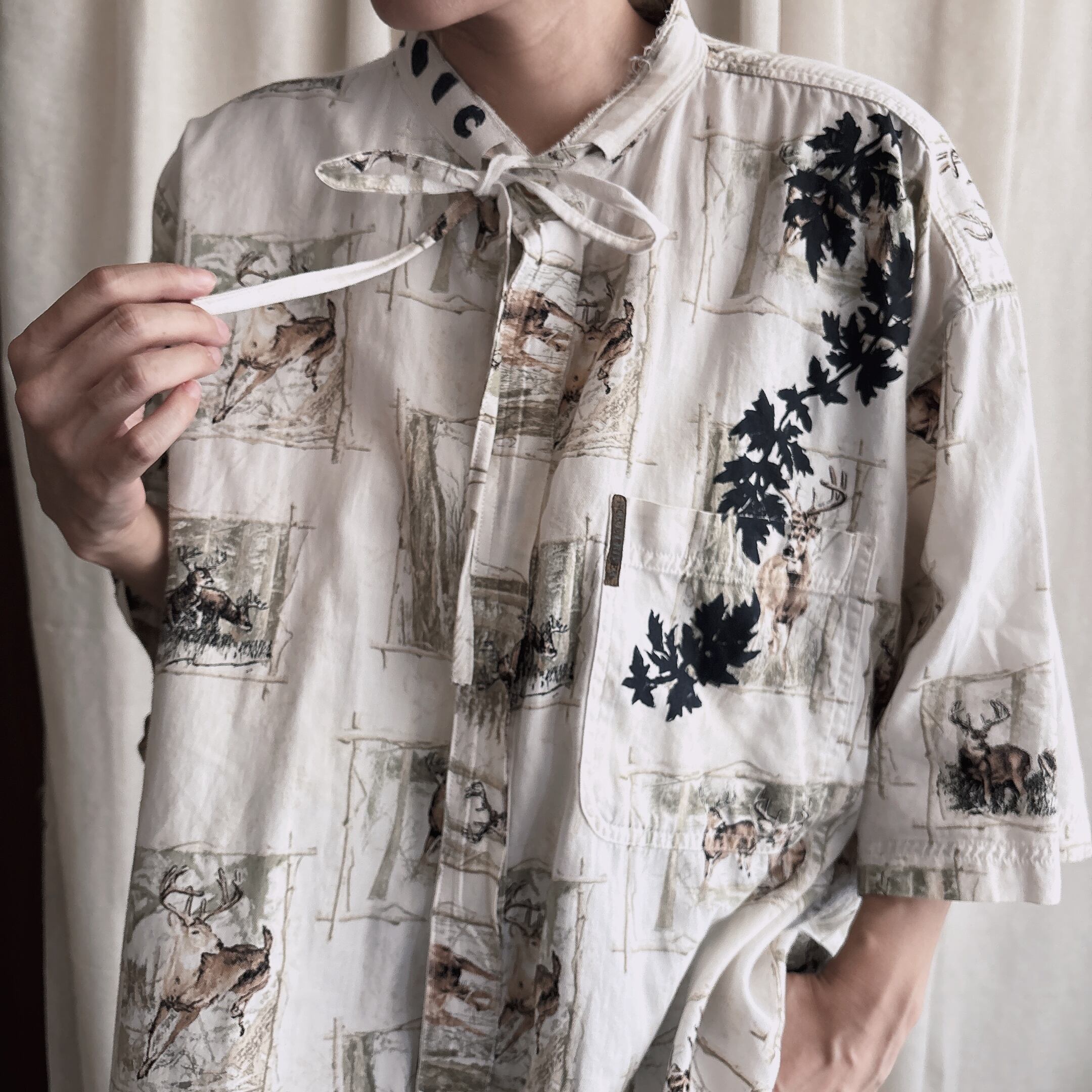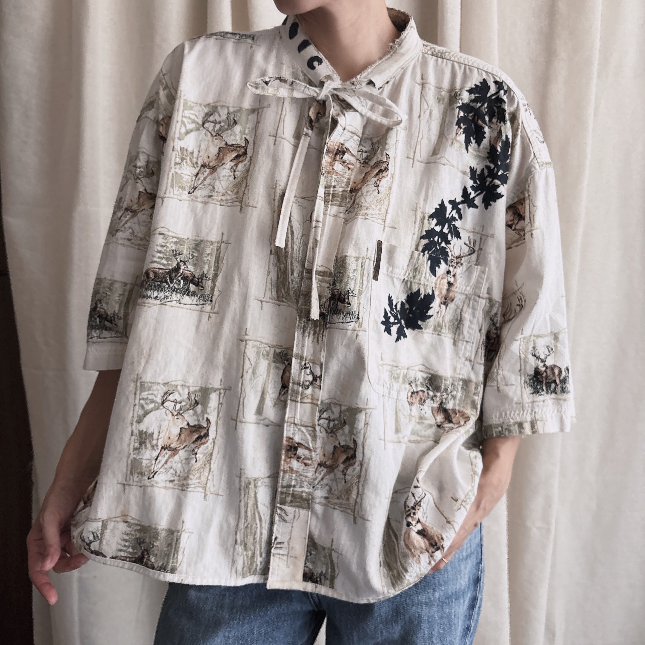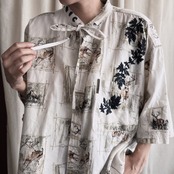 古着をリメイクしたボディに沖縄にちなんだ物を手彫りの版画で一つ一つプリントされてます。