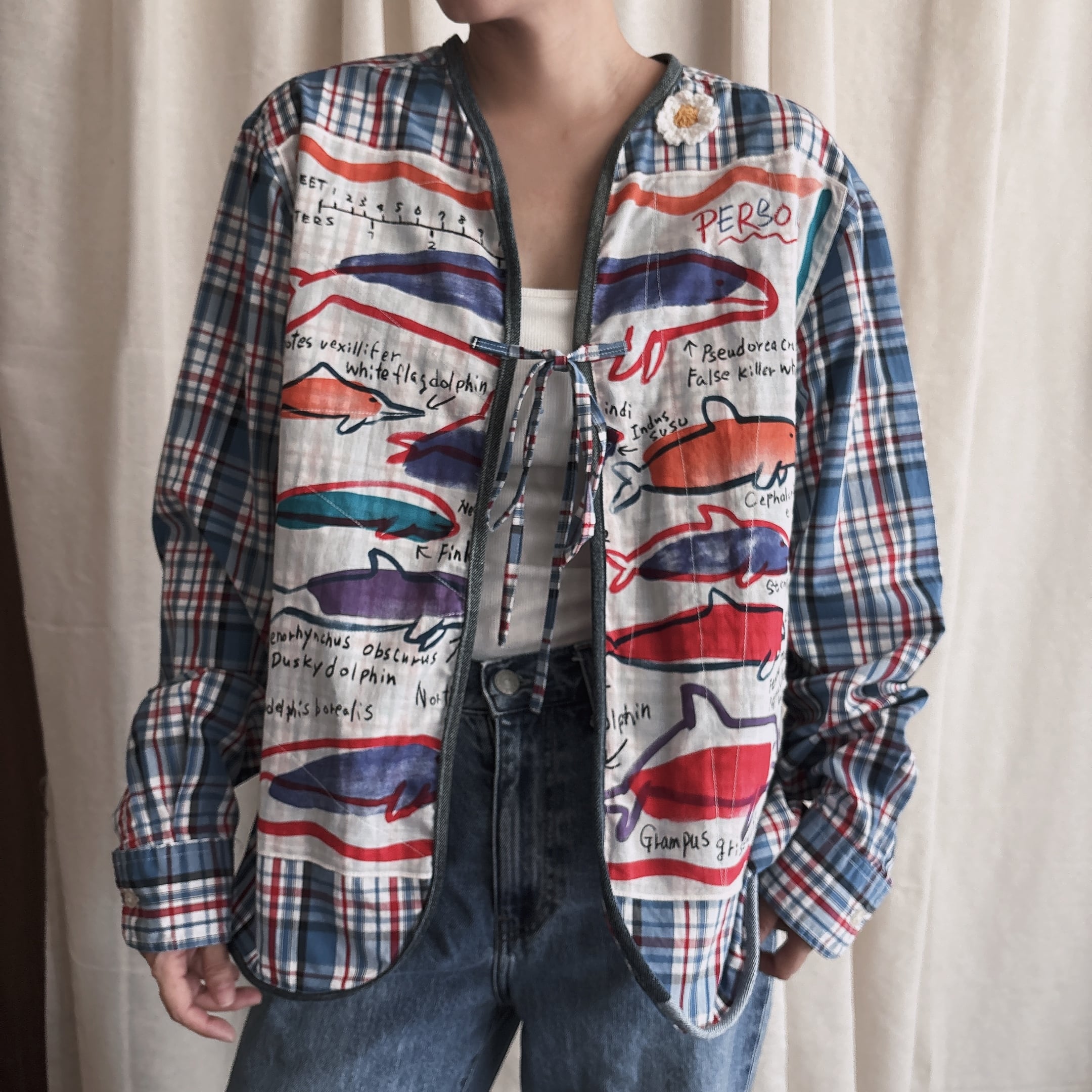 古着をリメイクした作品に沖縄をモチーフに手彫りで彫った版画で一つ一つ服にプリントしています⁎ˇ◡ˇ⁎