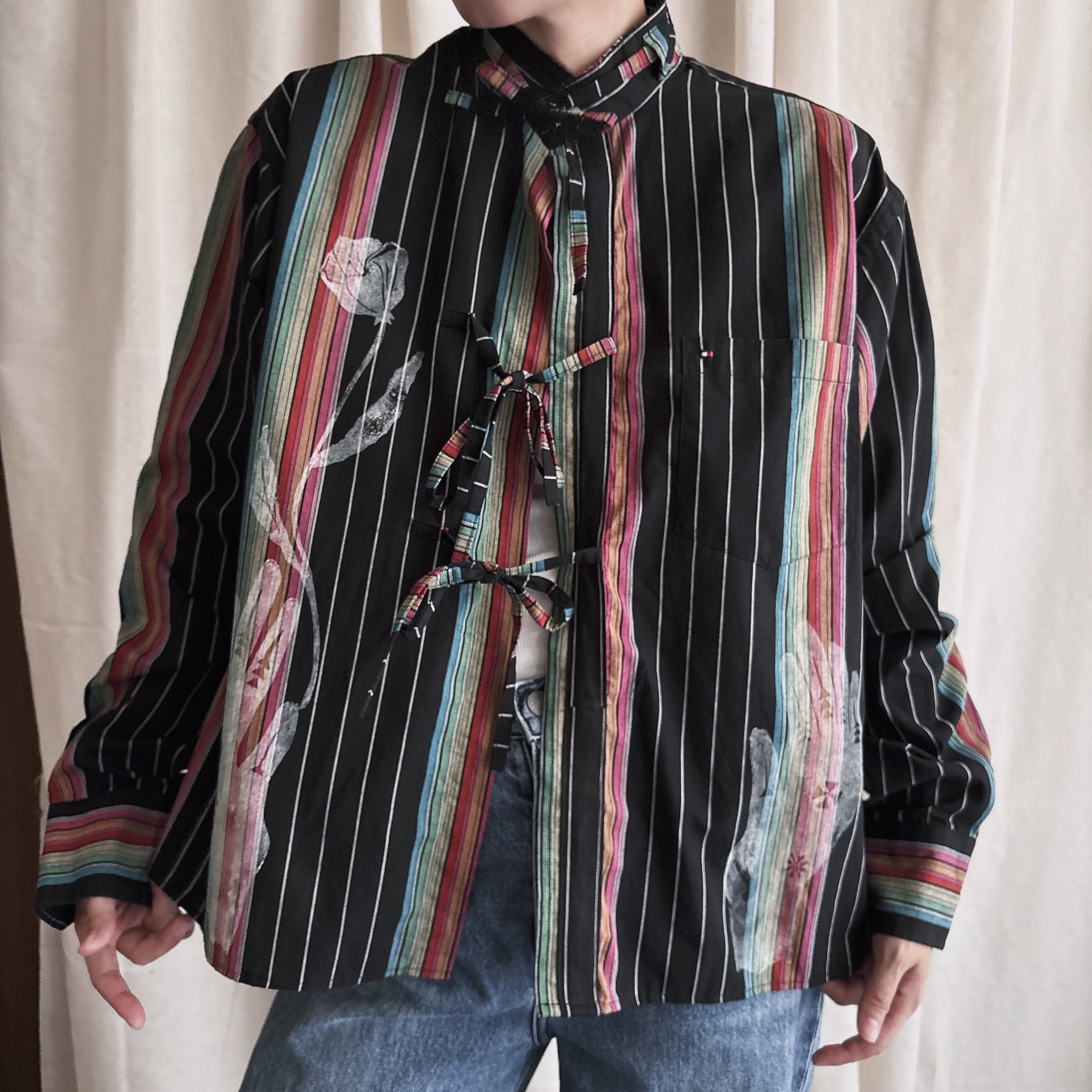 古着をリメイクしたボディに沖縄にちなんだ物を手彫りの版画で一つ一つプリントされてます。